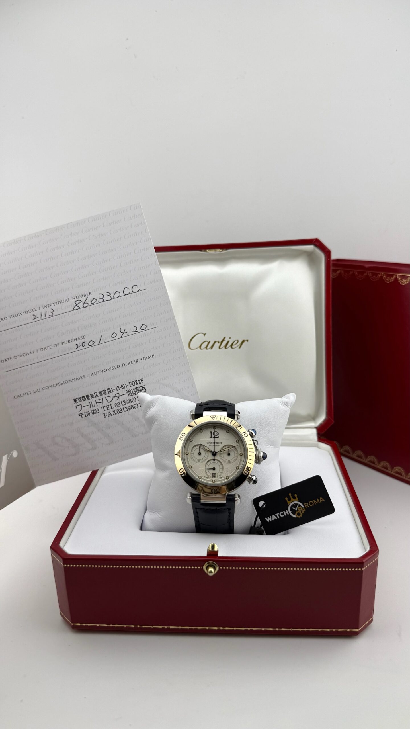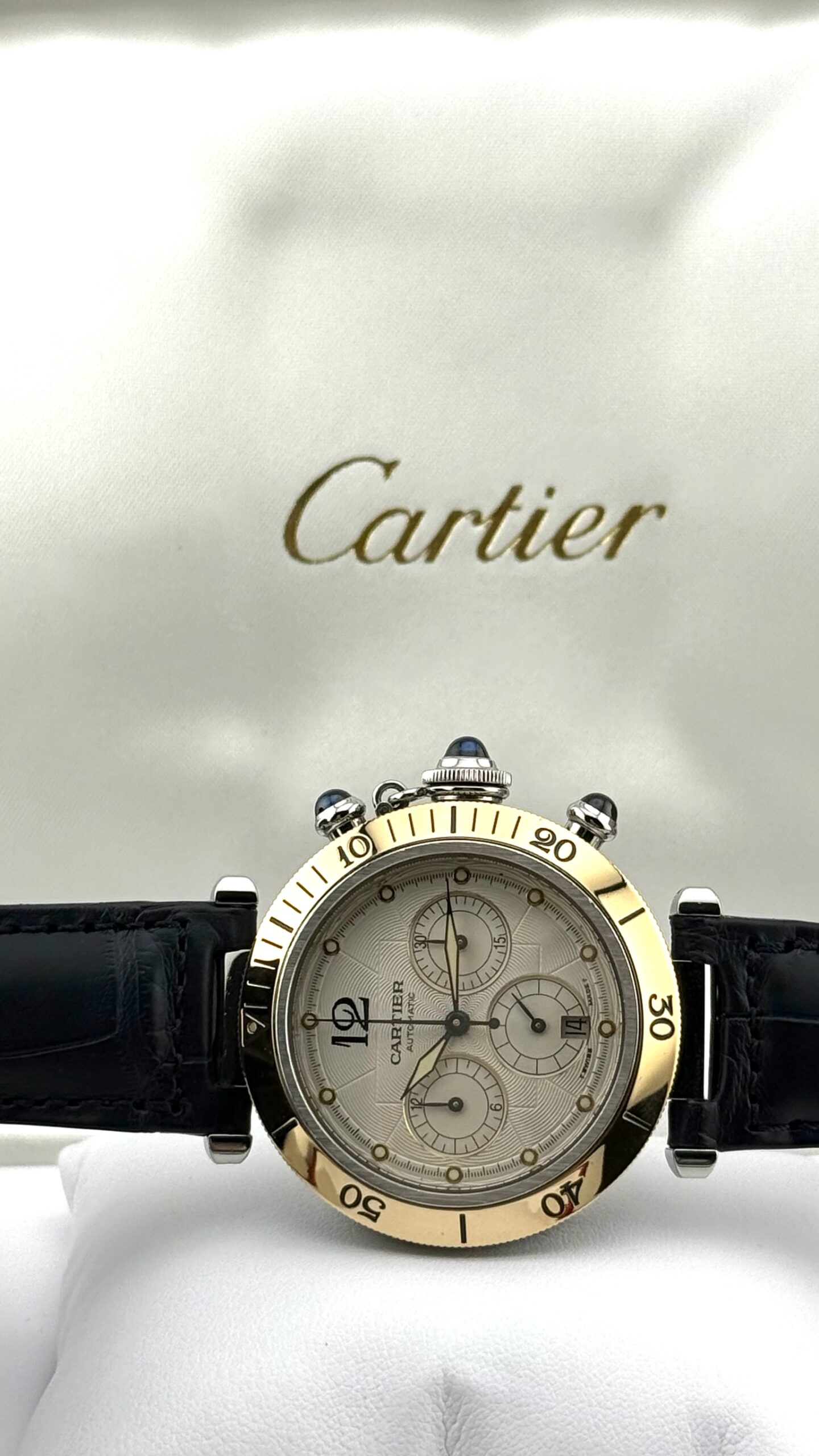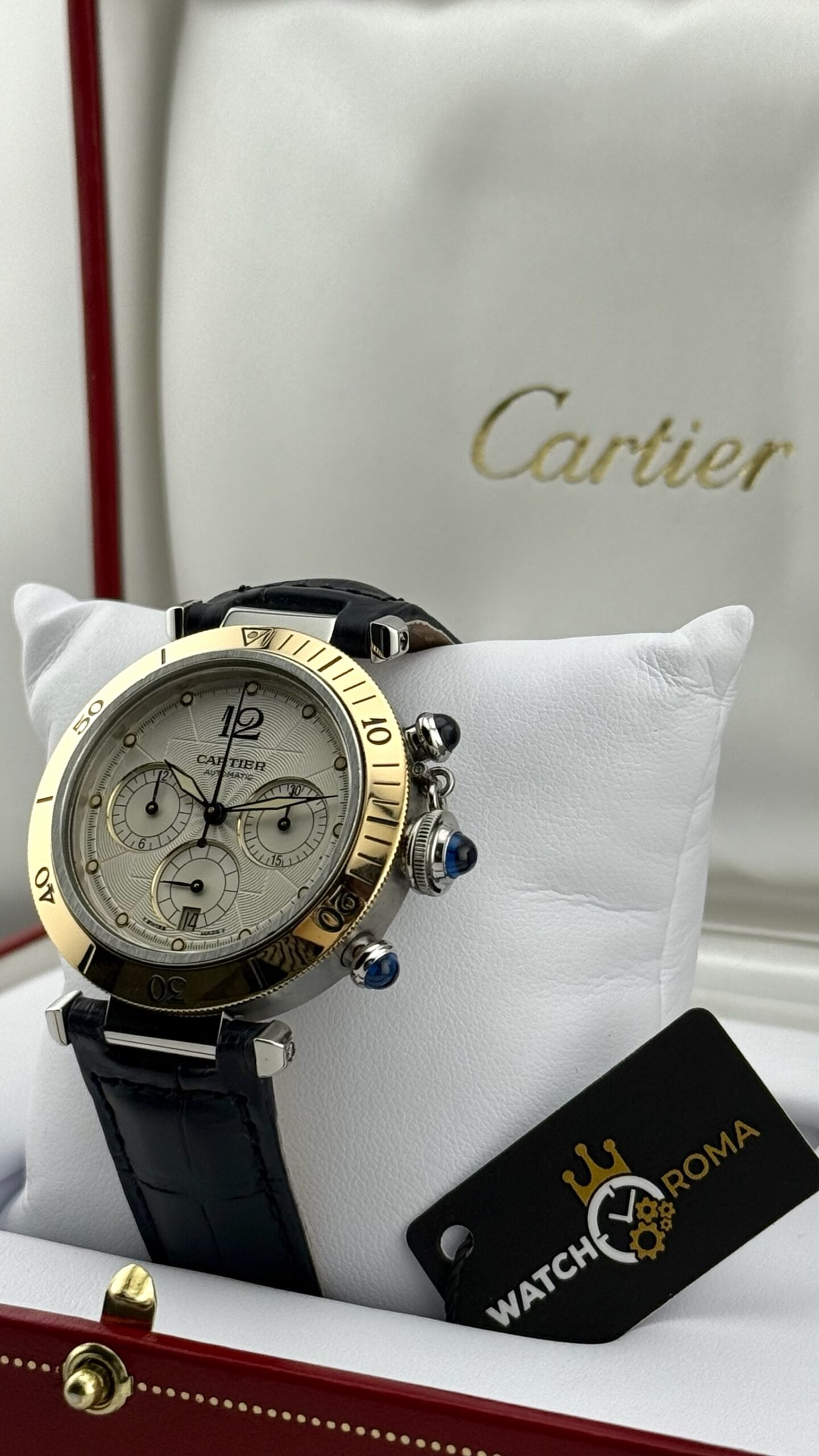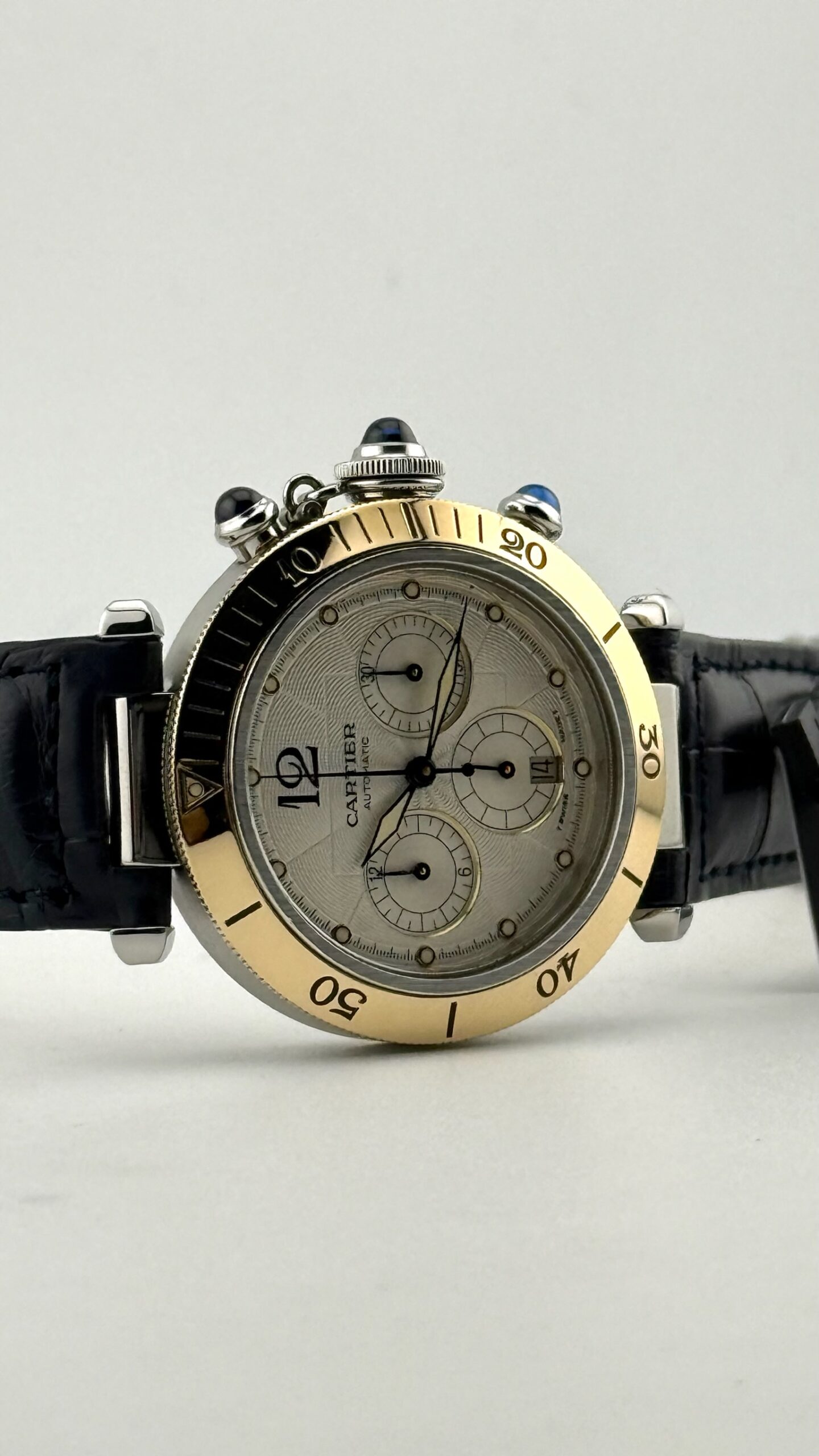 Questo esemplare è un magnifico Cartier Pasha Chronograph (Ref. 2113), un orologio che fonde l’eleganza classica della Maison con un carattere sportivo e audace. Creato originariamente per il Pascià di Marrakech che desiderava un orologio impermeabile per le sue nuotate, il Pasha è diventato negli anni un’icona di lusso e distinzione.