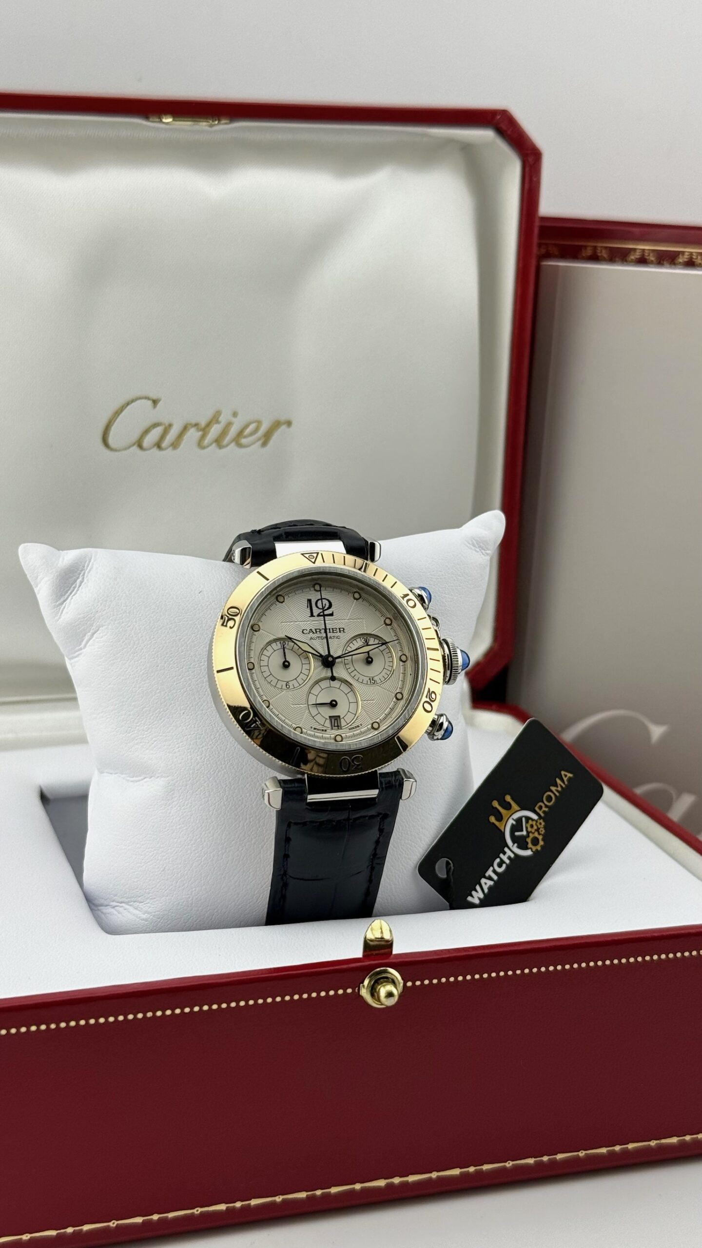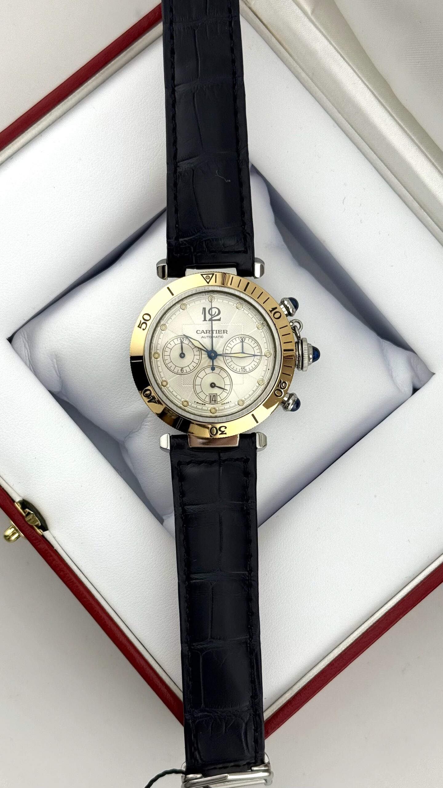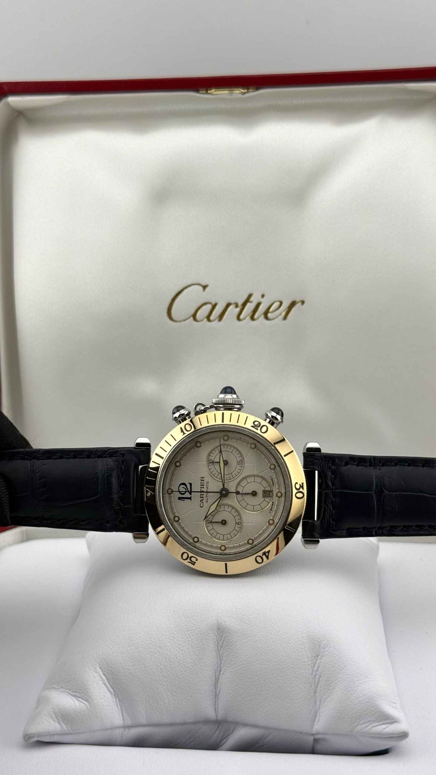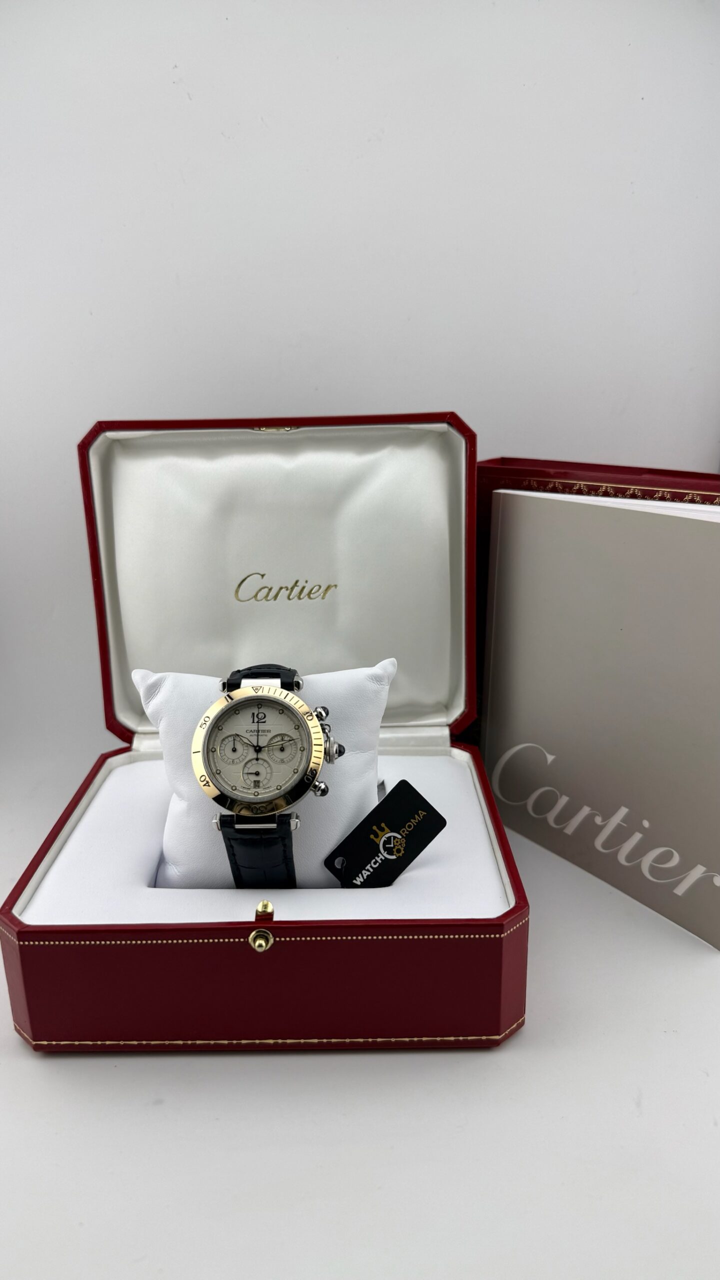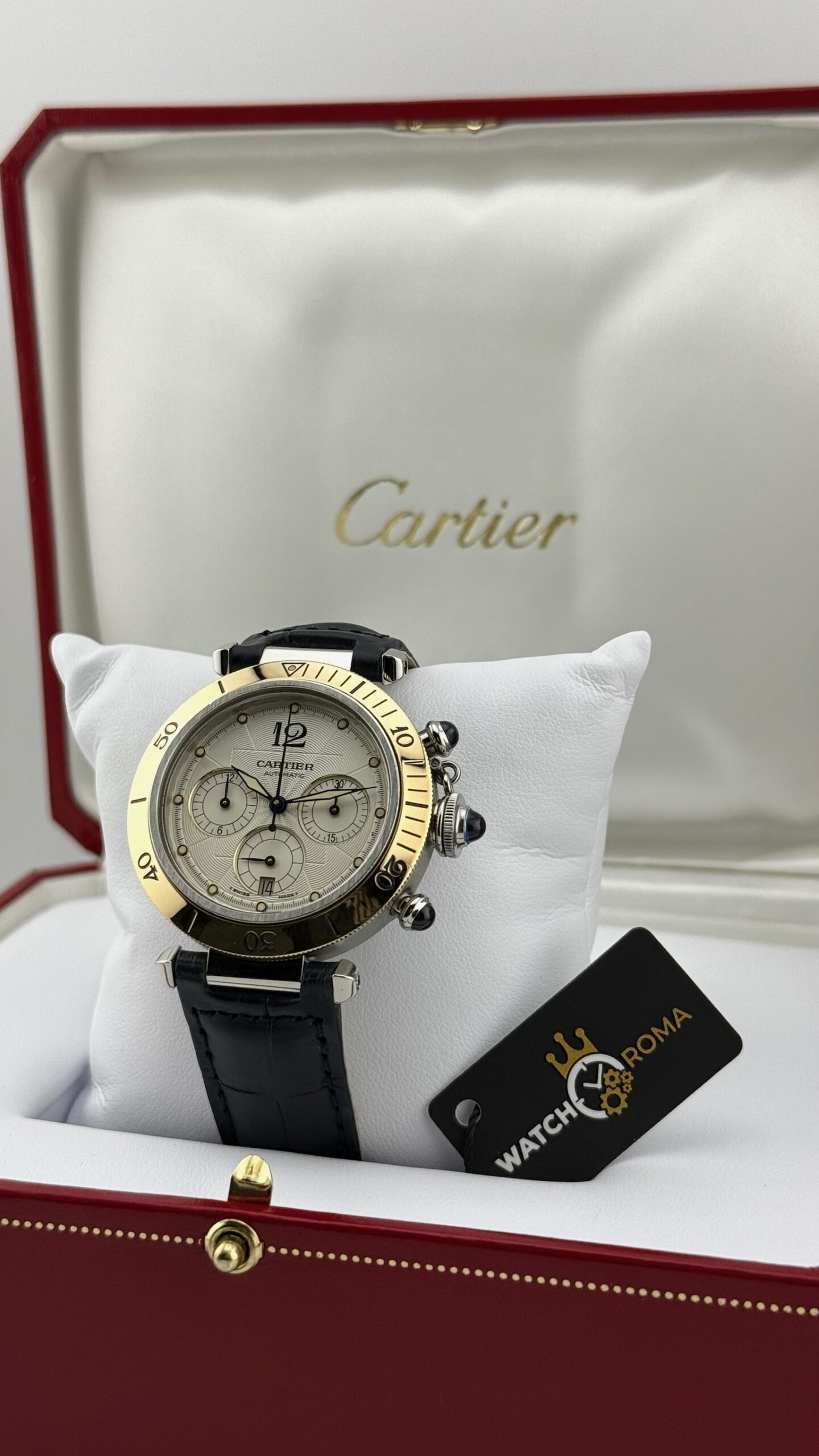 Questo esemplare è un magnifico Cartier Pasha Chronograph (Ref. 2113), un orologio che fonde l’eleganza classica della Maison con un carattere sportivo e audace. Creato originariamente per il Pascià di Marrakech che desiderava un orologio impermeabile per le sue nuotate, il Pasha è diventato negli anni un’icona di lusso e distinzione.