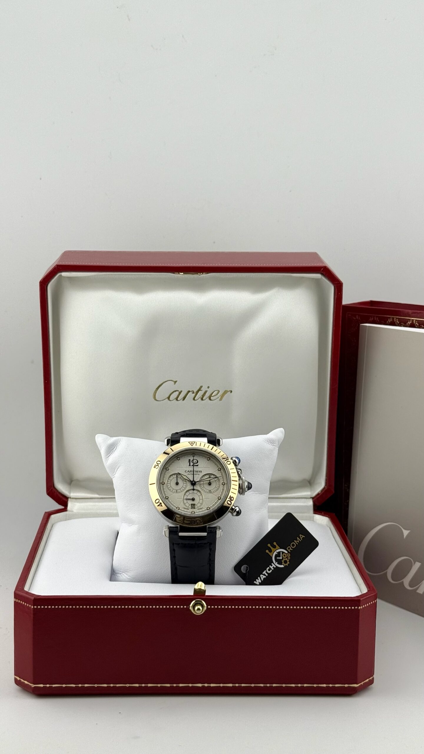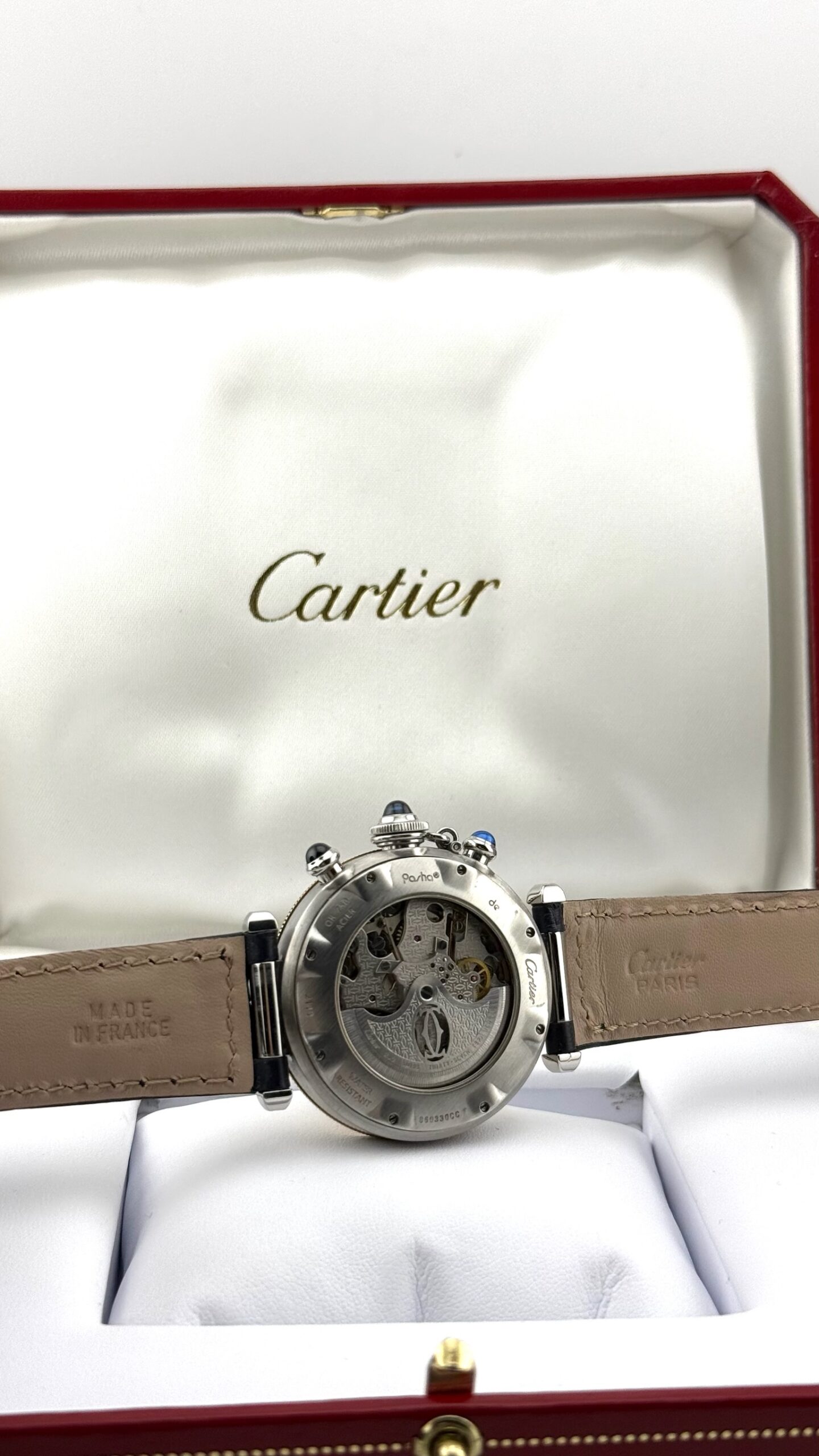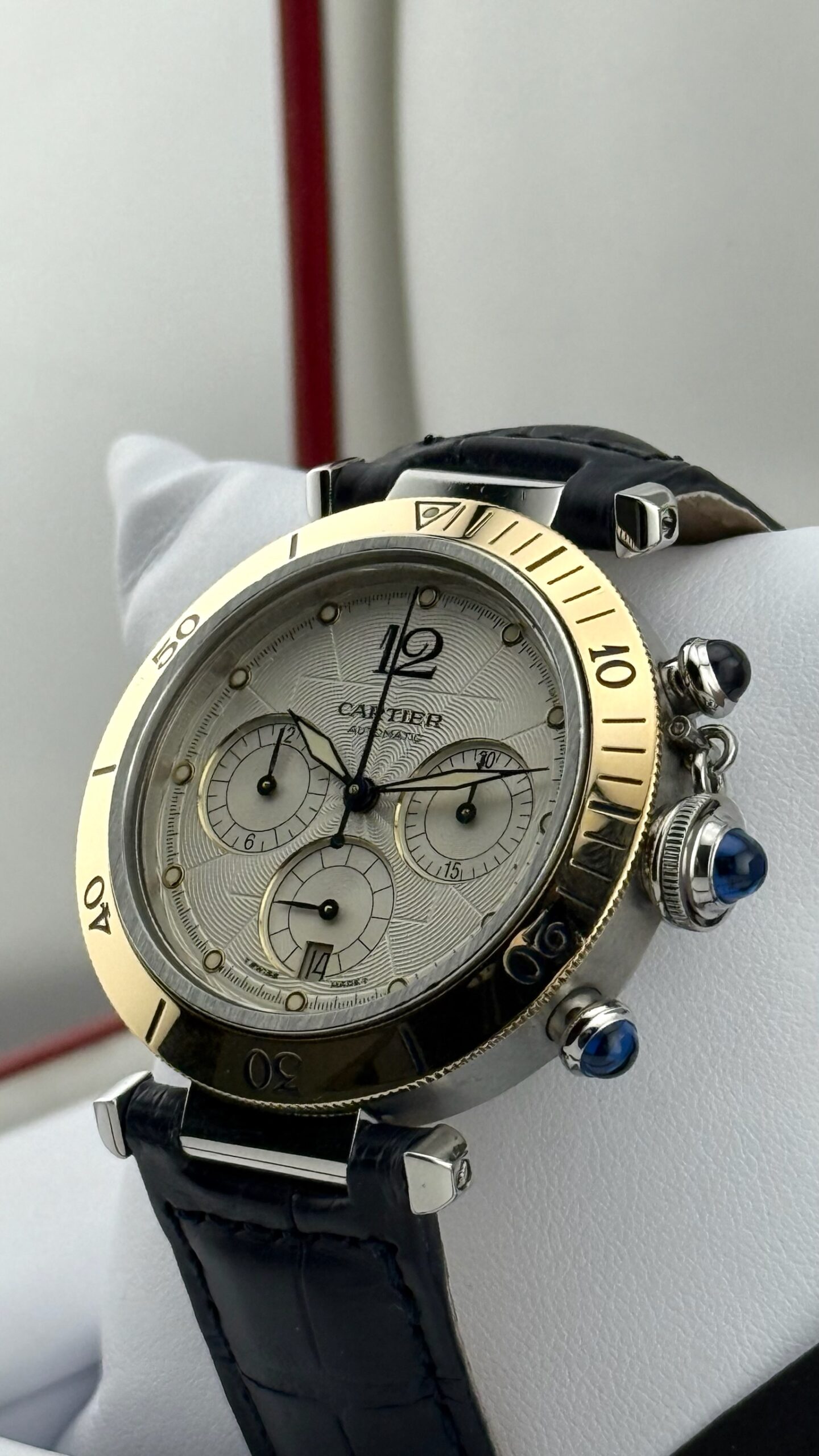 A differenza delle versioni solo tempo, questo Pasha è animato da un movimento meccanico a carica automatica ad alte prestazioni (Calibro Cartier 205). Le complicazioni includono le funzioni cronografiche (ore, minuti e secondi continui) e una discreta finestra per la data posizionata tra le ore 4 e le 5.