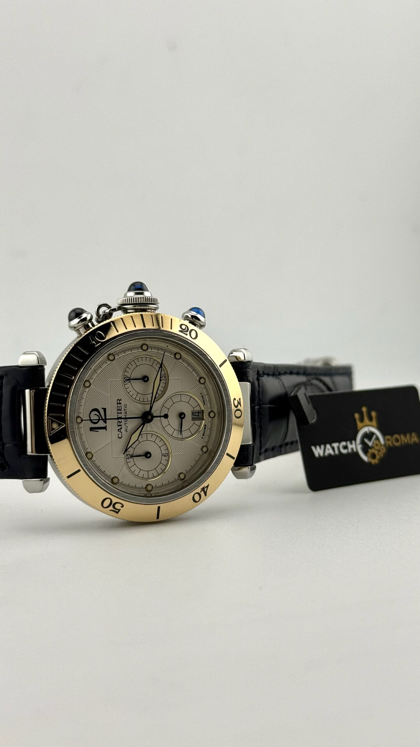 Il Cartier Pasha si riconosce immediatamente per la sua cassa rotonda imponente e le caratteristiche anse a “Vandôme”. Questo modello cronografo eleva il design originale aggiungendo una lunetta girevole graduata in oro giallo 18 carati, che crea un contrasto cromatico spettacolare con l’acciaio lucido della cassa.