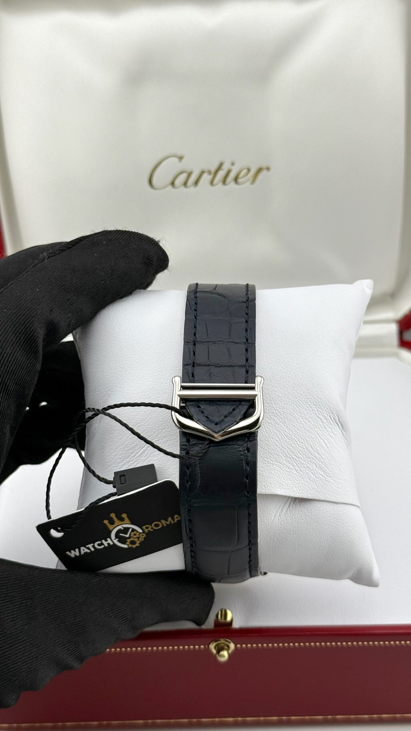 Il quadrante argenté è lavorato con una raffinata finitura guilloché, che emana raggi dal centro verso l’esterno, donando profondità e movimento. I tre contatori cronografici sono disposti armoniosamente, mentre l’unico numero arabo sovradimensionato (il 12) e le lancette a forma di losanga in acciaio azzurrato conferiscono il tipico tocco “Cartier”. Il dettaglio più iconico rimane il copri-corona a vite, collegato alla cassa da una piccola catenella e impreziosito da uno zaffiro cabochon blu.