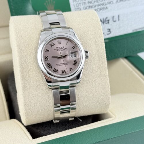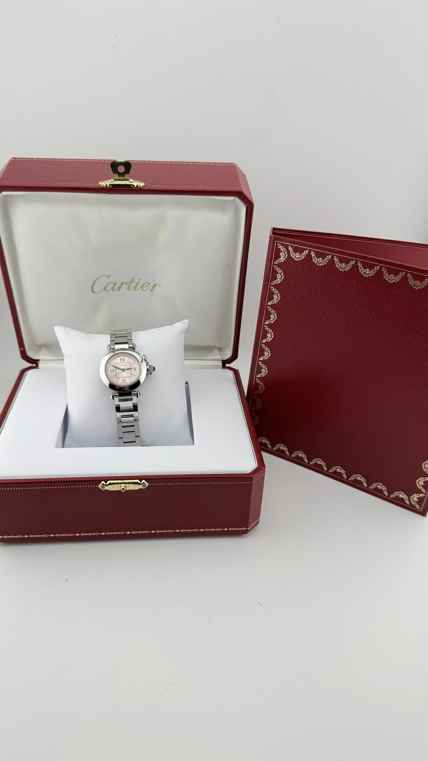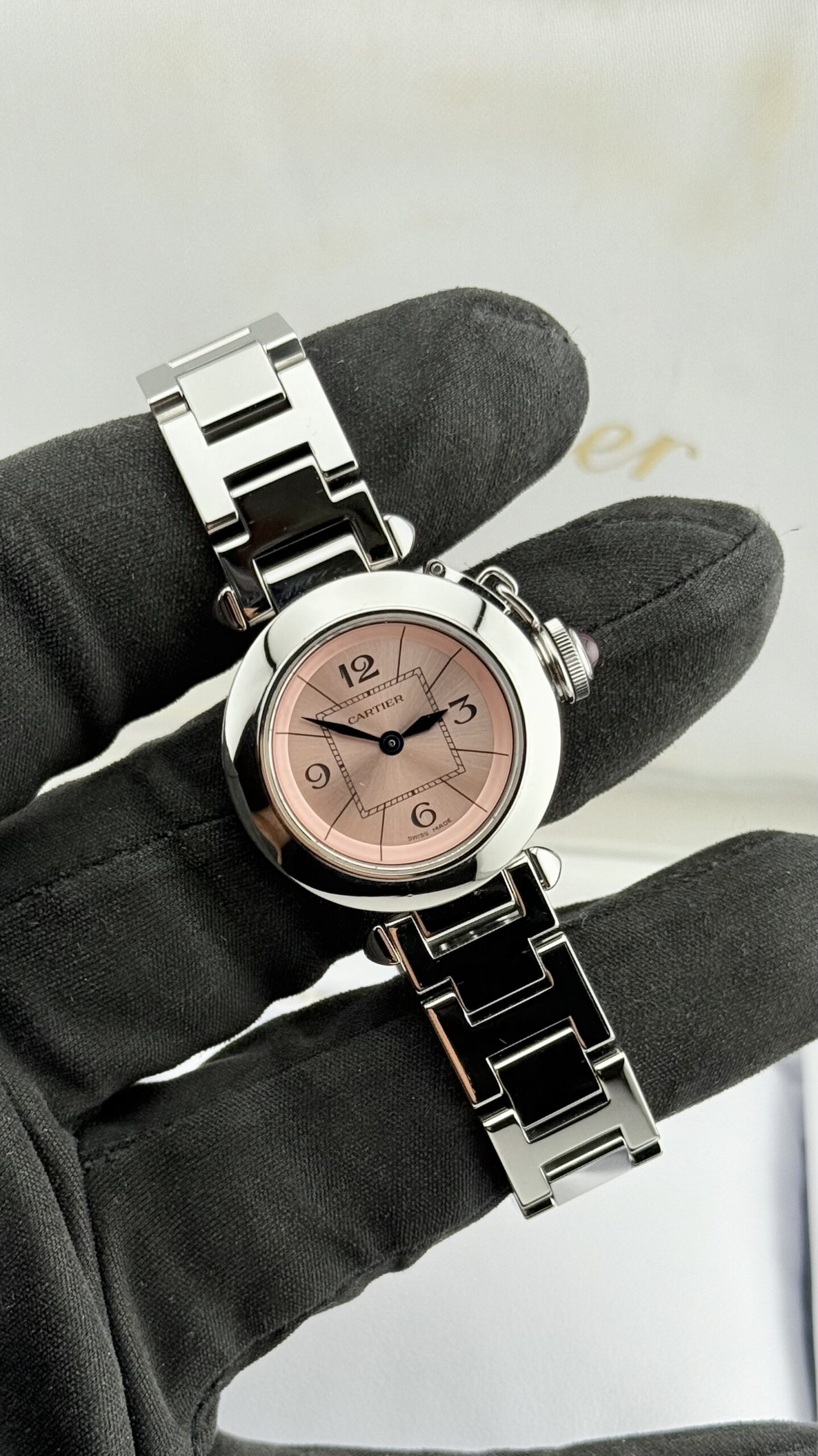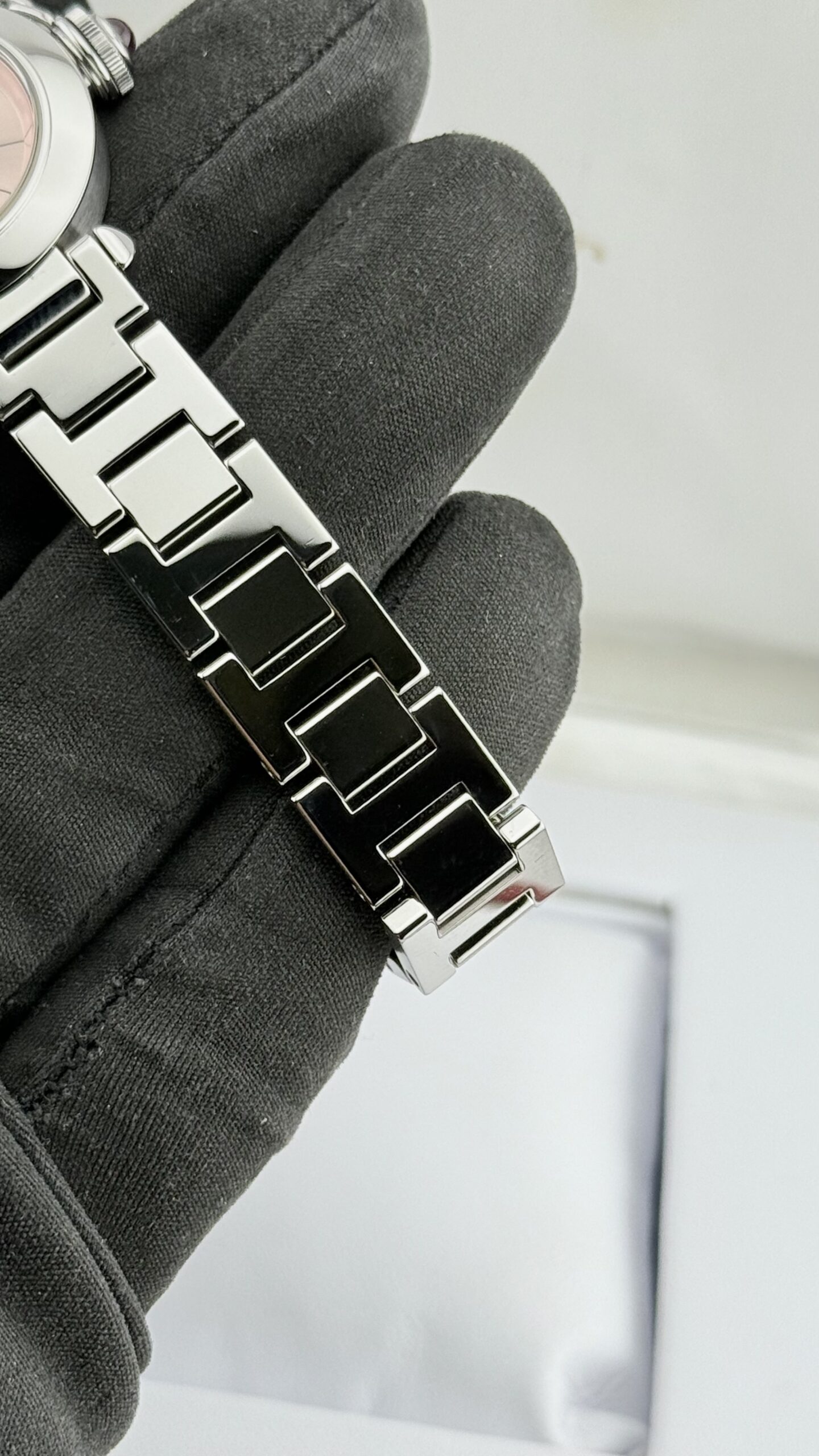 Il Cartier Pasha ref. 2973 riprende i codici più distintivi della collezione: cassa rotonda con anse “Vendôme”, corona a vite protetta da cappuccio con cabochon pink e quadrante pulito con numeri arabi a forte leggibilità. Il vetro zaffiro garantisce resistenza ai graffi.Con il suo profilo raffinato e il bracciale/cinturino di qualità, è un orologio trasversale, perfetto dall’ufficio al weekend.