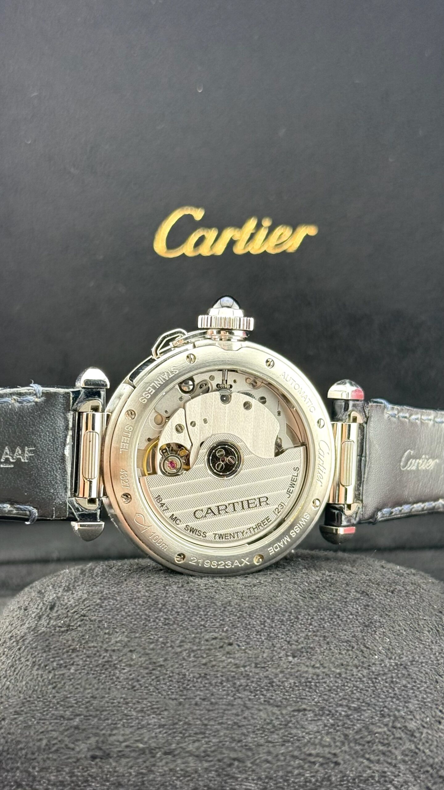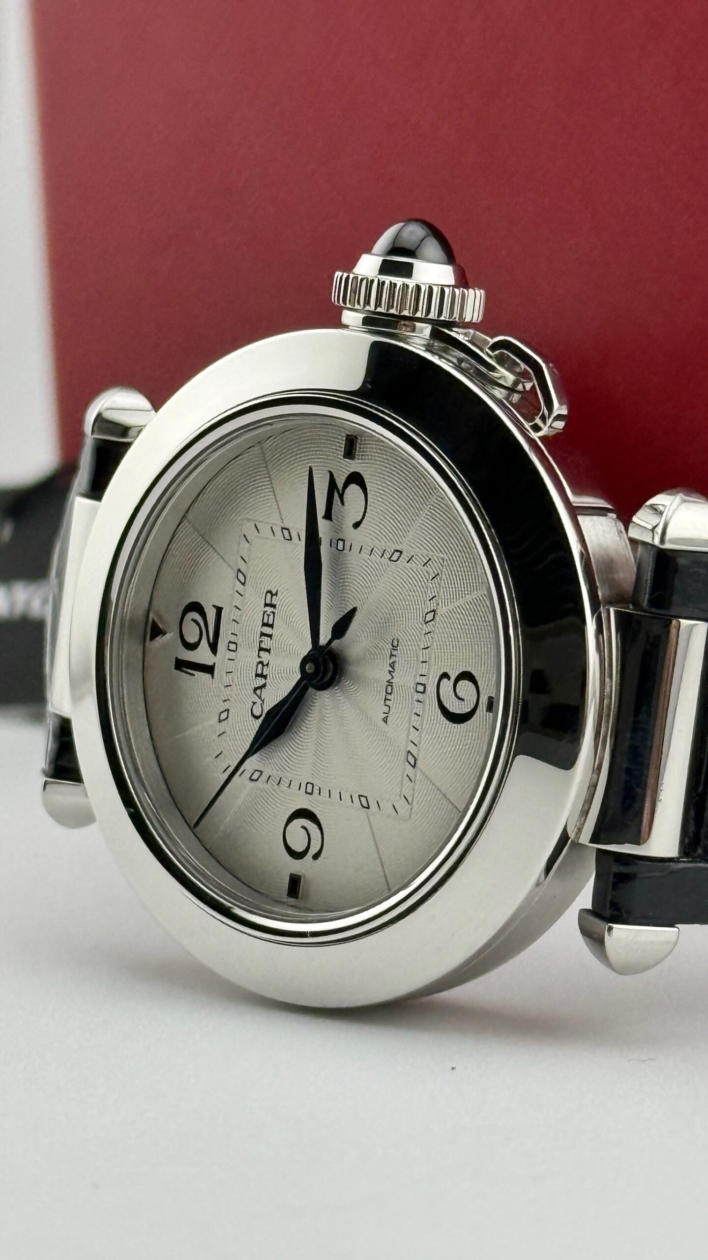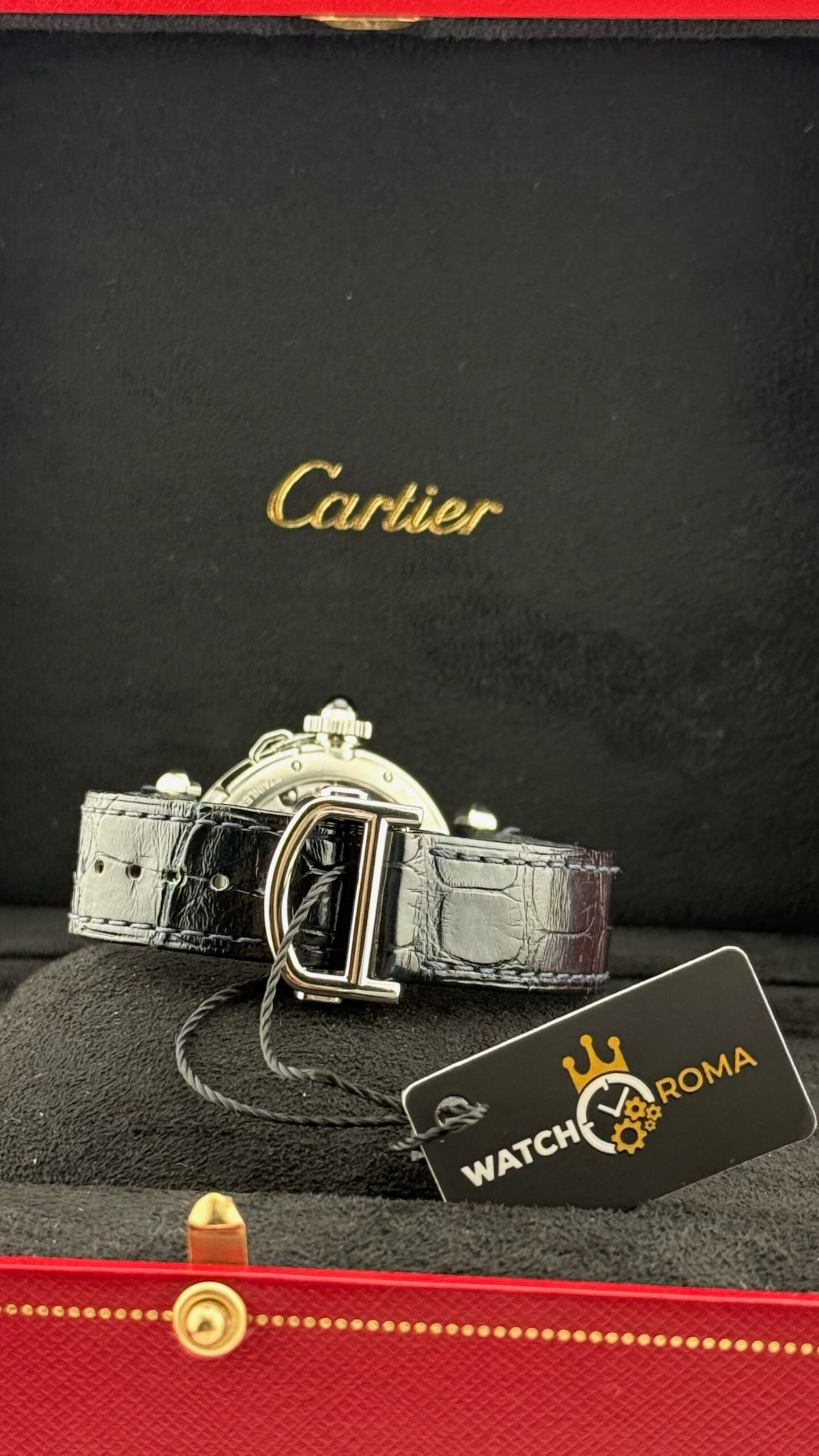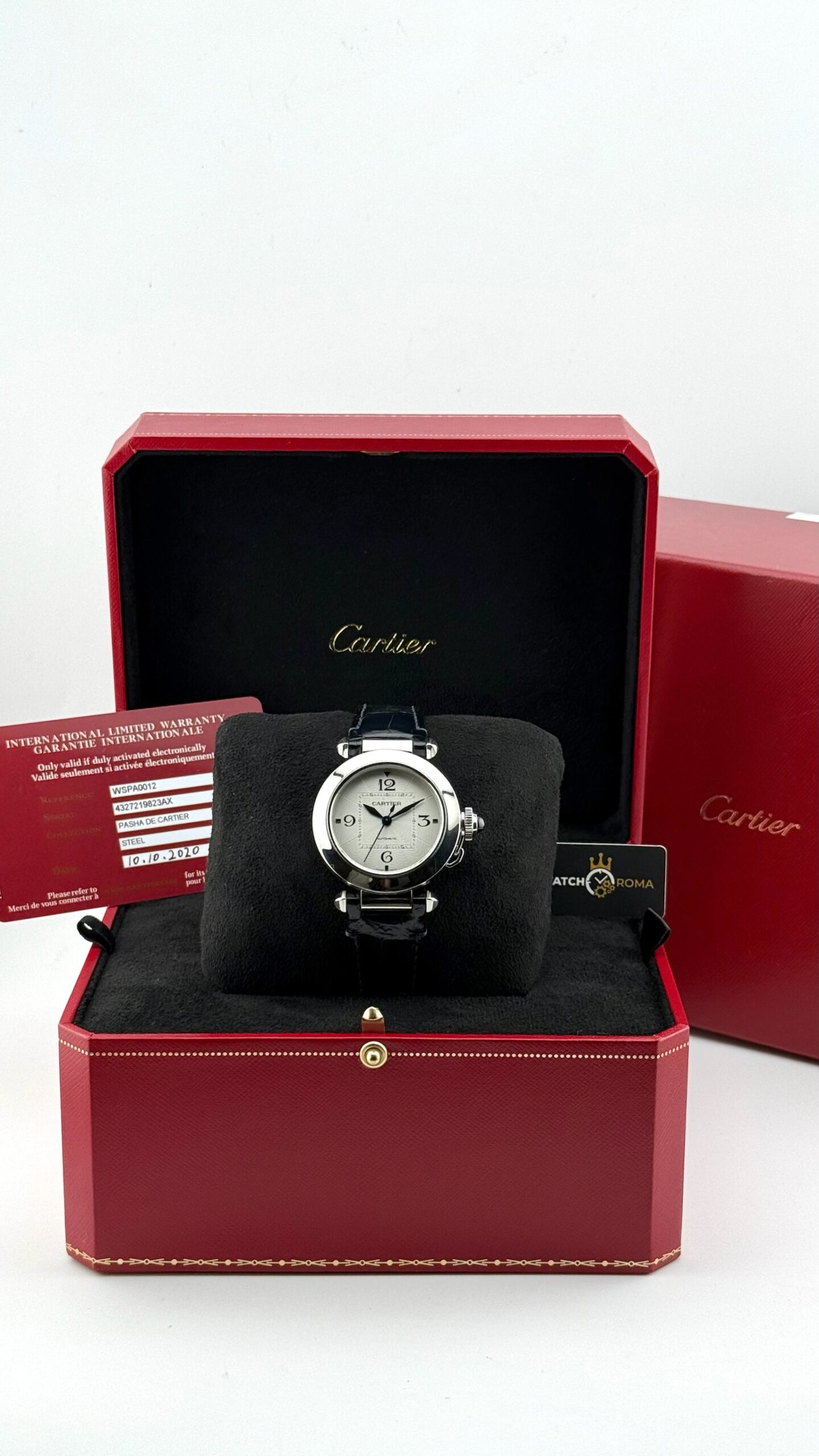 L’orologio ritratto è un Pasha de Cartier, una delle collezioni più iconiche della Maison parigina. Questa versione specifica (Referenza WSPA0012) rappresenta il rilancio moderno della linea, mantenendo tutti i codici estetici che l’hanno resa celebre sin dagli anni ’80, ma con una meccanica aggiornata.