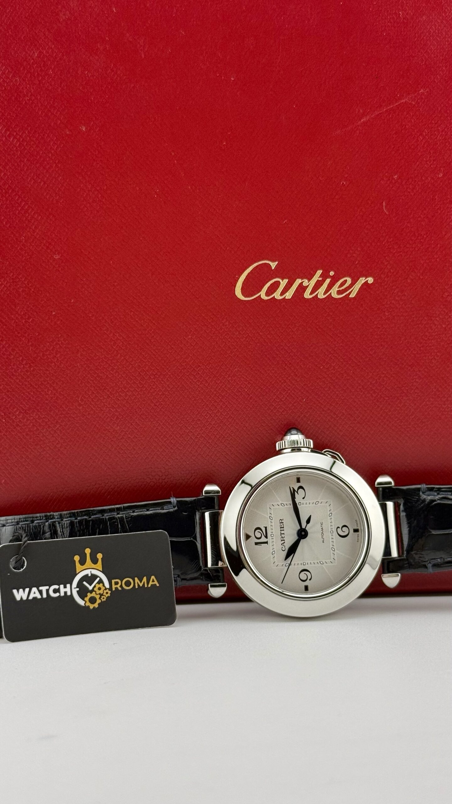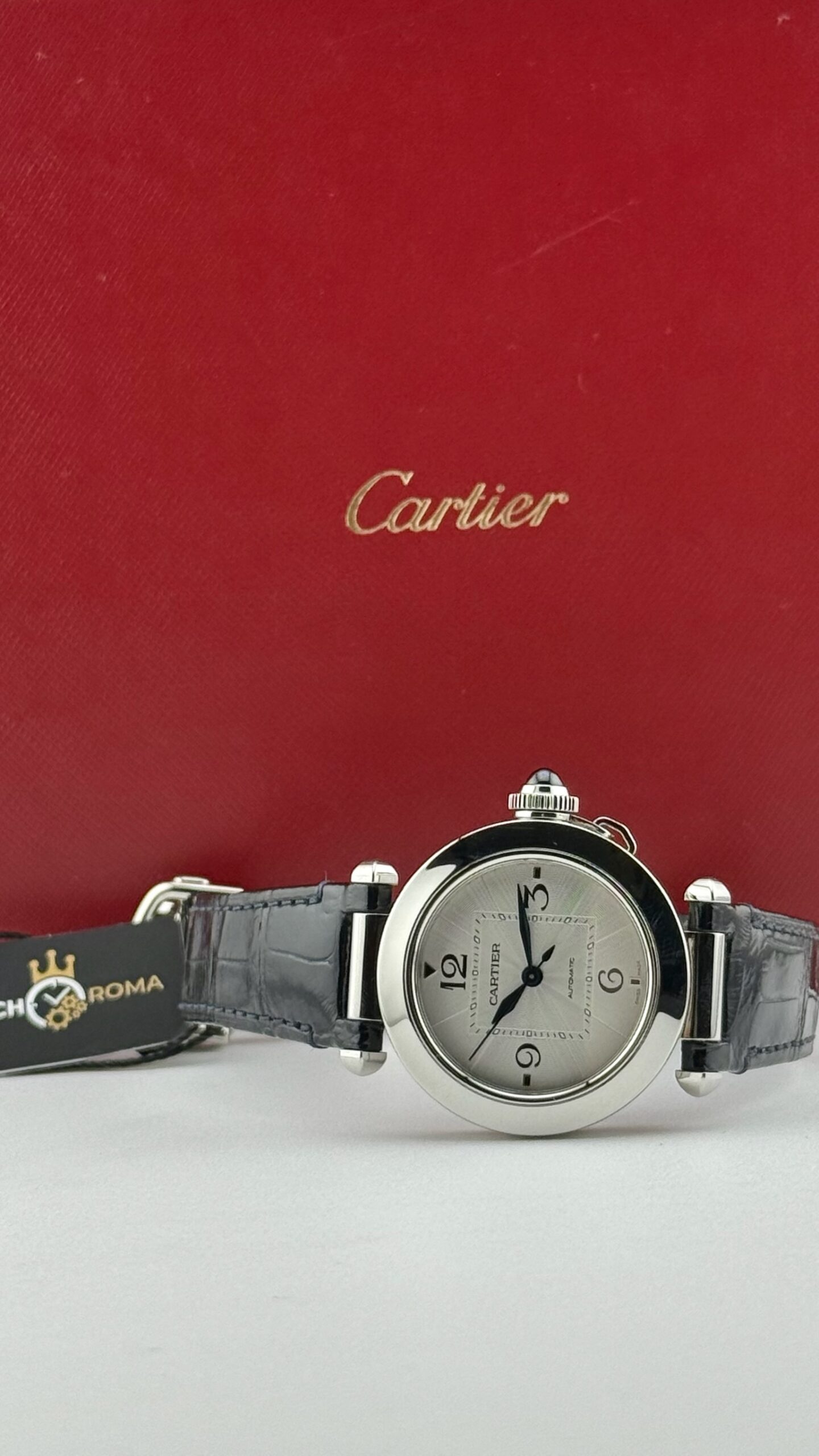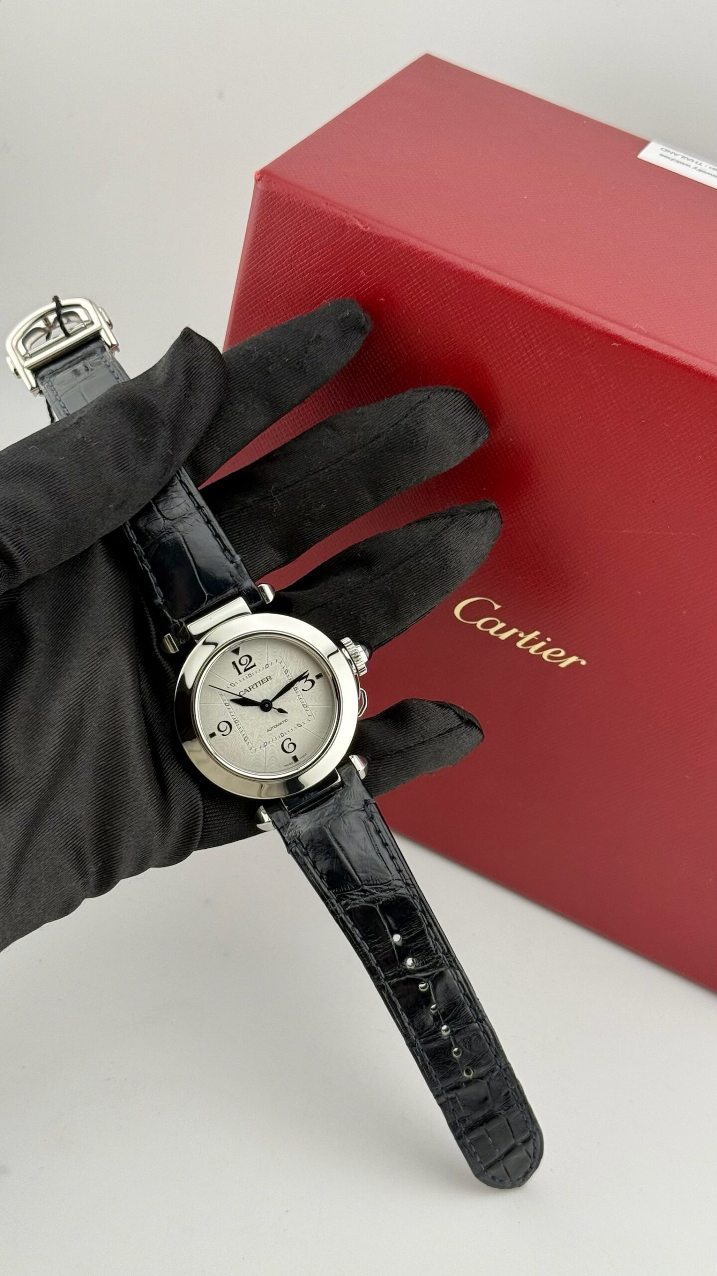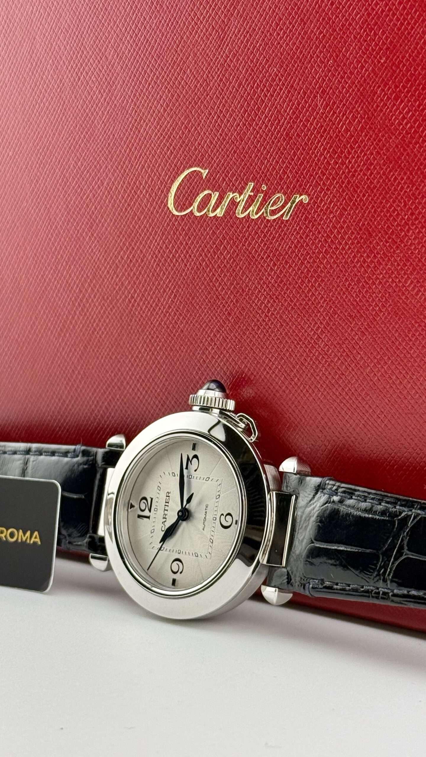 L’orologio ritratto è un Pasha de Cartier, una delle collezioni più iconiche della Maison parigina. Questa versione specifica (Referenza WSPA0012) rappresenta il rilancio moderno della linea, mantenendo tutti i codici estetici che l’hanno resa celebre sin dagli anni ’80, ma con una meccanica aggiornata.