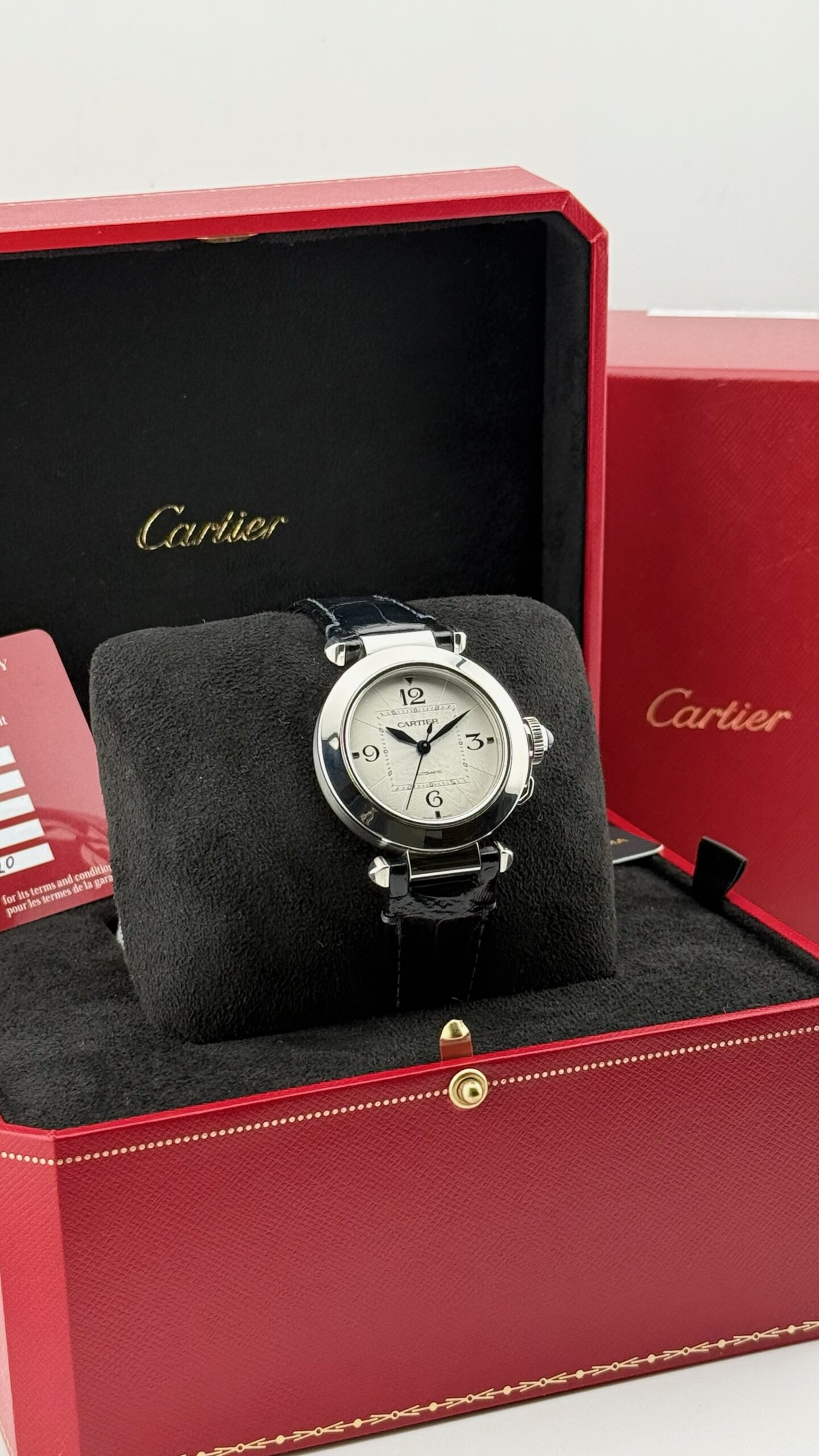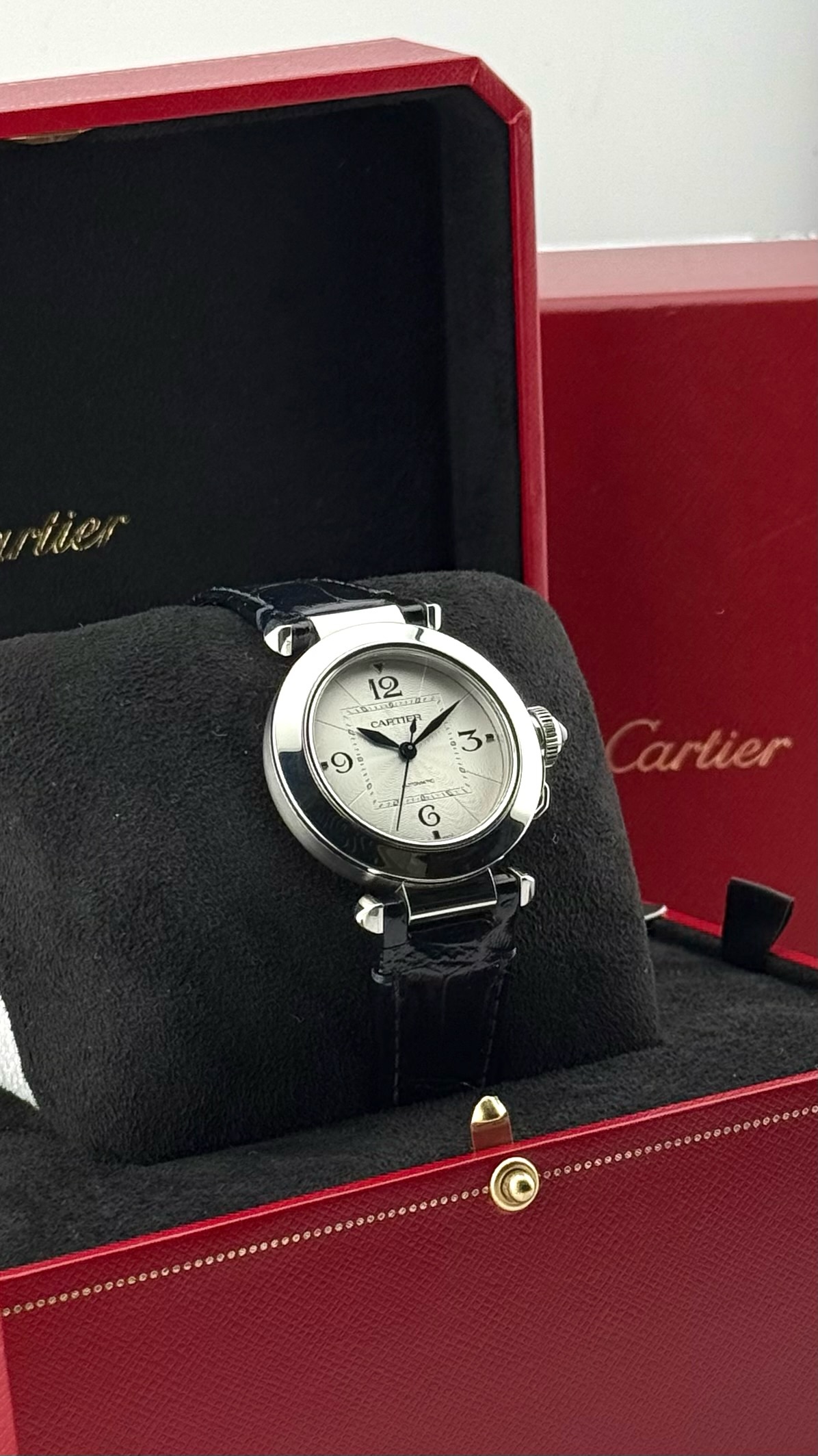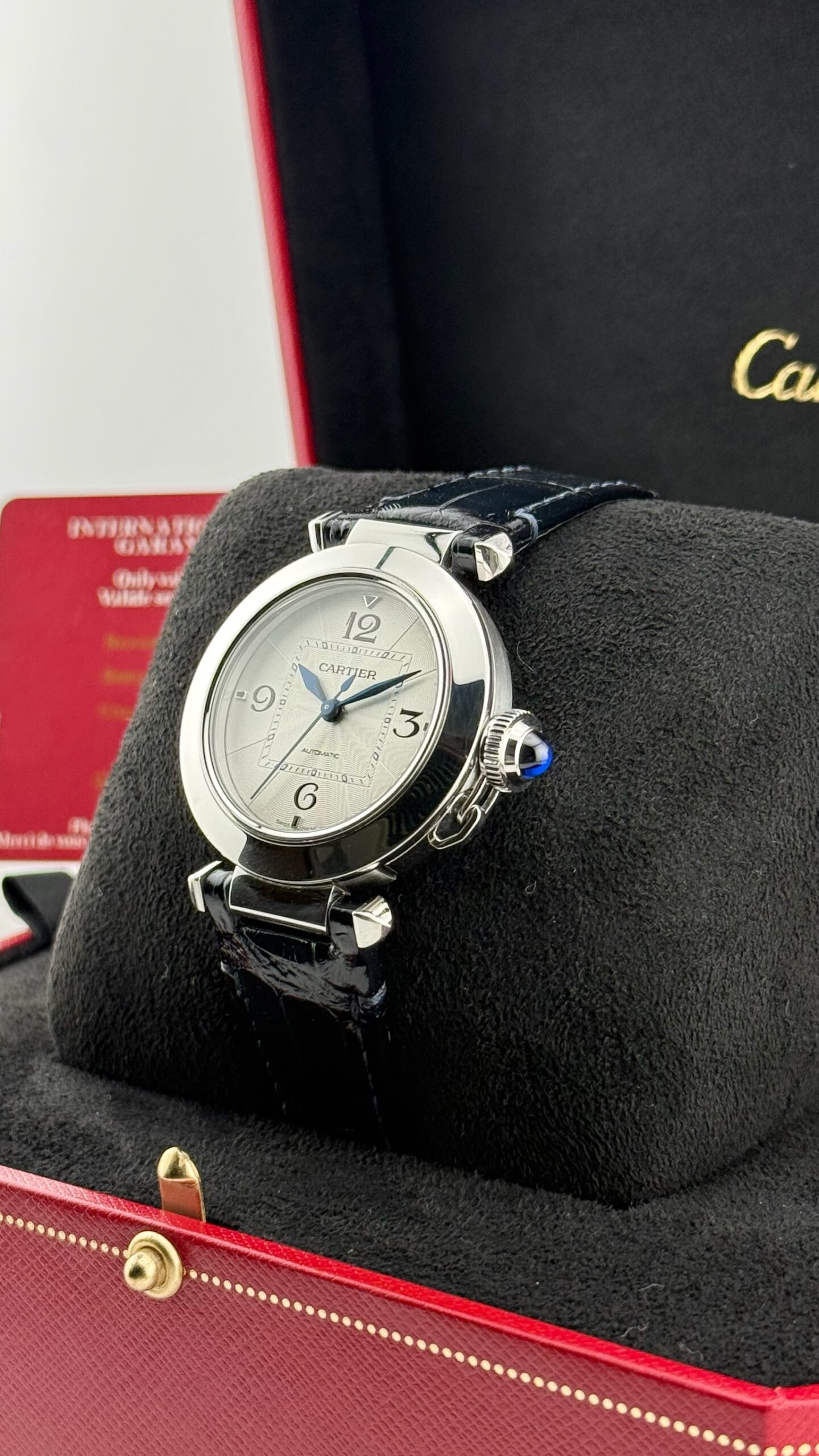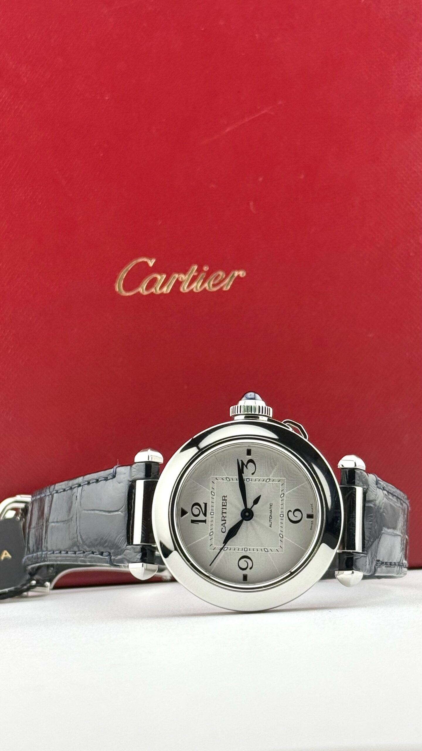 L’orologio ritratto è un Pasha de Cartier, una delle collezioni più iconiche della Maison parigina. Questa versione specifica (Referenza WSPA0012) rappresenta il rilancio moderno della linea, mantenendo tutti i codici estetici che l’hanno resa celebre sin dagli anni ’80, ma con una meccanica aggiornata.