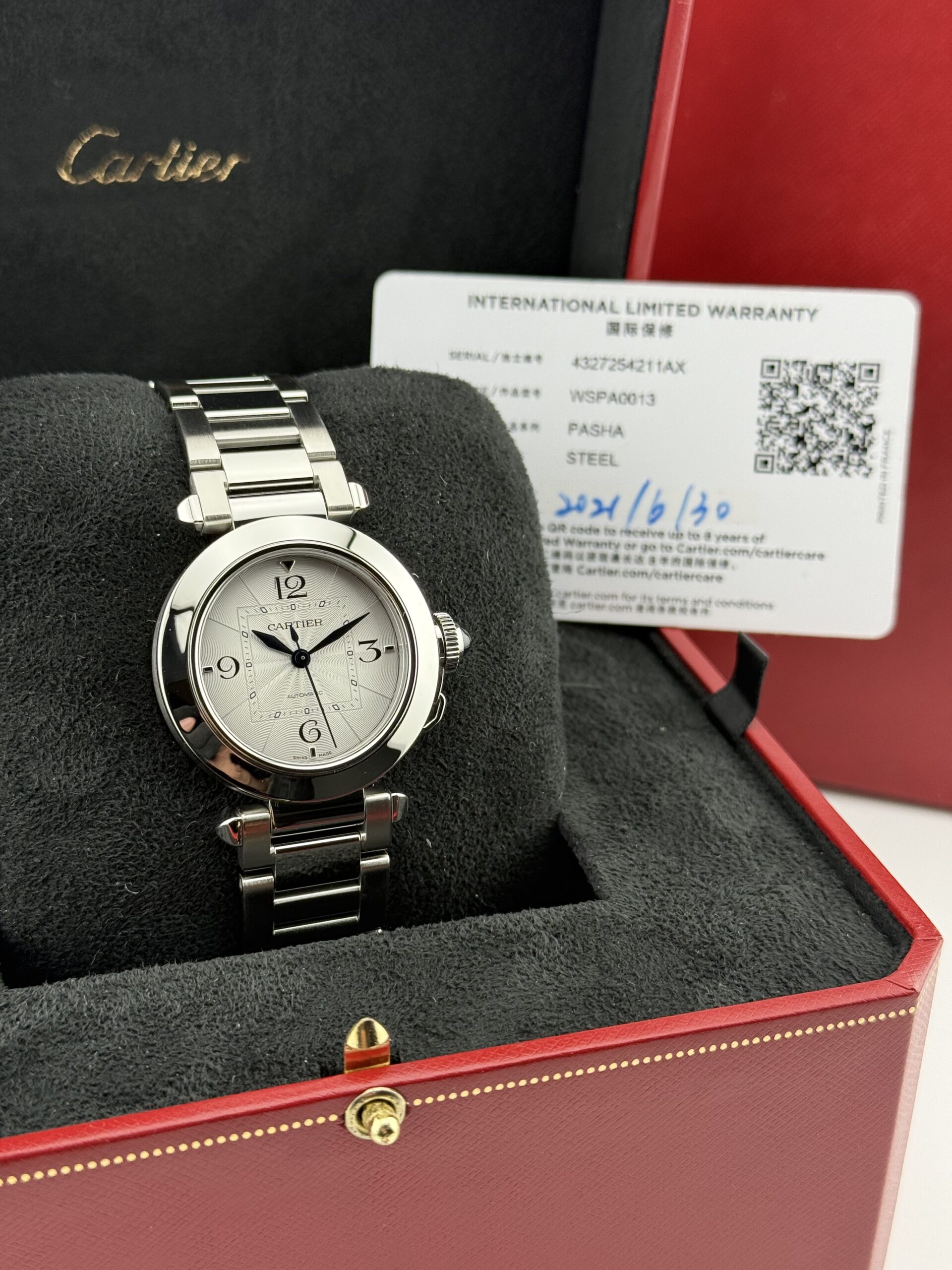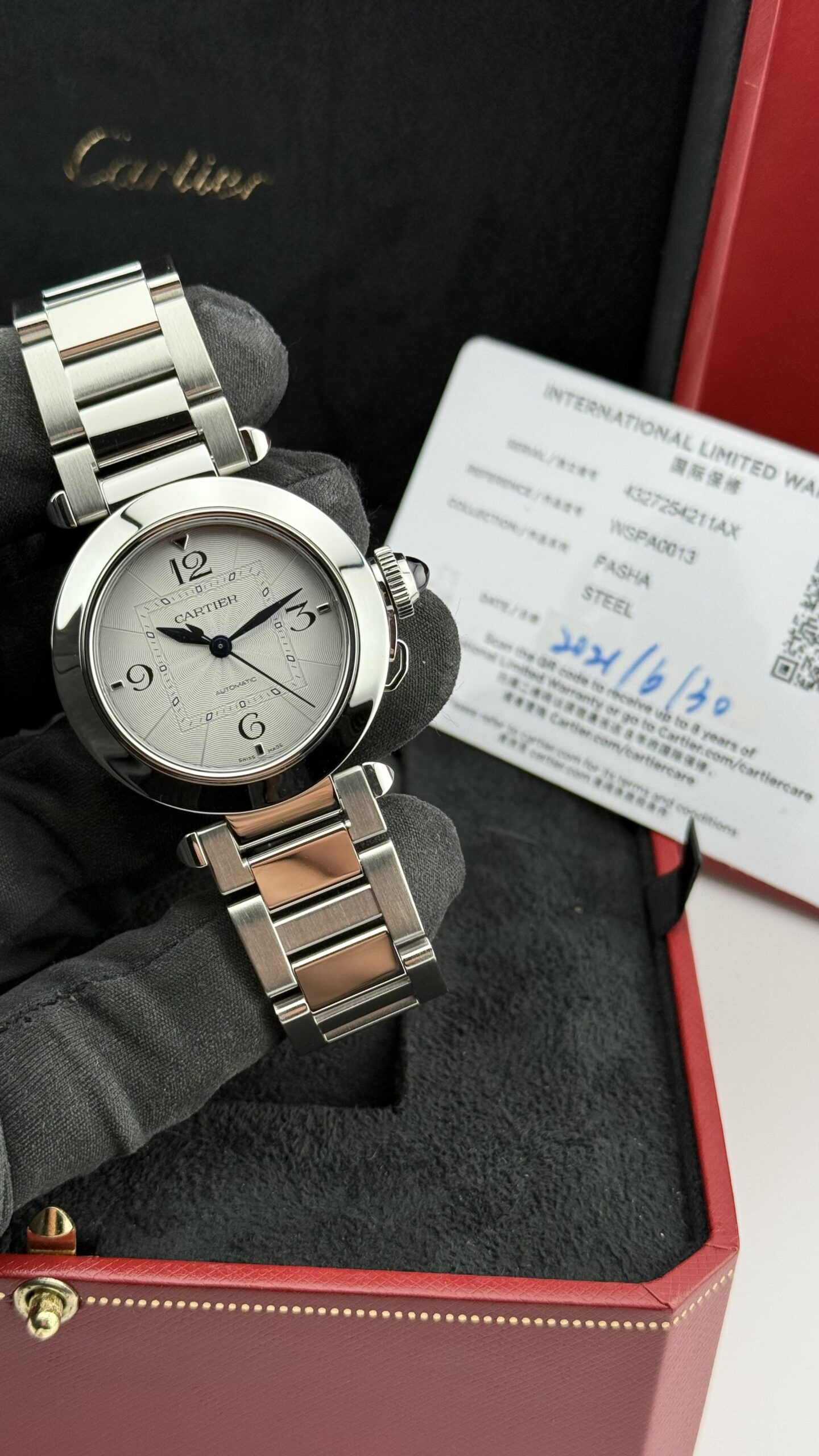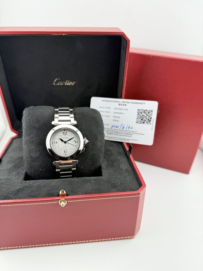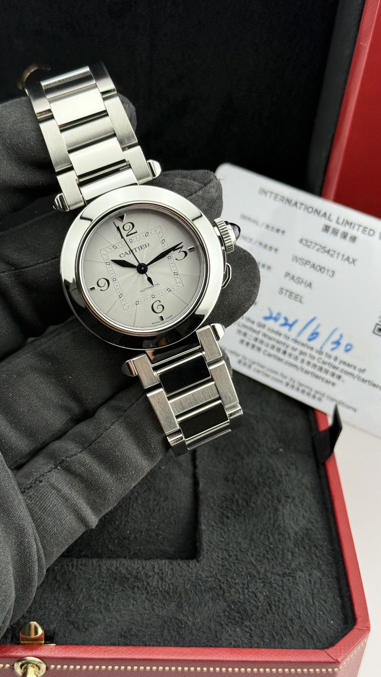 Iconico, versatile, immediatamente riconoscibile. Il Pasha de Cartier WSPA0013 unisce eleganza contemporanea e tradizione orologiera, con cassa tonda da 35 mm in acciaio, movimento automatico Cartier 1847 MC e bracciale a maglie con sistema SmartLink. Resistente all’acqua fino a 100 metri, è perfetto tanto in città quanto in viaggio fonte: