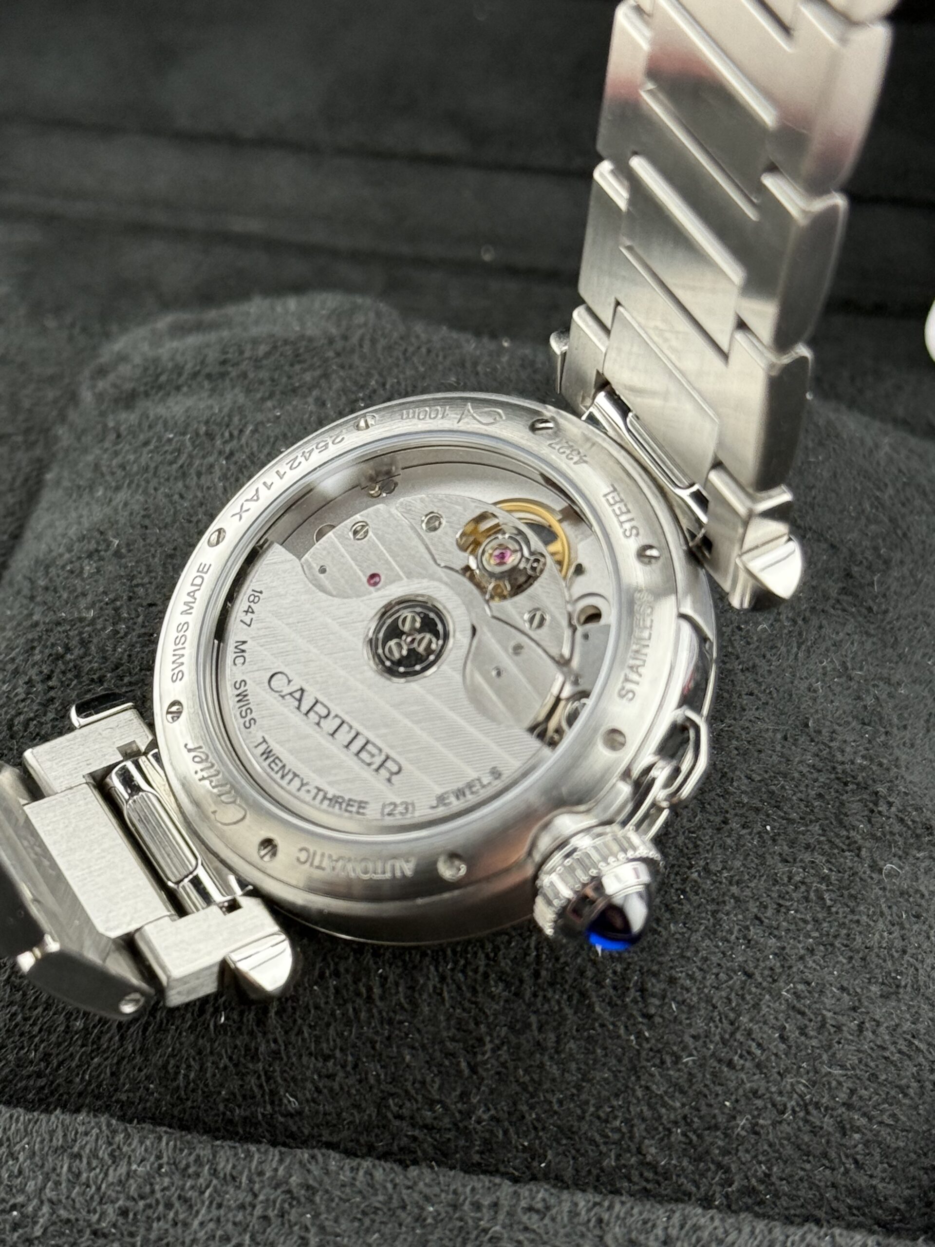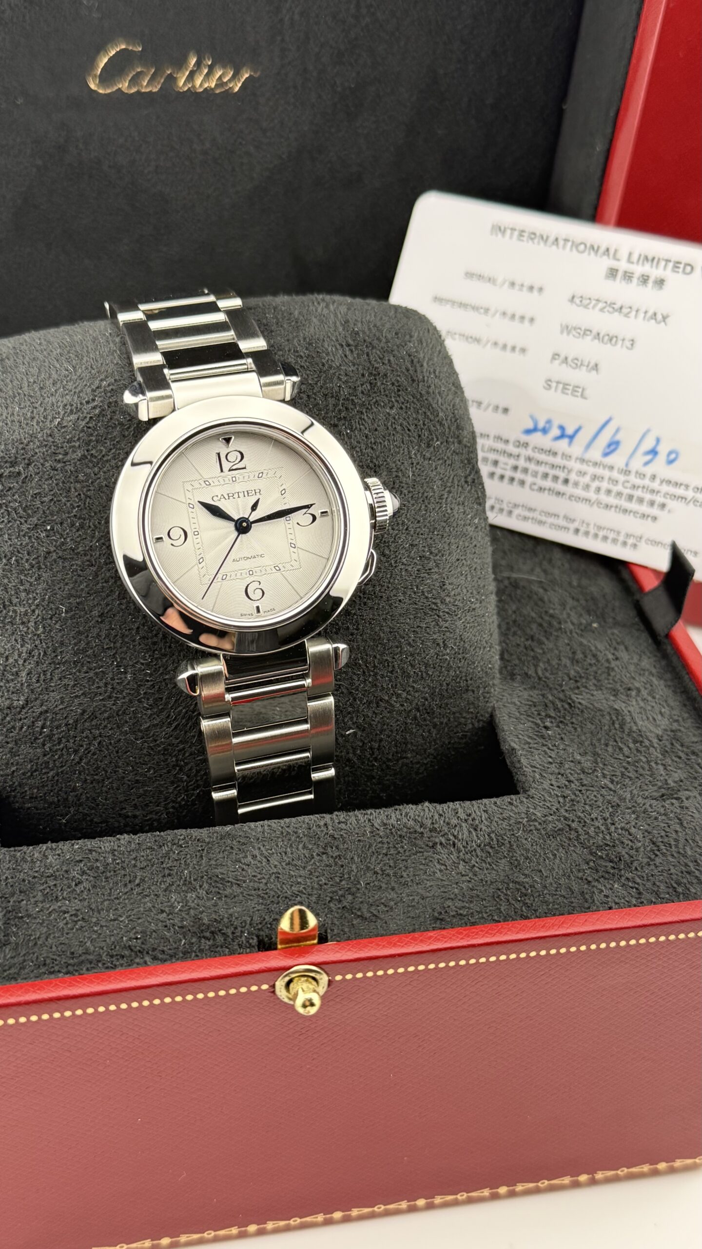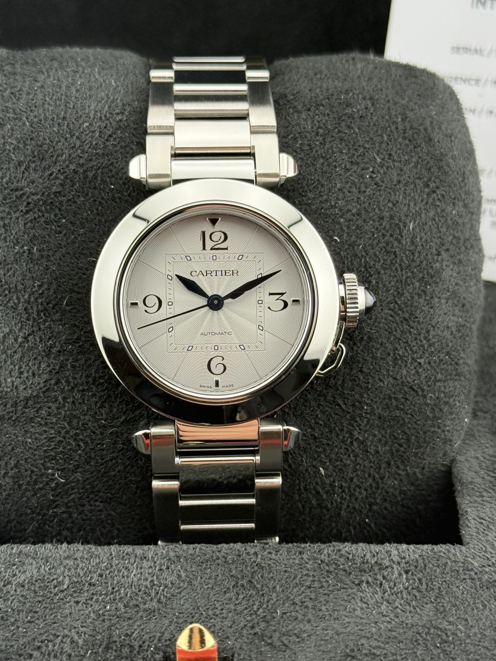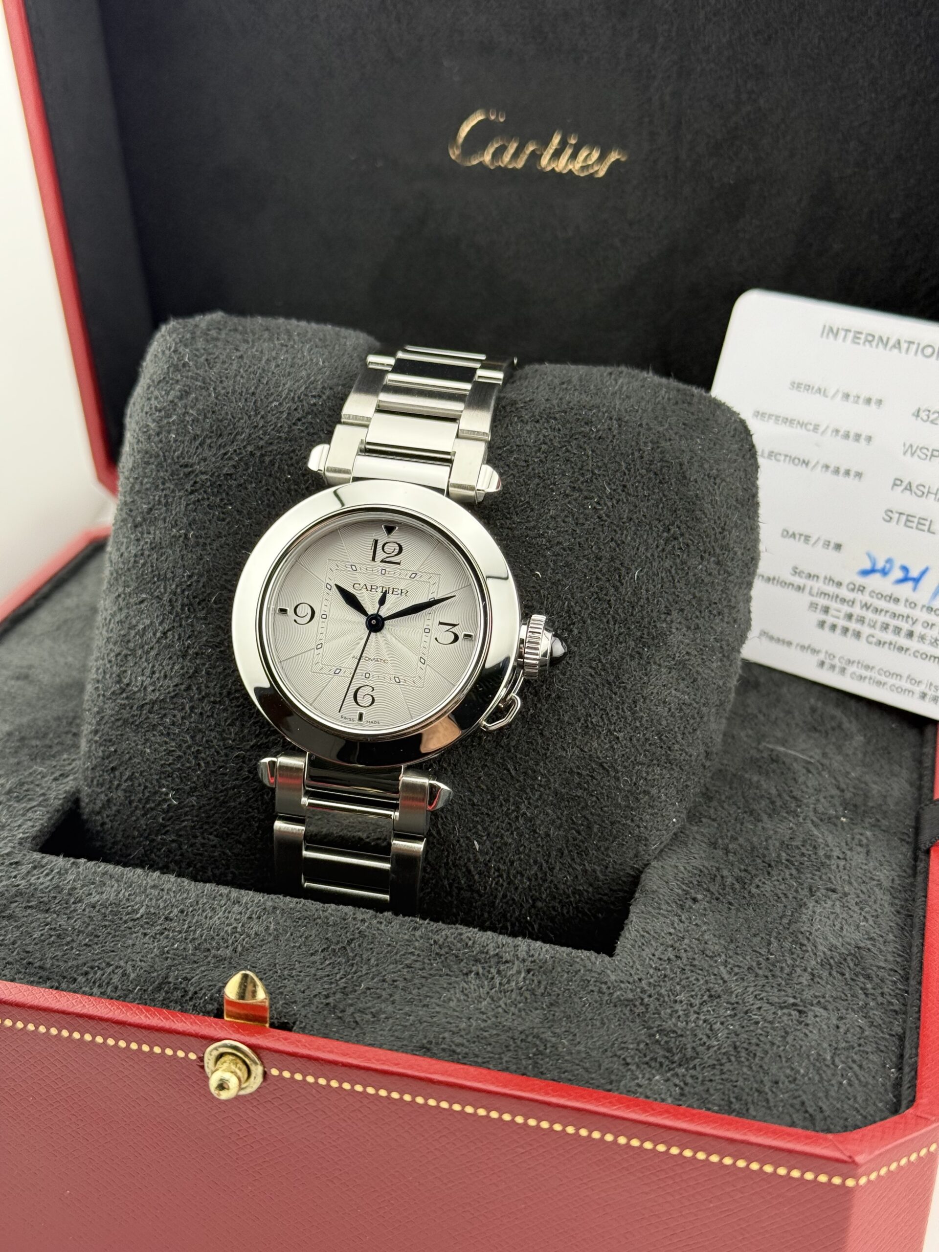 Iconico, versatile, immediatamente riconoscibile. Il Pasha de Cartier WSPA0013 unisce eleganza contemporanea e tradizione orologiera, con cassa tonda da 35 mm in acciaio, movimento automatico Cartier 1847 MC e bracciale a maglie con sistema SmartLink. Resistente all’acqua fino a 100 metri, è perfetto tanto in città quanto in viaggio fonte: