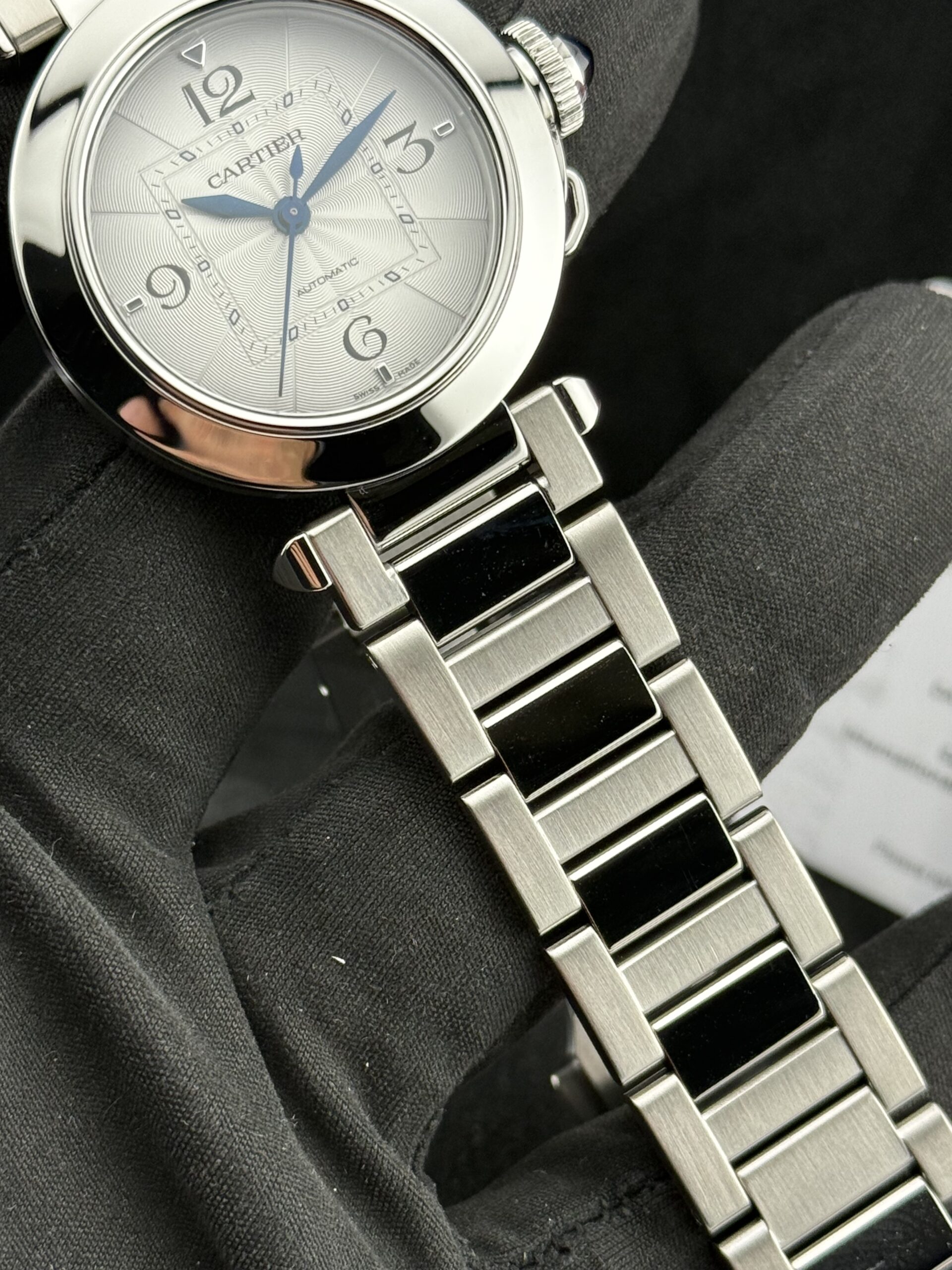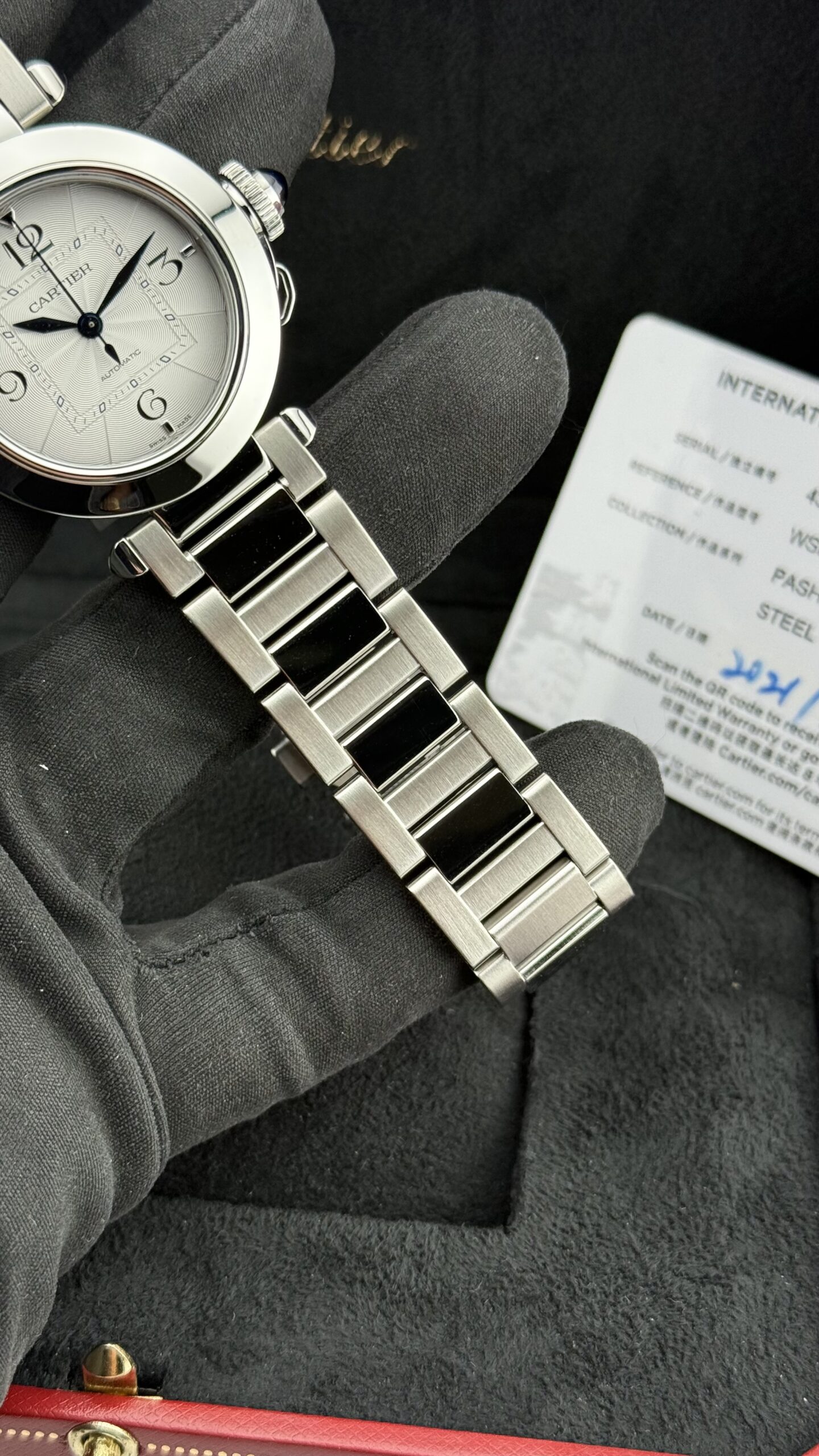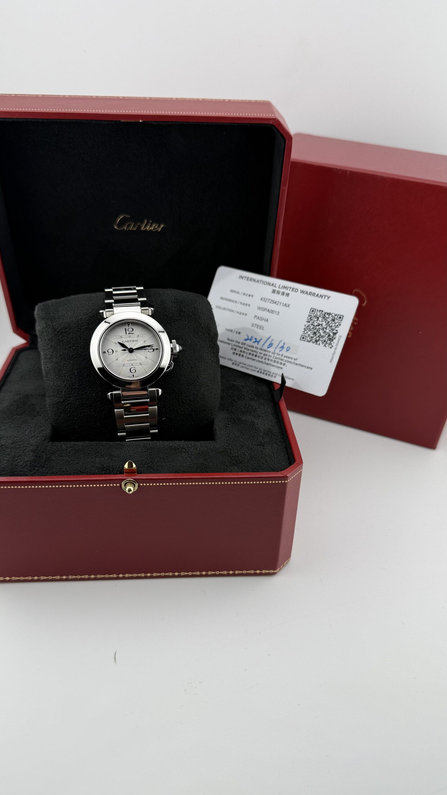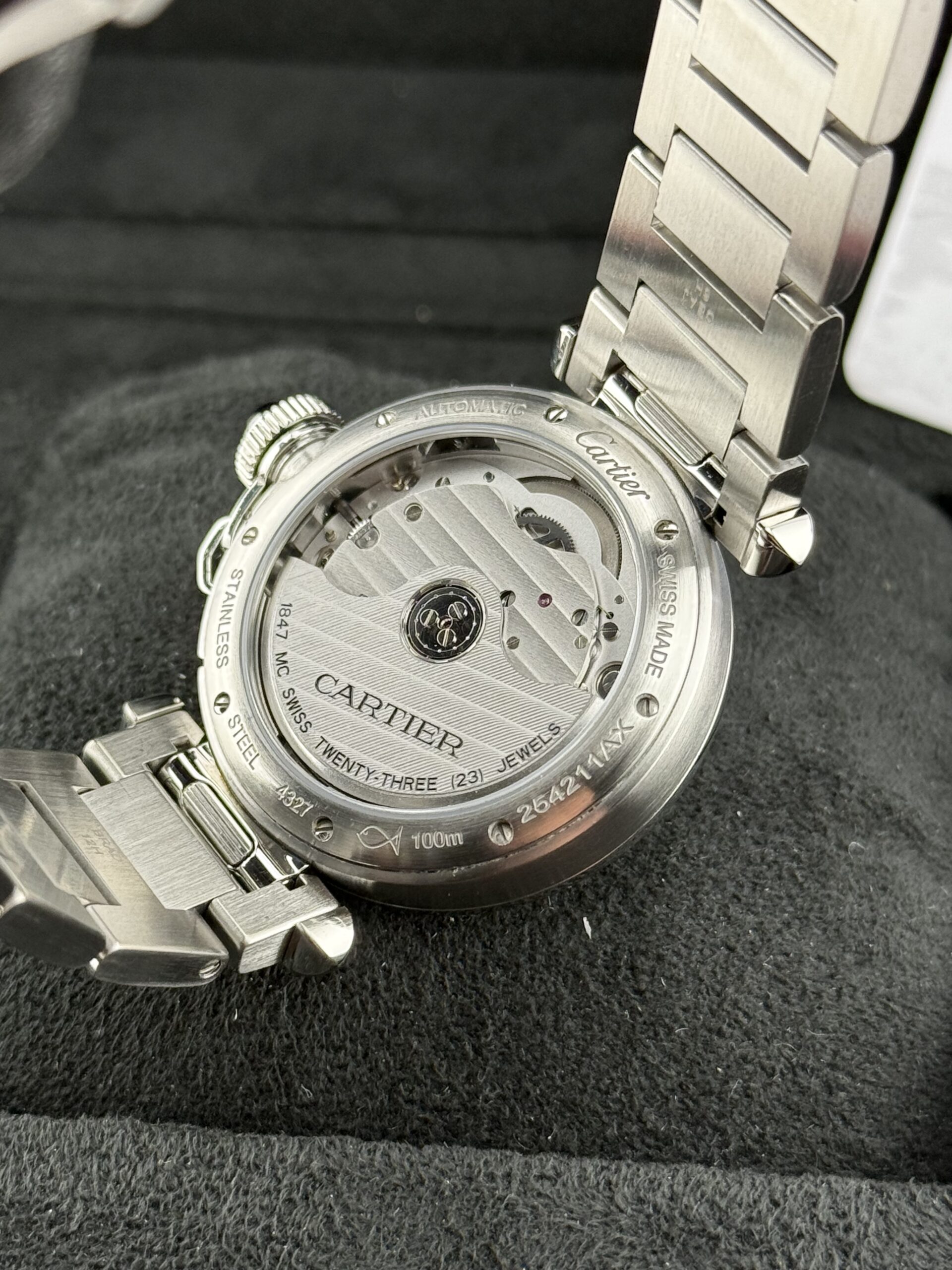 Iconico, versatile, immediatamente riconoscibile. Il Pasha de Cartier WSPA0013 unisce eleganza contemporanea e tradizione orologiera, con cassa tonda da 35 mm in acciaio, movimento automatico Cartier 1847 MC e bracciale a maglie con sistema SmartLink. Resistente all’acqua fino a 100 metri, è perfetto tanto in città quanto in viaggio fonte:
