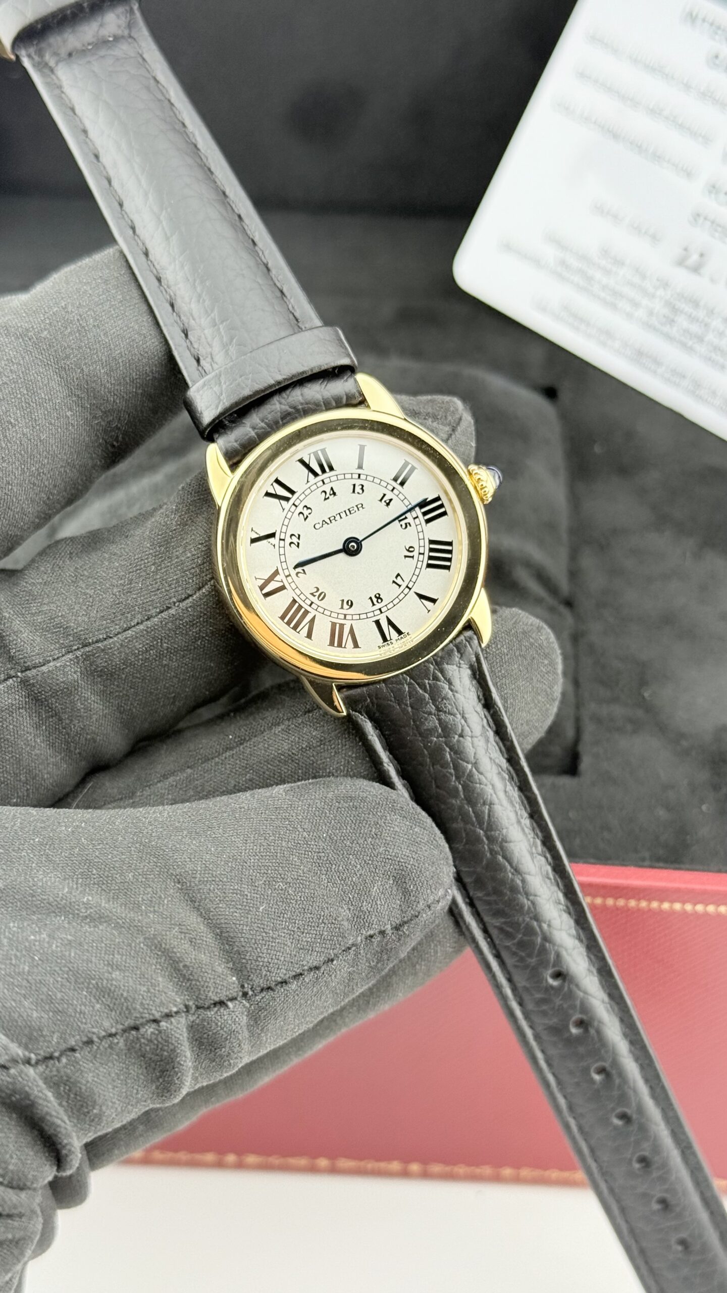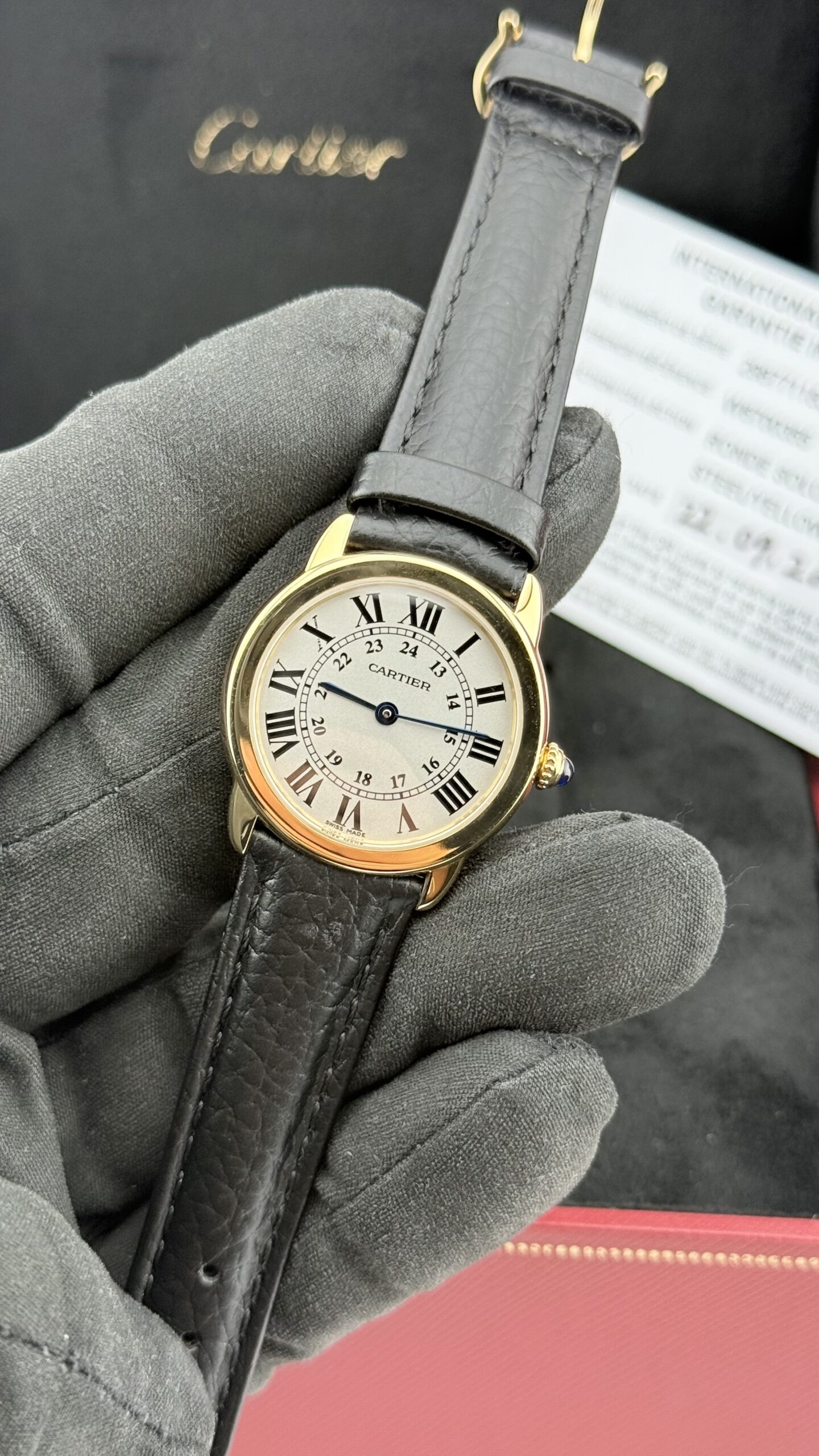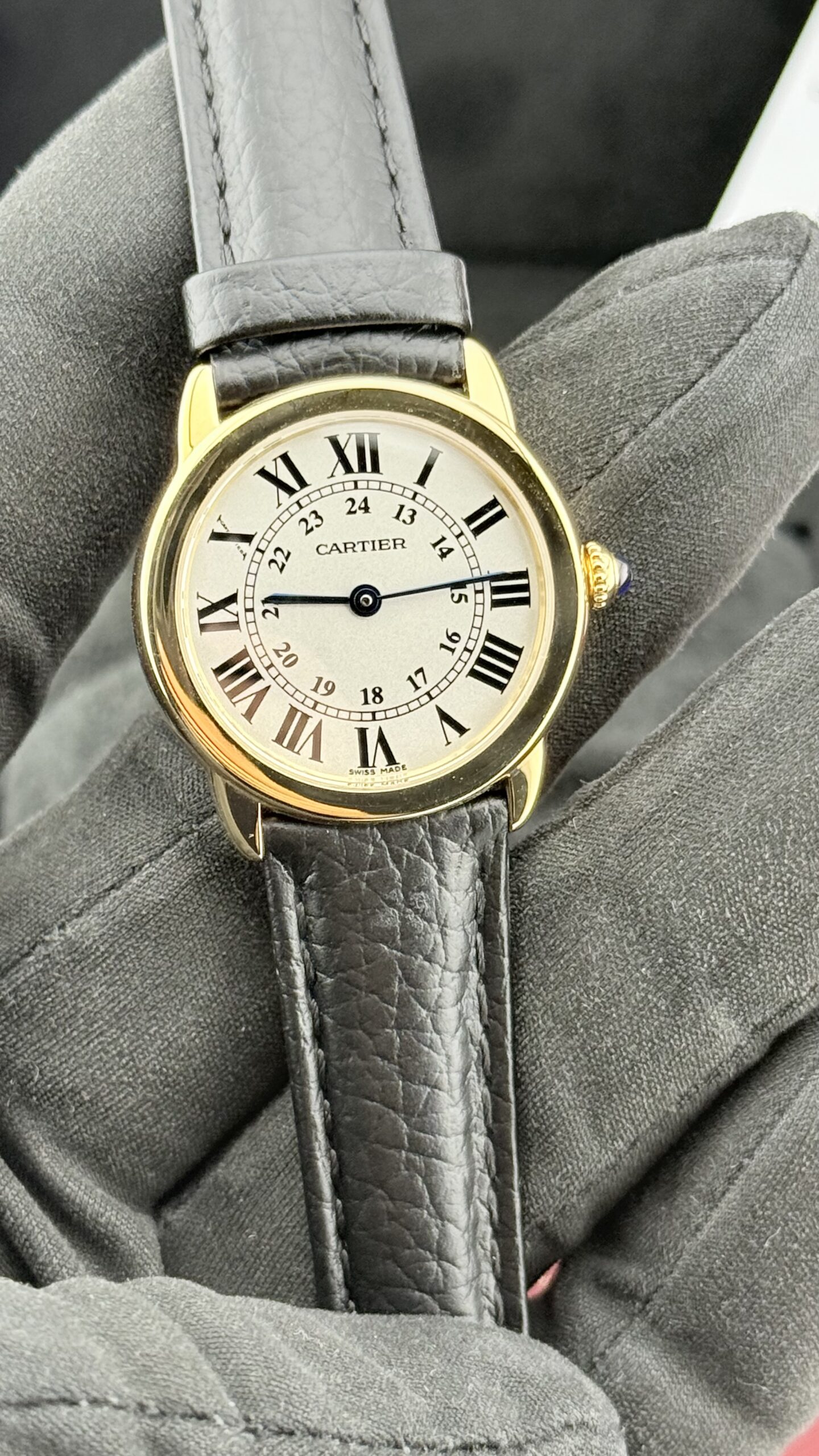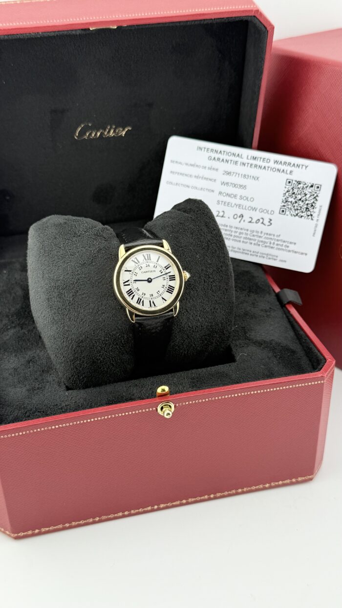 Vendo Cartier Ronde Solo de Cartier ref. W6700355, misura Small, un classico intramontabile della Maison. Elegante, sottile e leggerissimo al polso, combina una cassa in oro 18 kt con il quadrante argenté opalino a numeri romani e le iconiche lancette azzurrate. La corona perlata è impreziosita dal cabochon in spinello blu, dettaglio tipico Cartier. Il movimento al quarzo garantisce precisione e zero pensieri nell’uso quotidiano: un dress watch raffinato e affidabile.