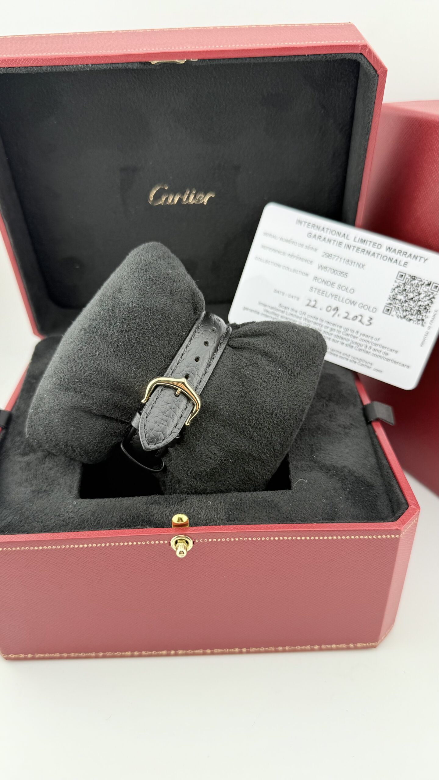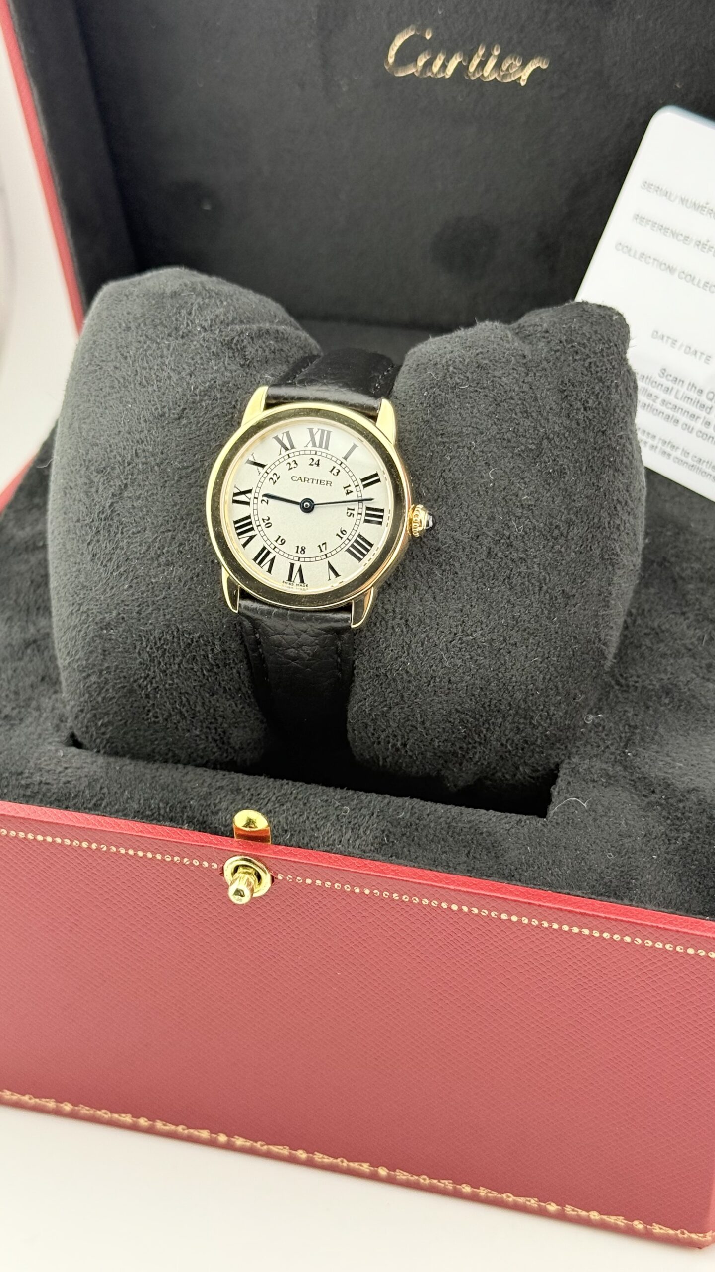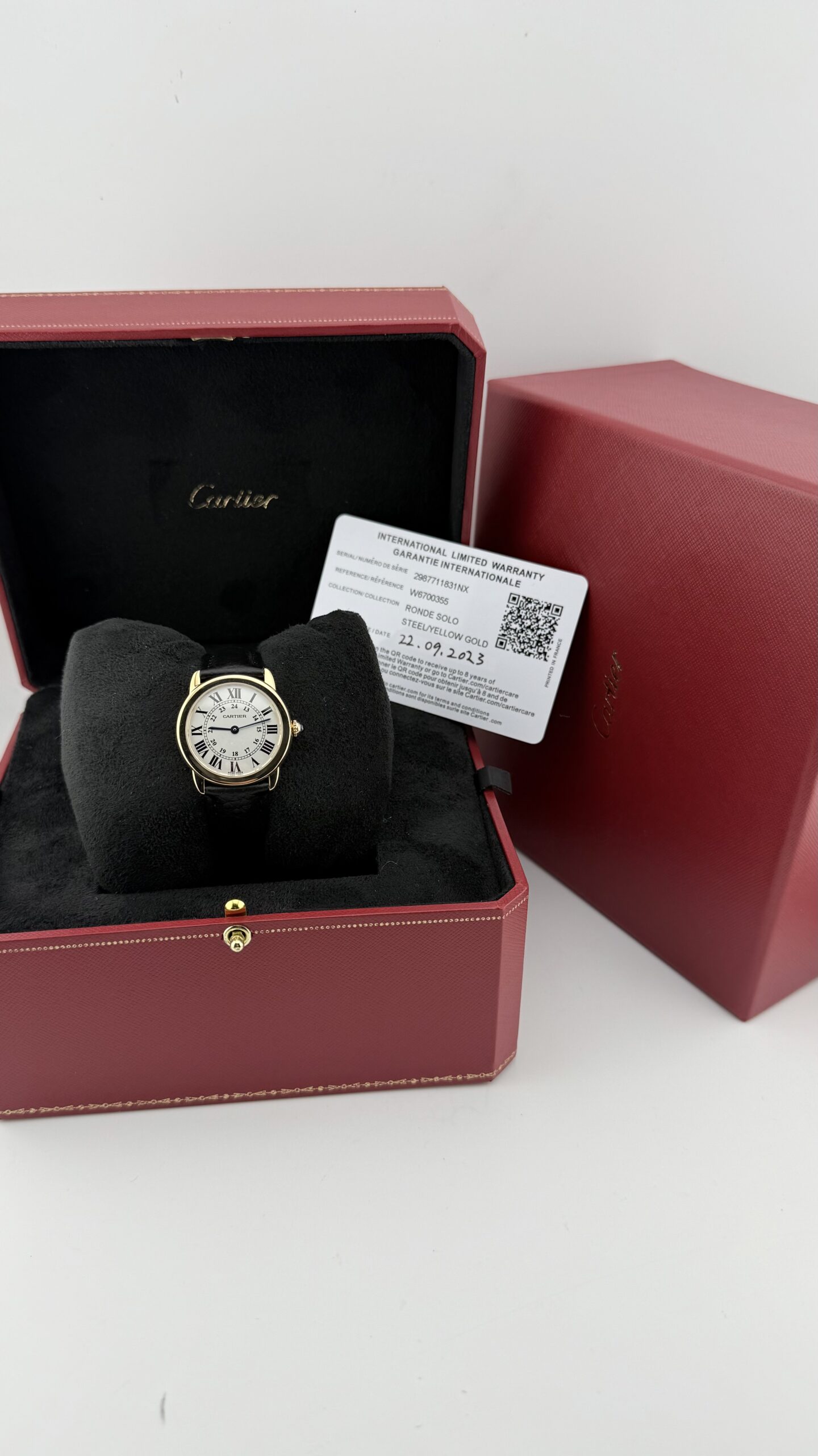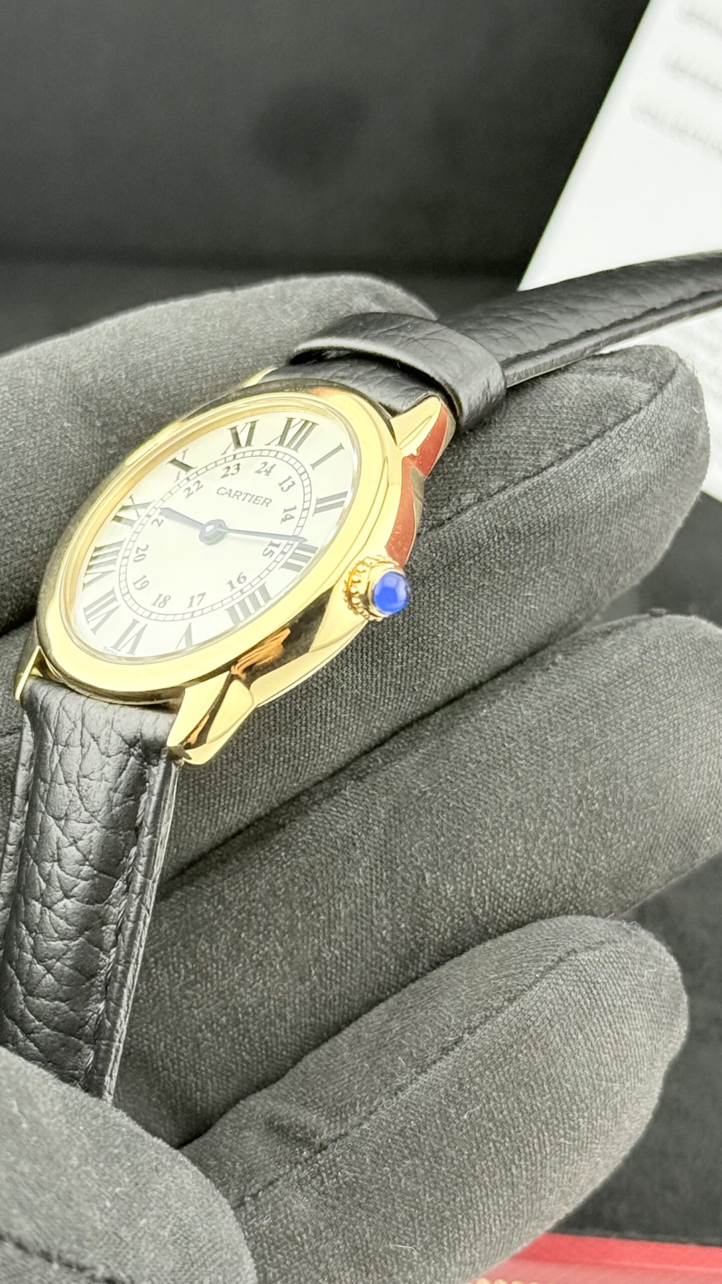 Vendo Cartier Ronde Solo de Cartier ref. W6700355, misura Small, un classico intramontabile della Maison. Elegante, sottile e leggerissimo al polso, combina una cassa in oro 18 kt con il quadrante argenté opalino a numeri romani e le iconiche lancette azzurrate. La corona perlata è impreziosita dal cabochon in spinello blu, dettaglio tipico Cartier. Il movimento al quarzo garantisce precisione e zero pensieri nell’uso quotidiano: un dress watch raffinato e affidabile.