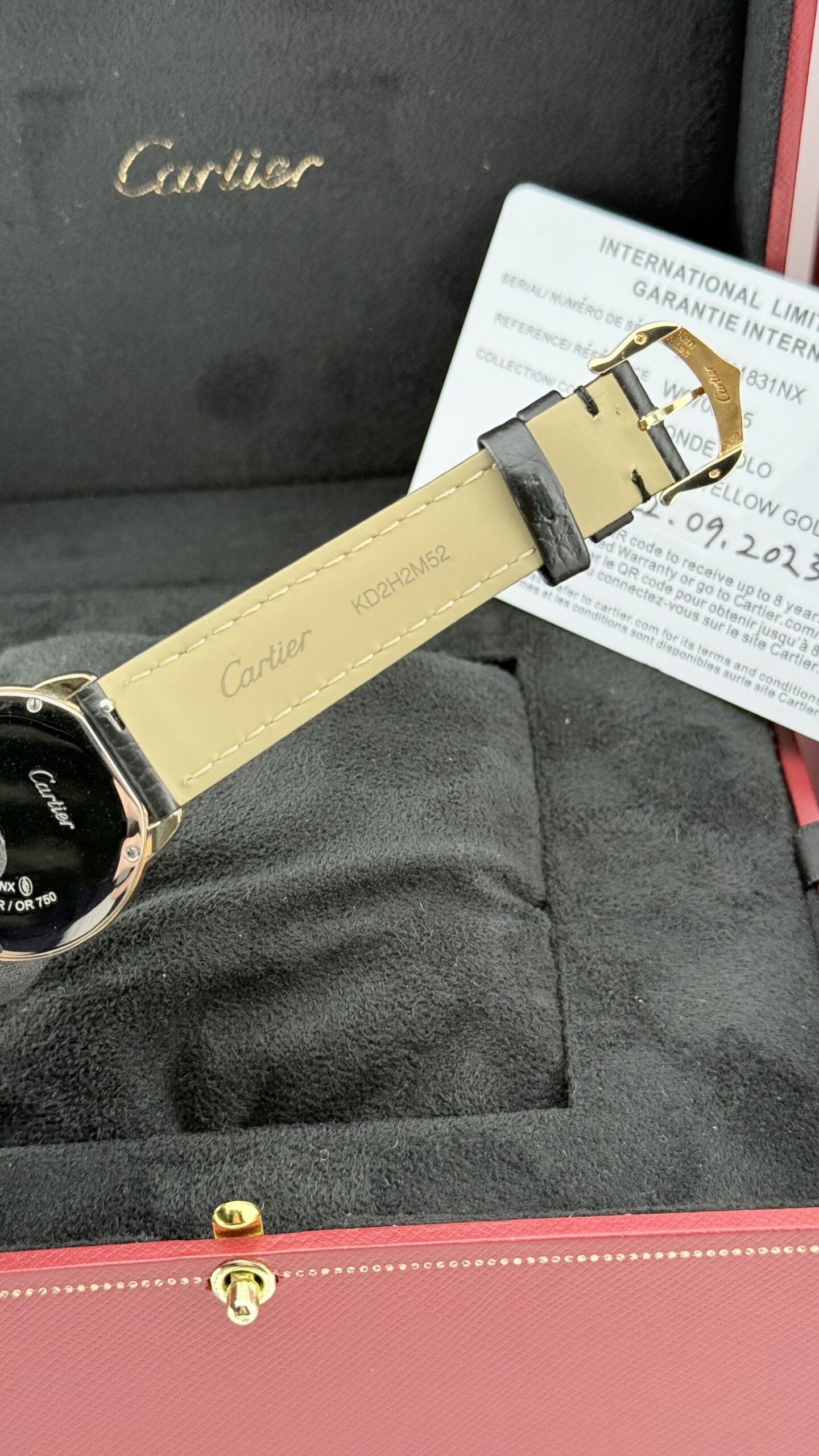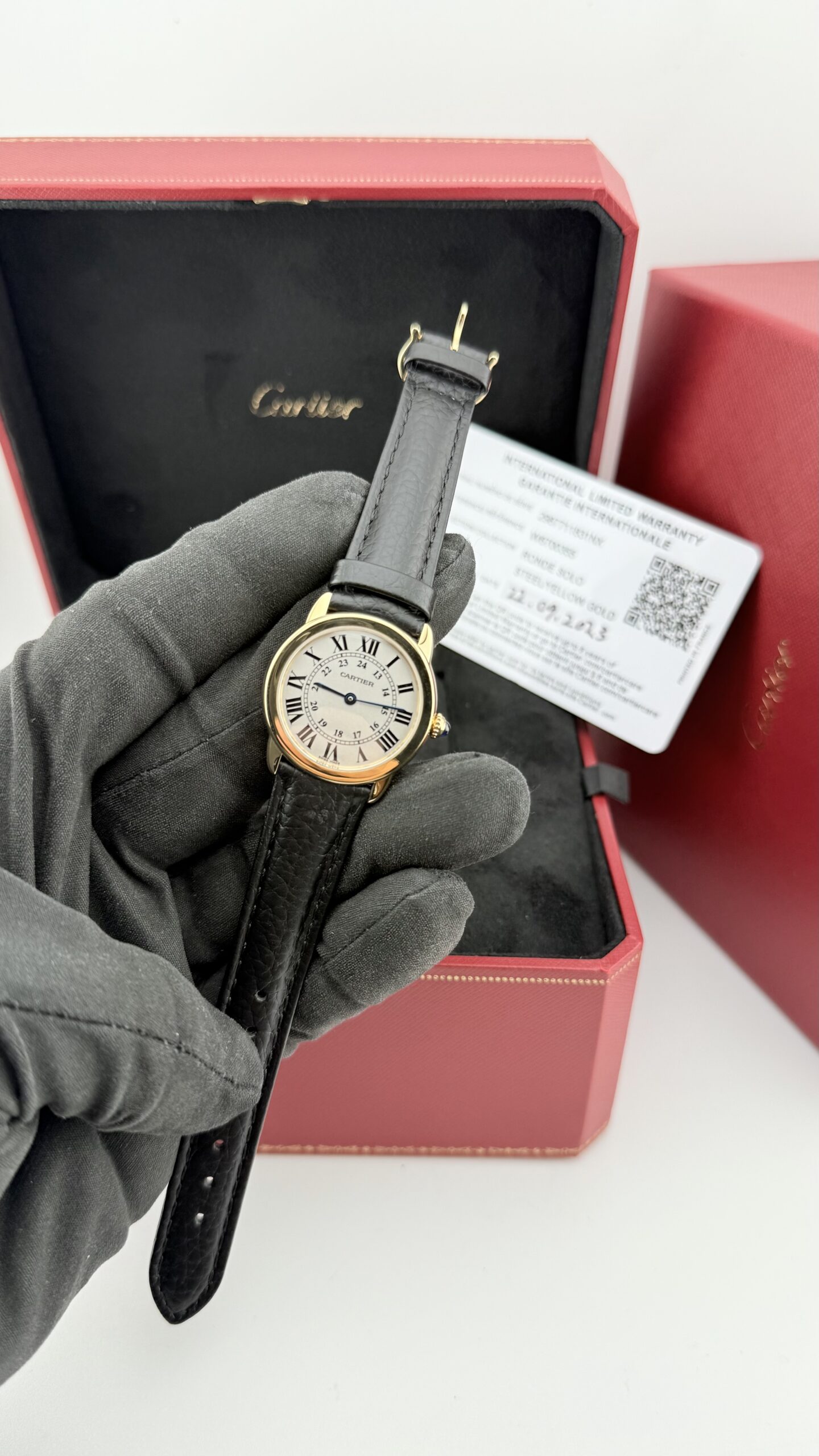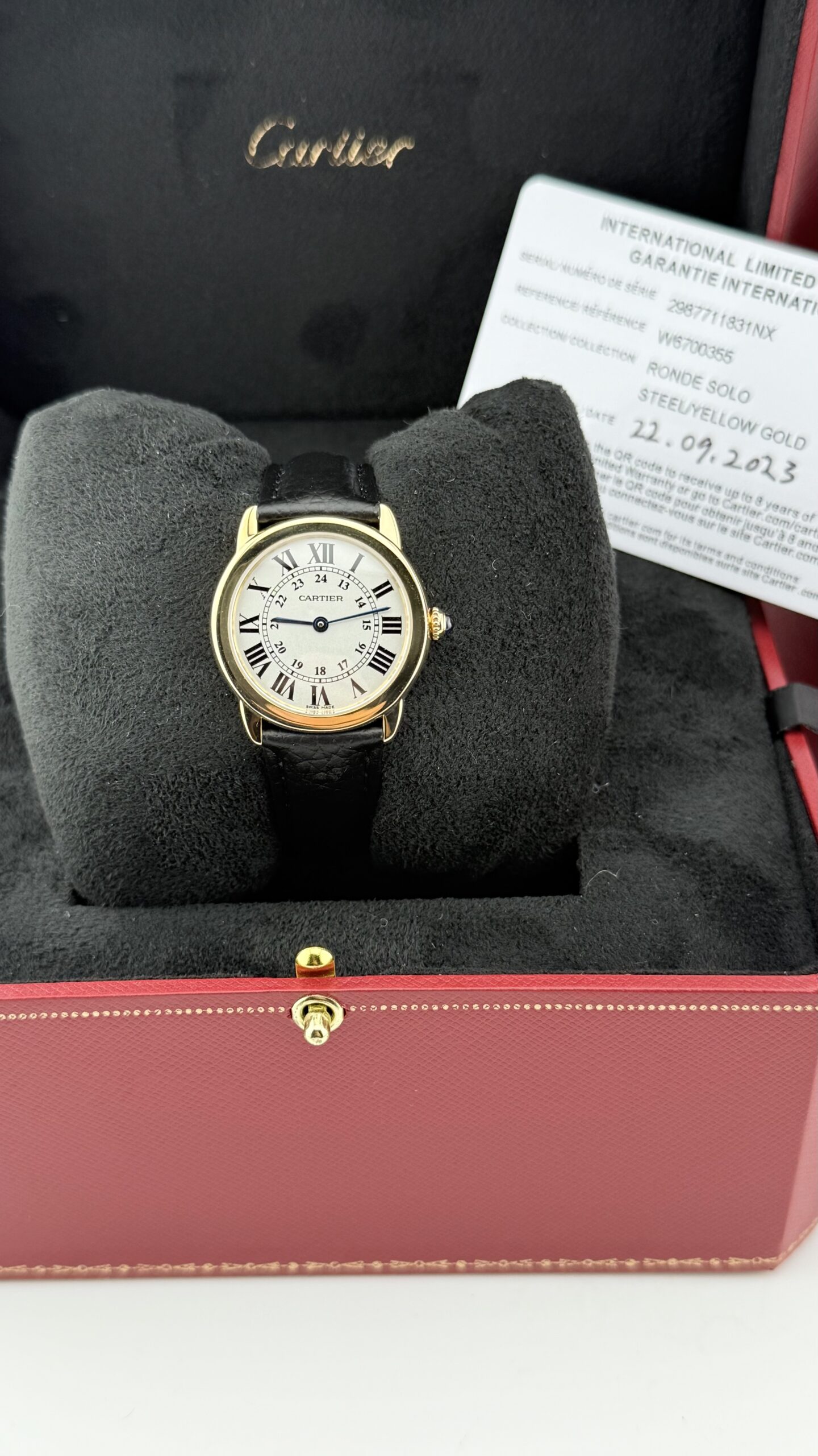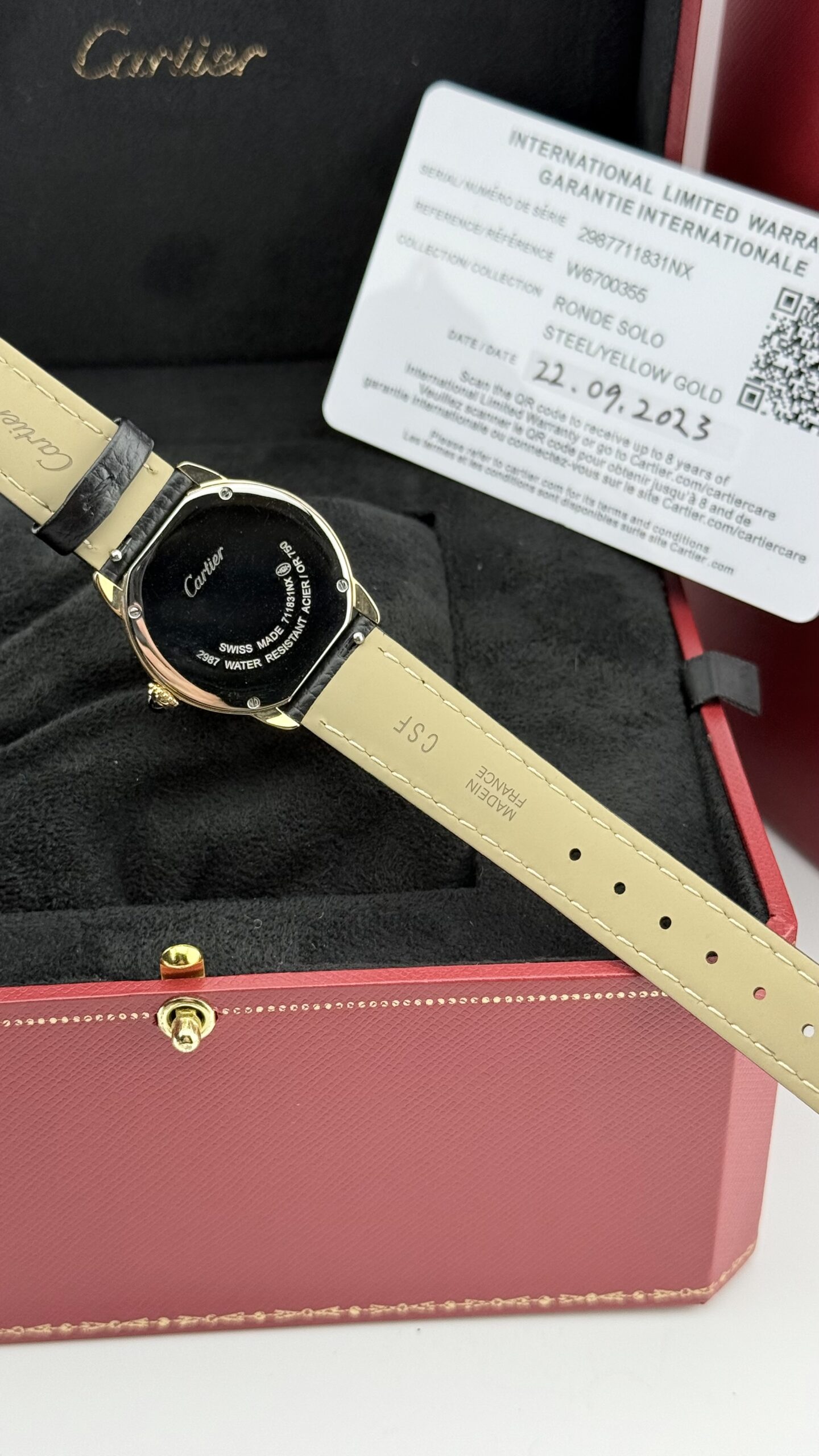 Vendo Cartier Ronde Solo de Cartier ref. W6700355, misura Small, un classico intramontabile della Maison. Elegante, sottile e leggerissimo al polso, combina una cassa in oro 18 kt con il quadrante argenté opalino a numeri romani e le iconiche lancette azzurrate. La corona perlata è impreziosita dal cabochon in spinello blu, dettaglio tipico Cartier. Il movimento al quarzo garantisce precisione e zero pensieri nell’uso quotidiano: un dress watch raffinato e affidabile.