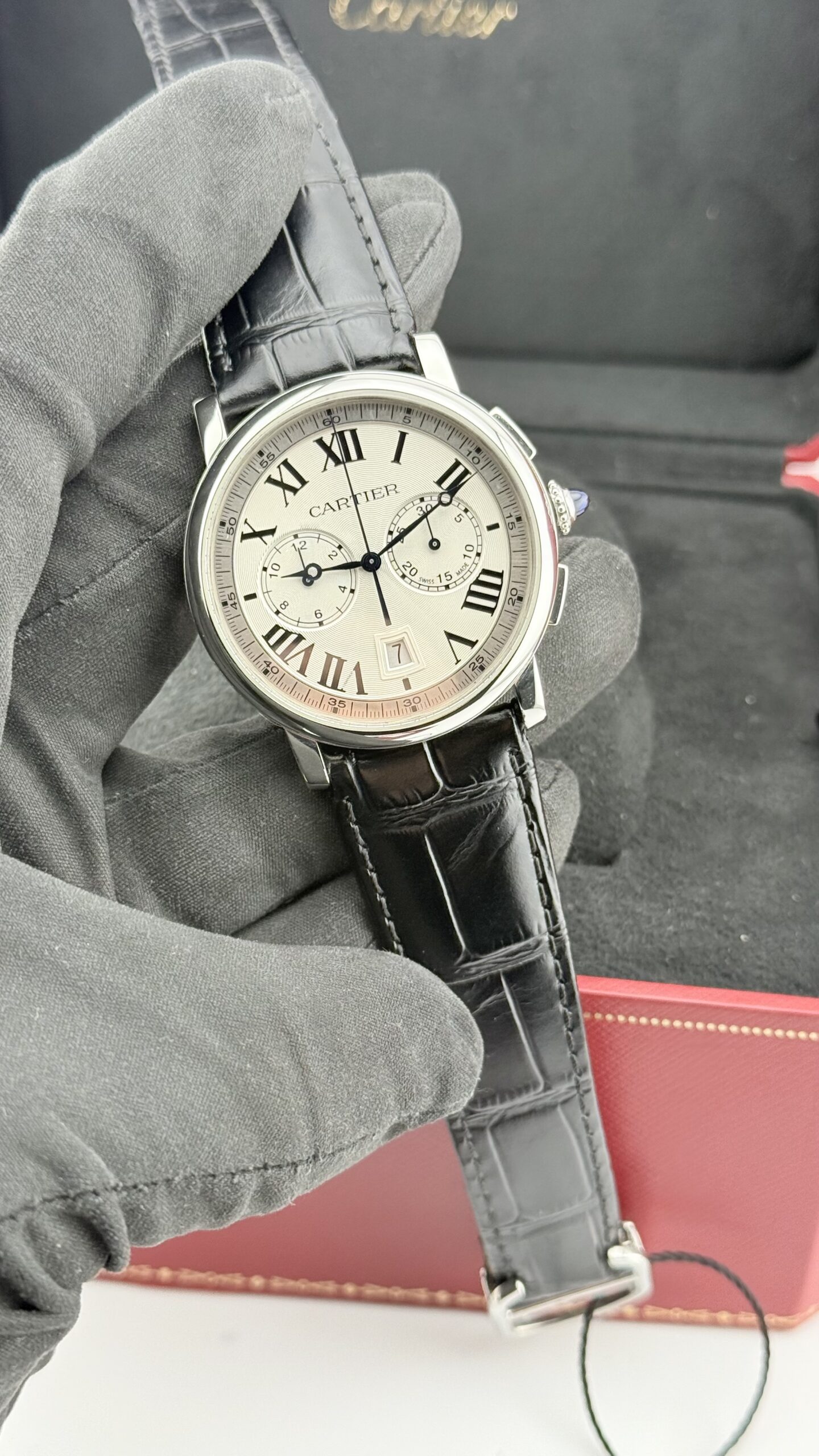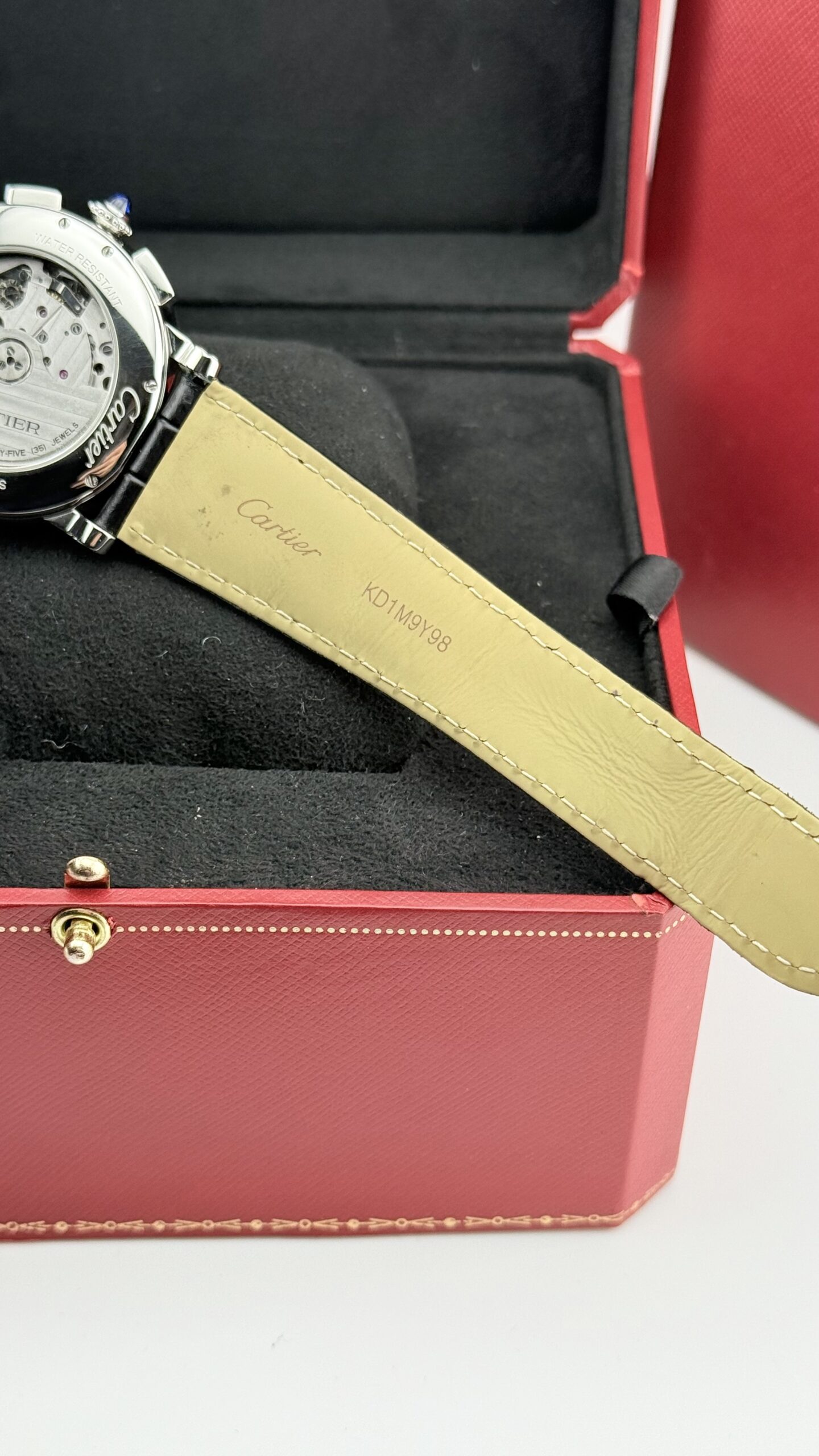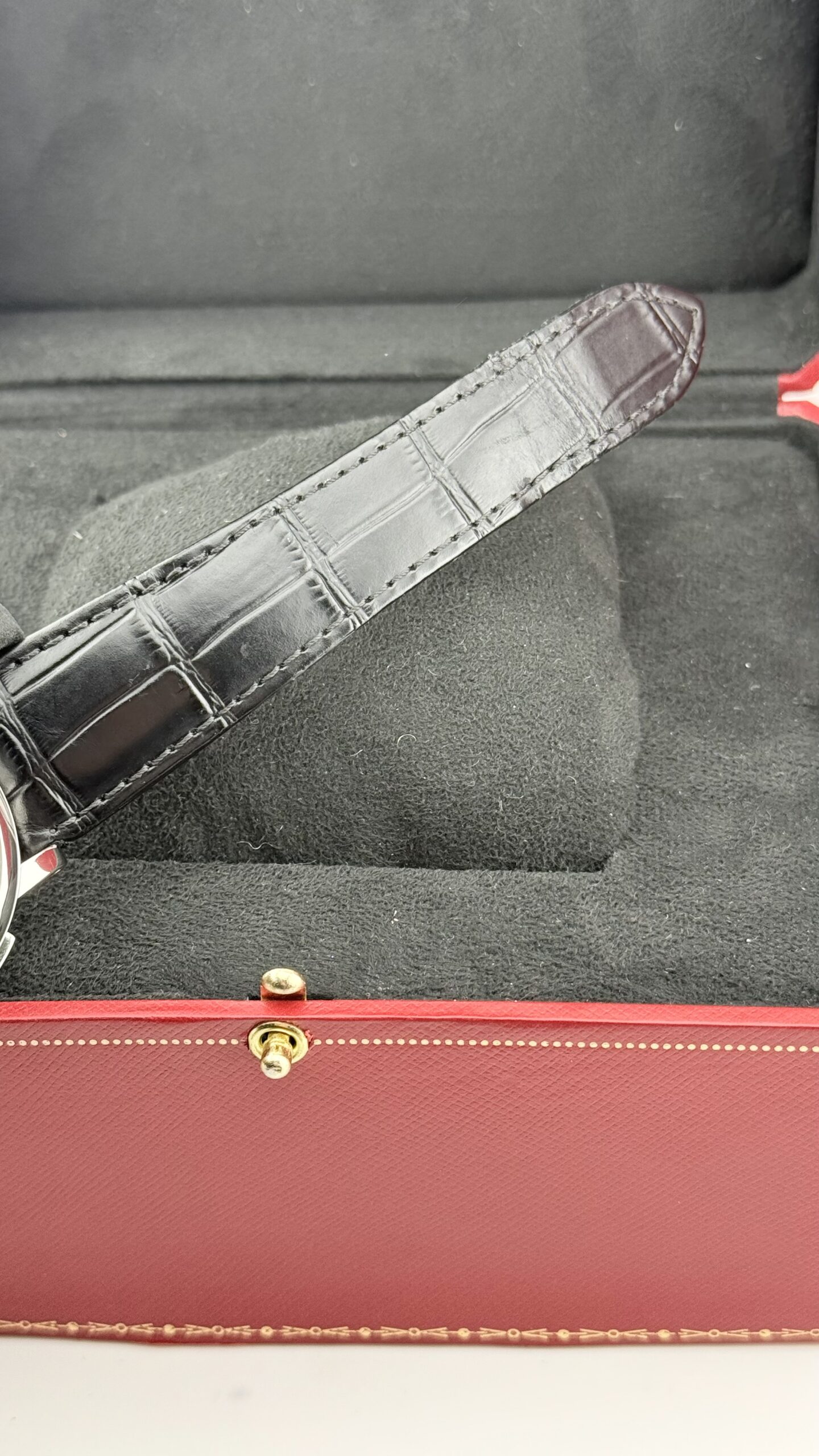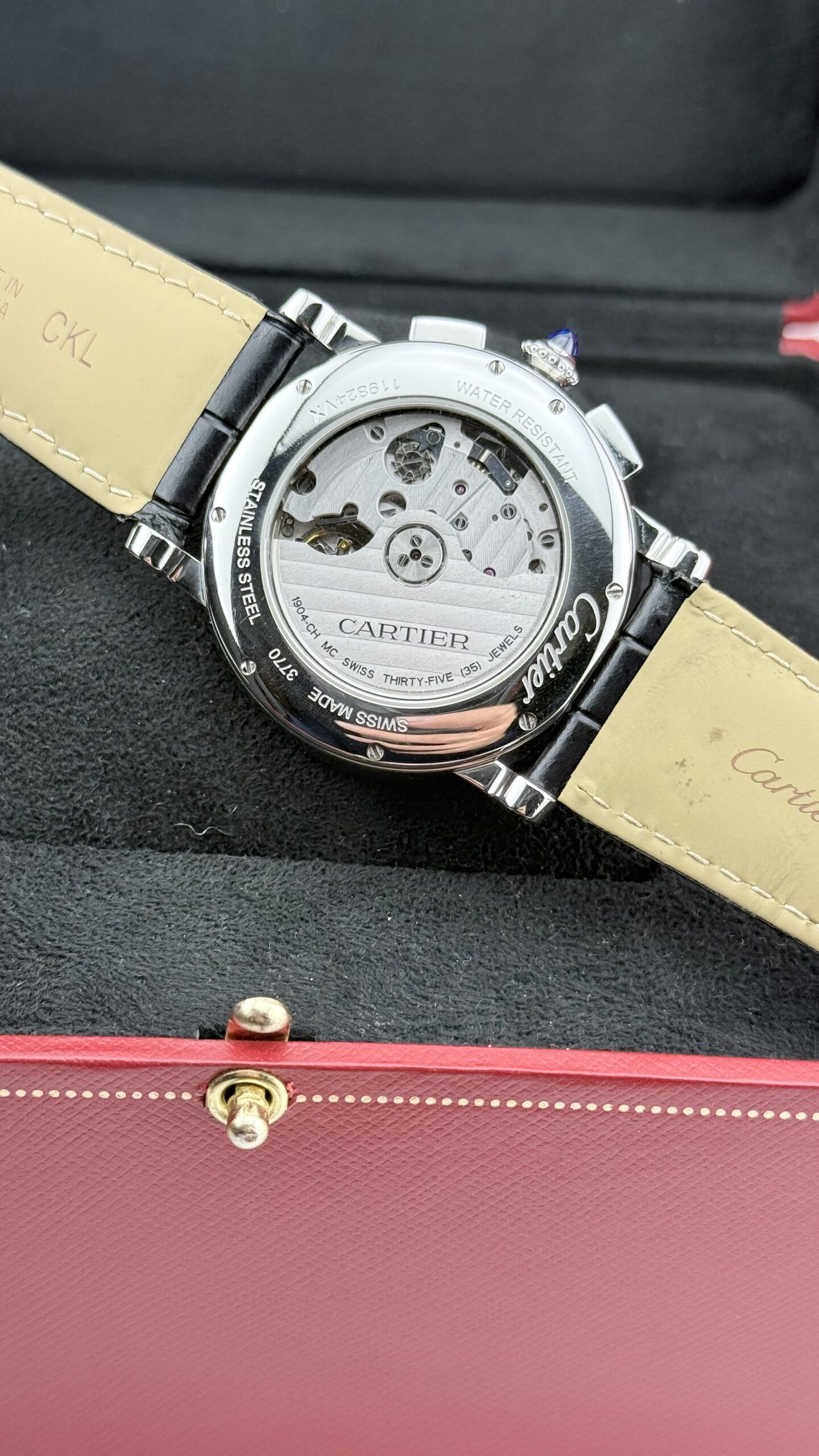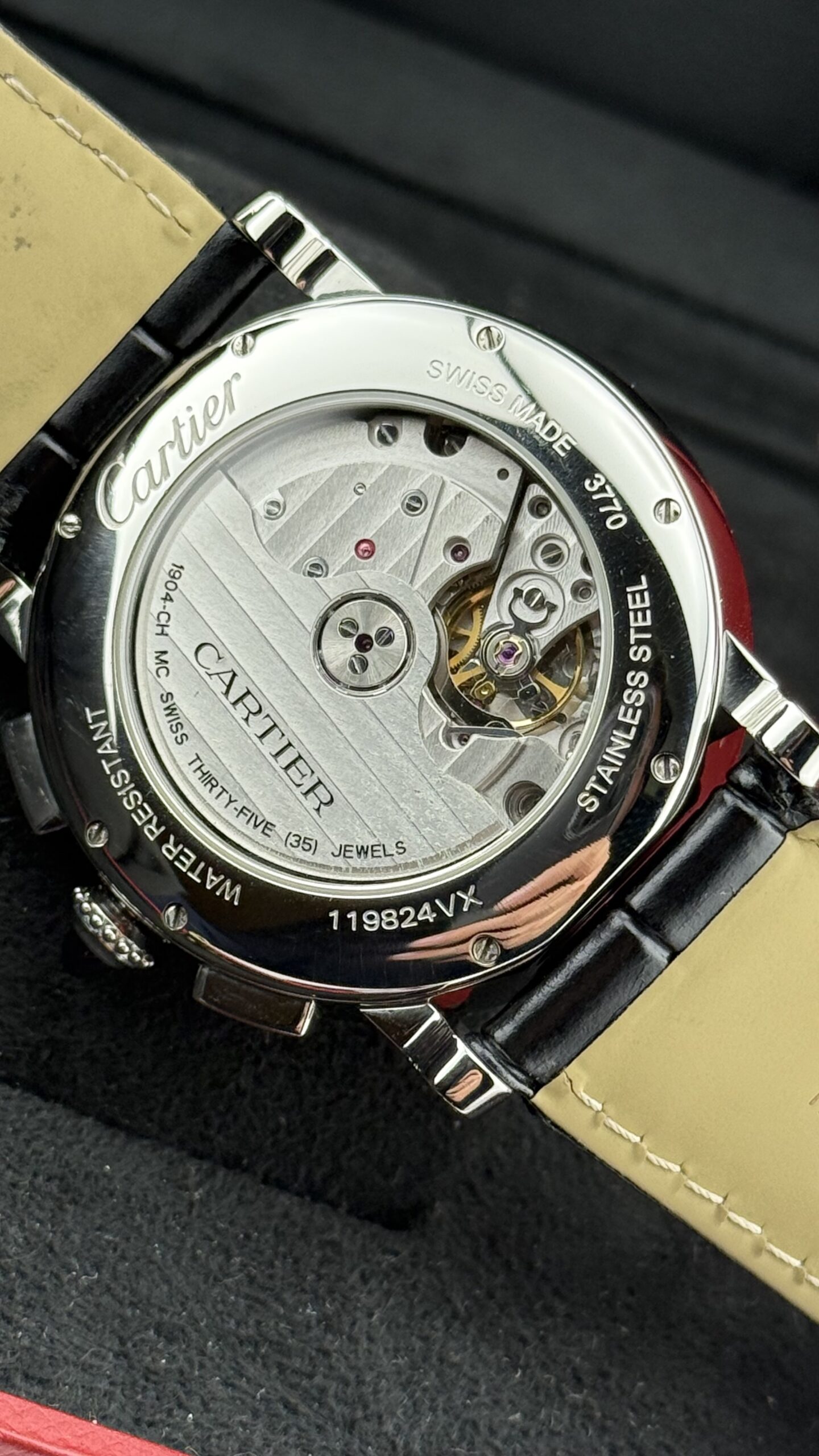 - Movimento: Cartier 1904-CH MC di manifattura, automatico; frequenza 28.800 a/h; doppio bariletto con riserva di carica ~48 ore; finiture Côtes de Genève.
