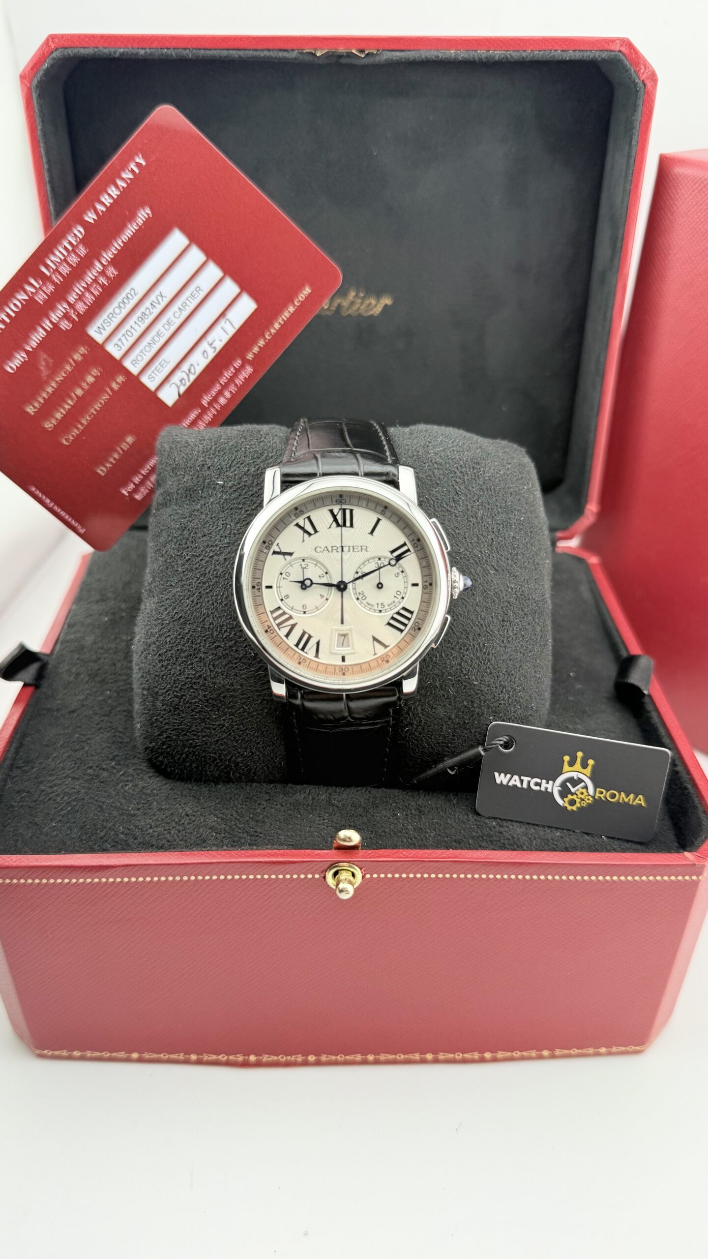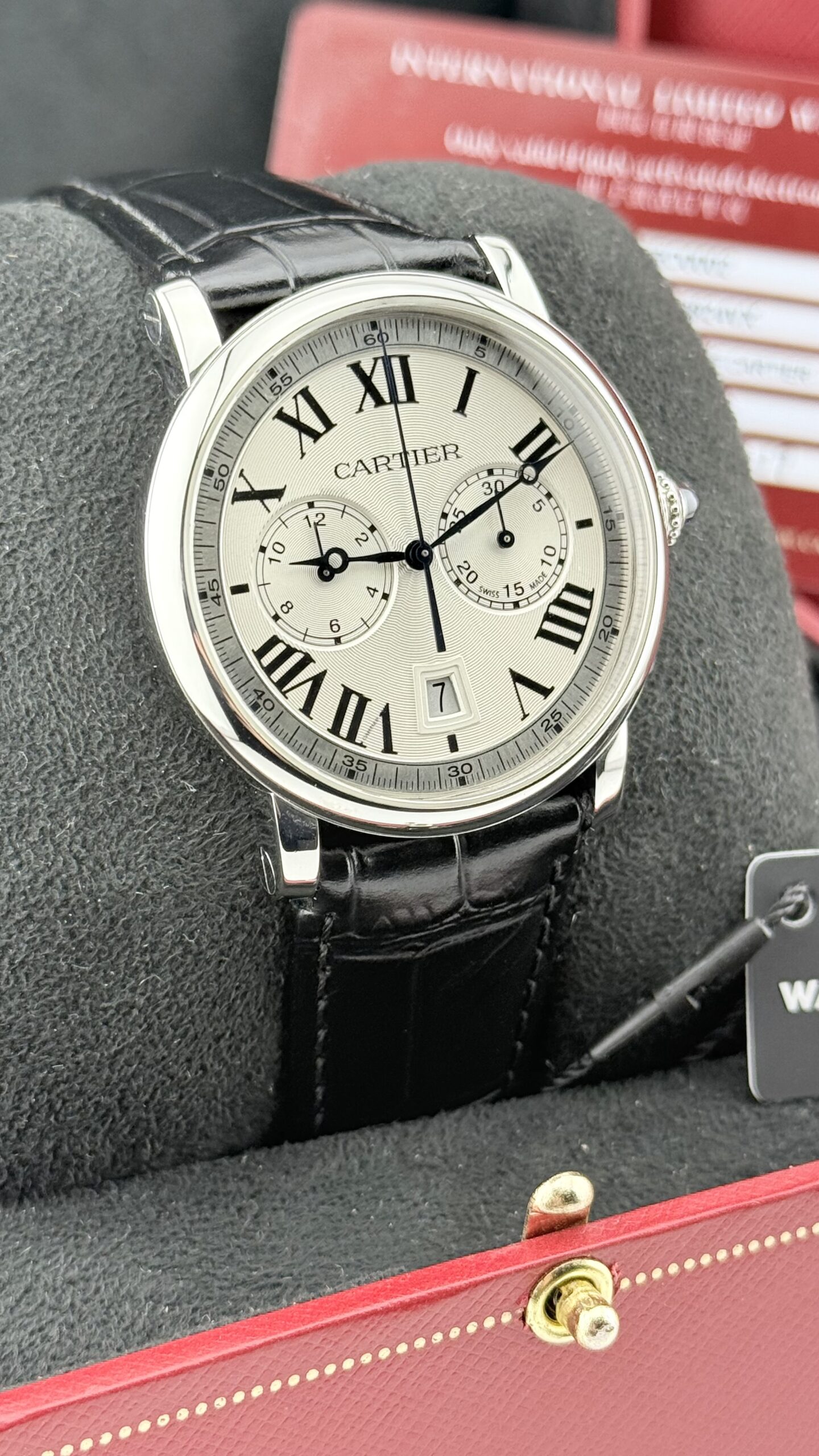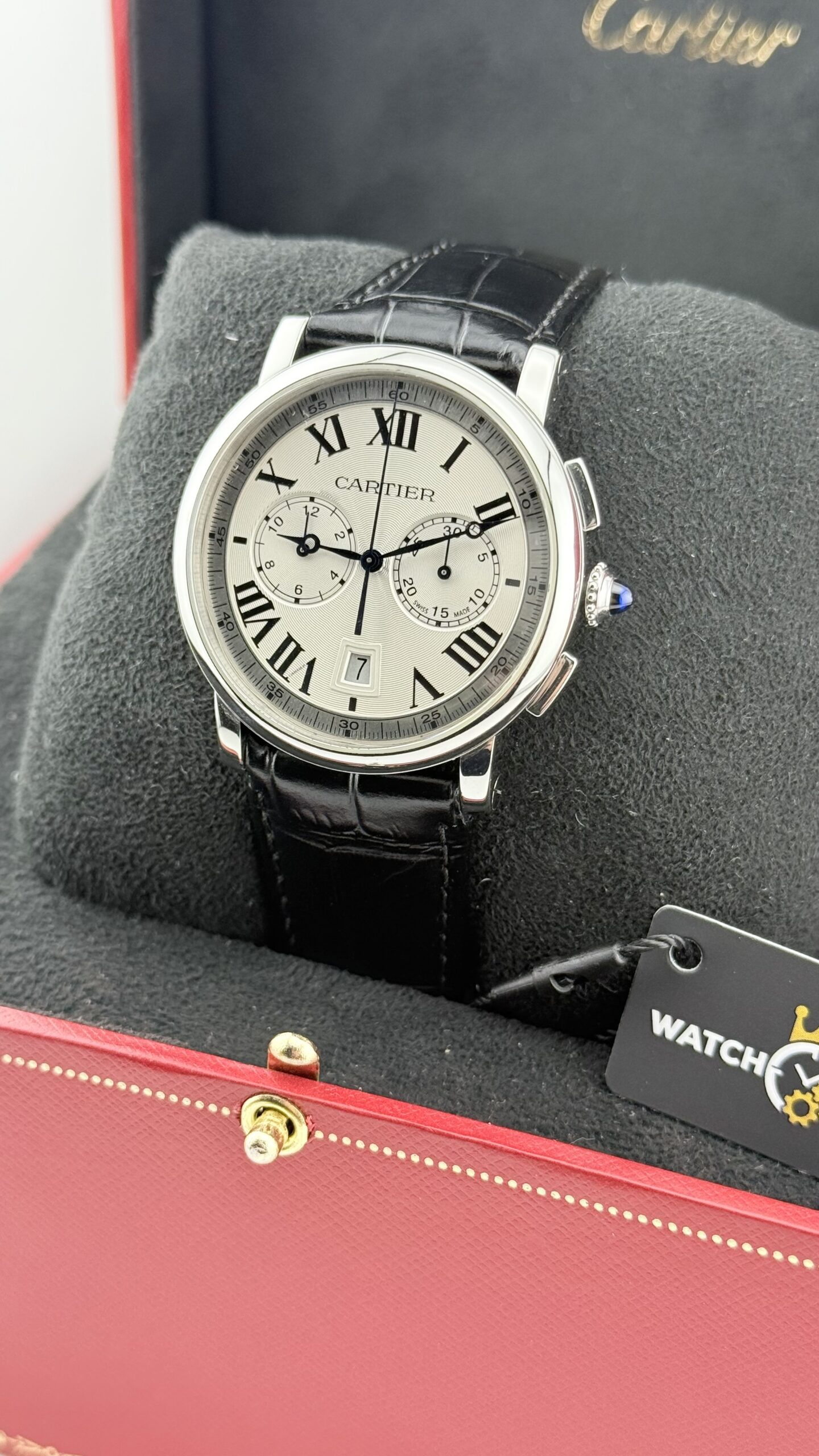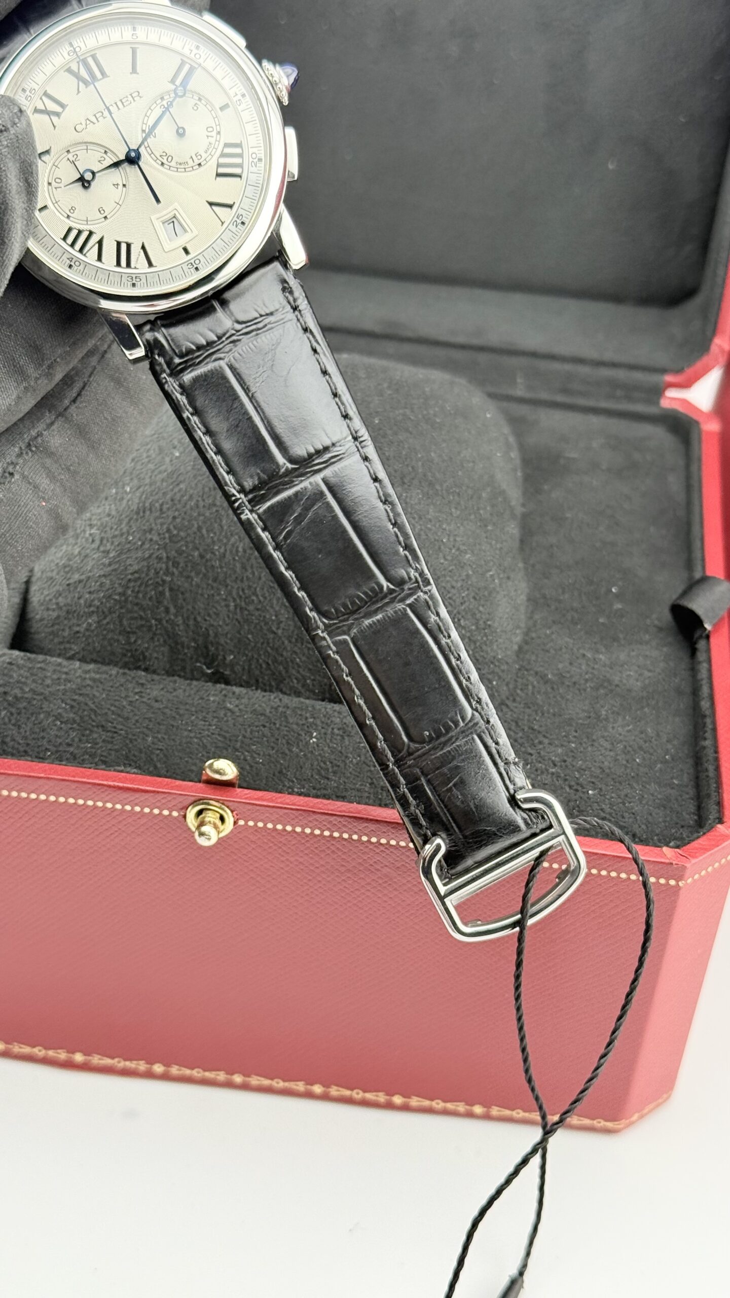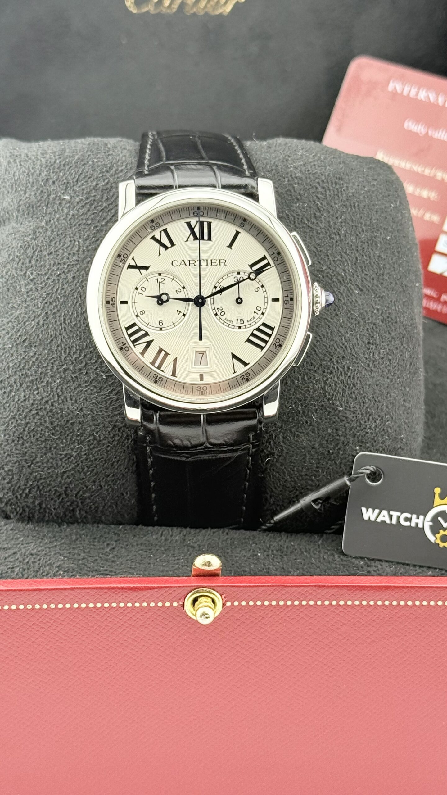 - Movimento: Cartier 1904-CH MC di manifattura, automatico; frequenza 28.800 a/h; doppio bariletto con riserva di carica ~48 ore; finiture Côtes de Genève.