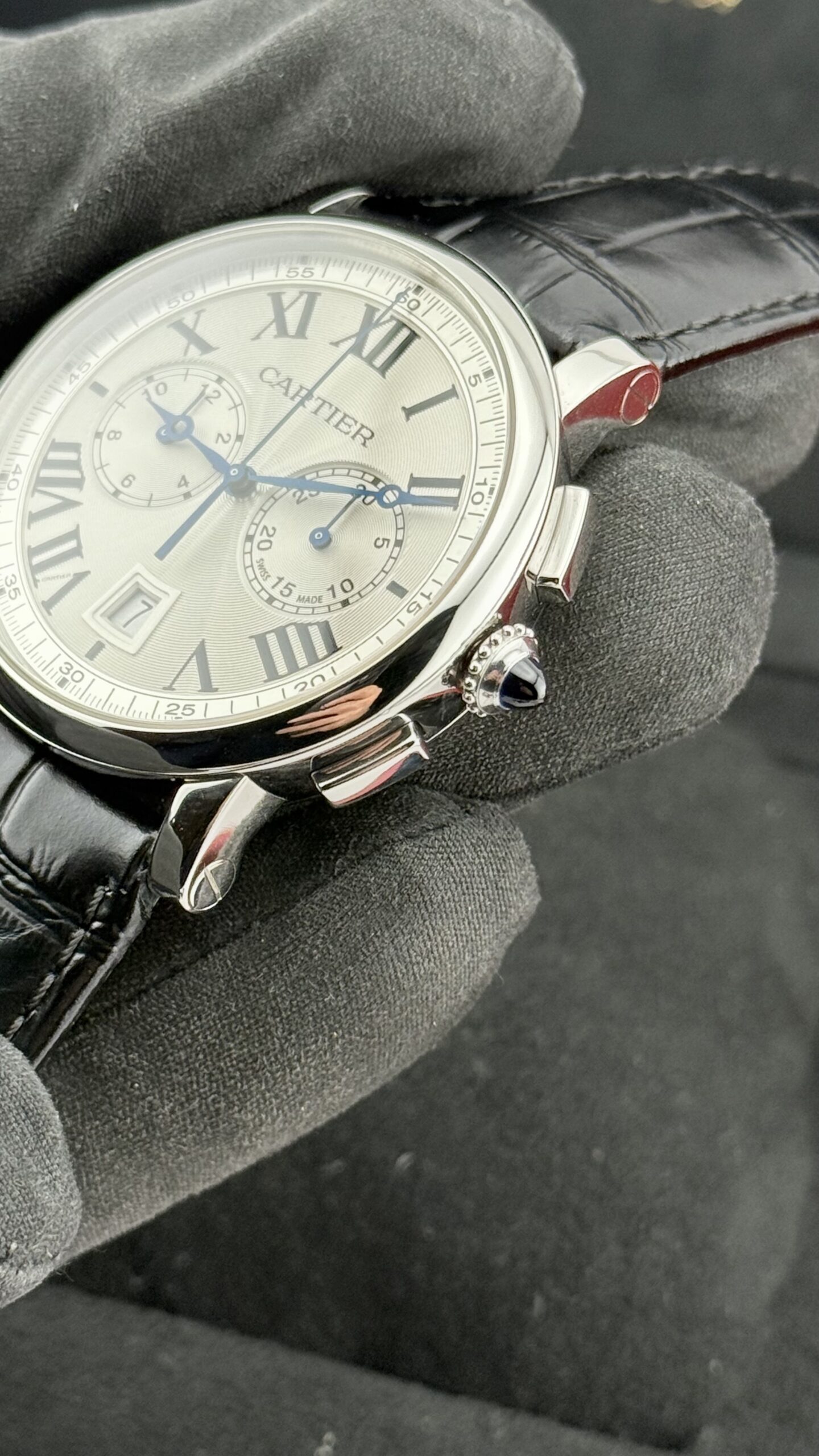 - Quadrante: argenté guilloché con numeri romani neri, minuteria “chemin de fer”, lancette a gladio azzurrate; layout cronografico bi-compax elegante e bilanciato.