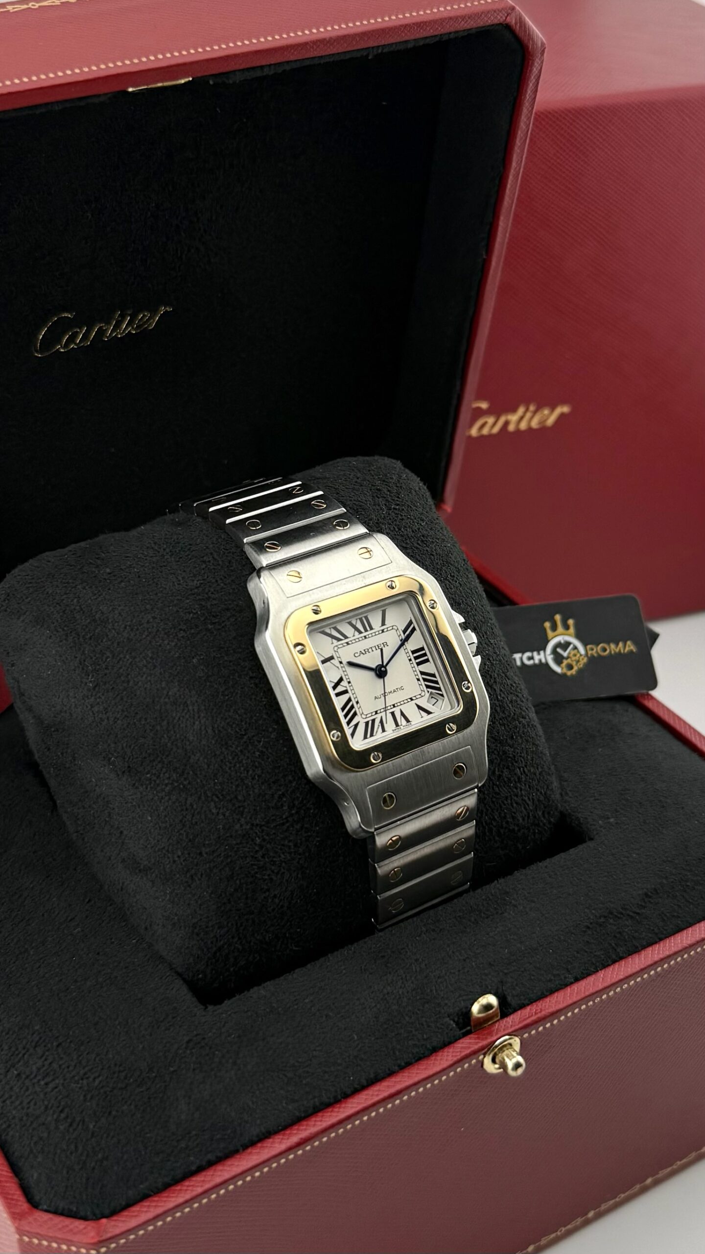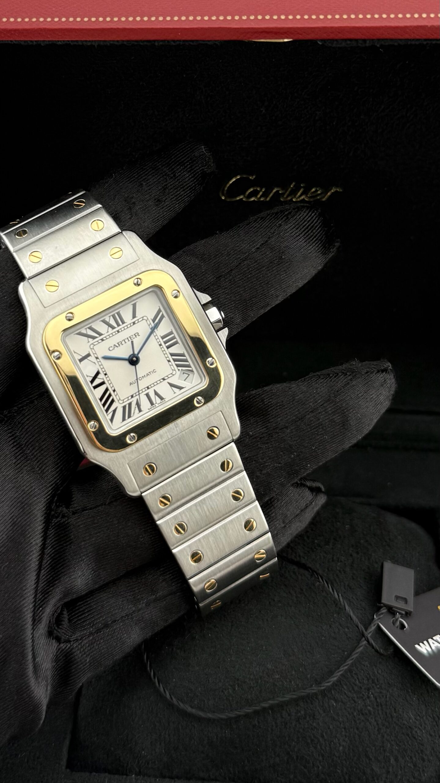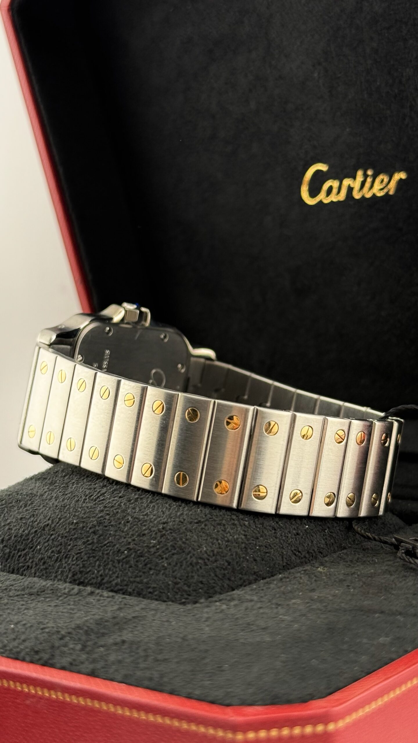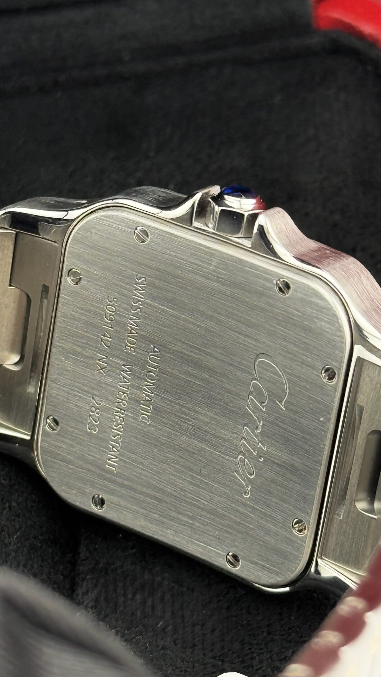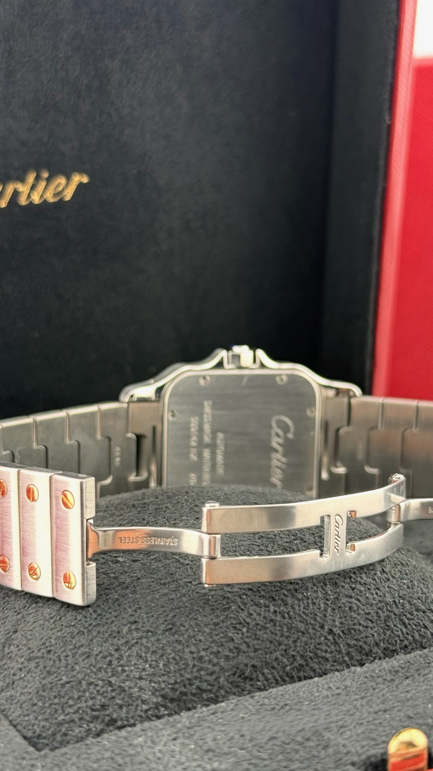 Sotto il cofano batte il Calibro Cartier 049, un movimento meccanico a carica automatica basato sulla prestigiosa architettura ETA 2892-A2. Questo movimento è stato scelto da Cartier per la sua estrema sottigliezza e precisione, permettendo all’orologio di mantenere un profilo elegante senza rinunciare alla complicazione del datario e alla massa oscillante bidirezionale. Il bracciale, elemento fondamentale dell’estetica Santos, è composto da maglie in acciaio con viti in oro giallo 18k che non sono semplici decorazioni, ma richiamano i rivetti delle carlinghe degli aerei dei primi del Novecento; la chiusura a scomparsa con doppio sblocco di sicurezza garantisce una continuità visiva perfetta su tutto il perimetro del polso.