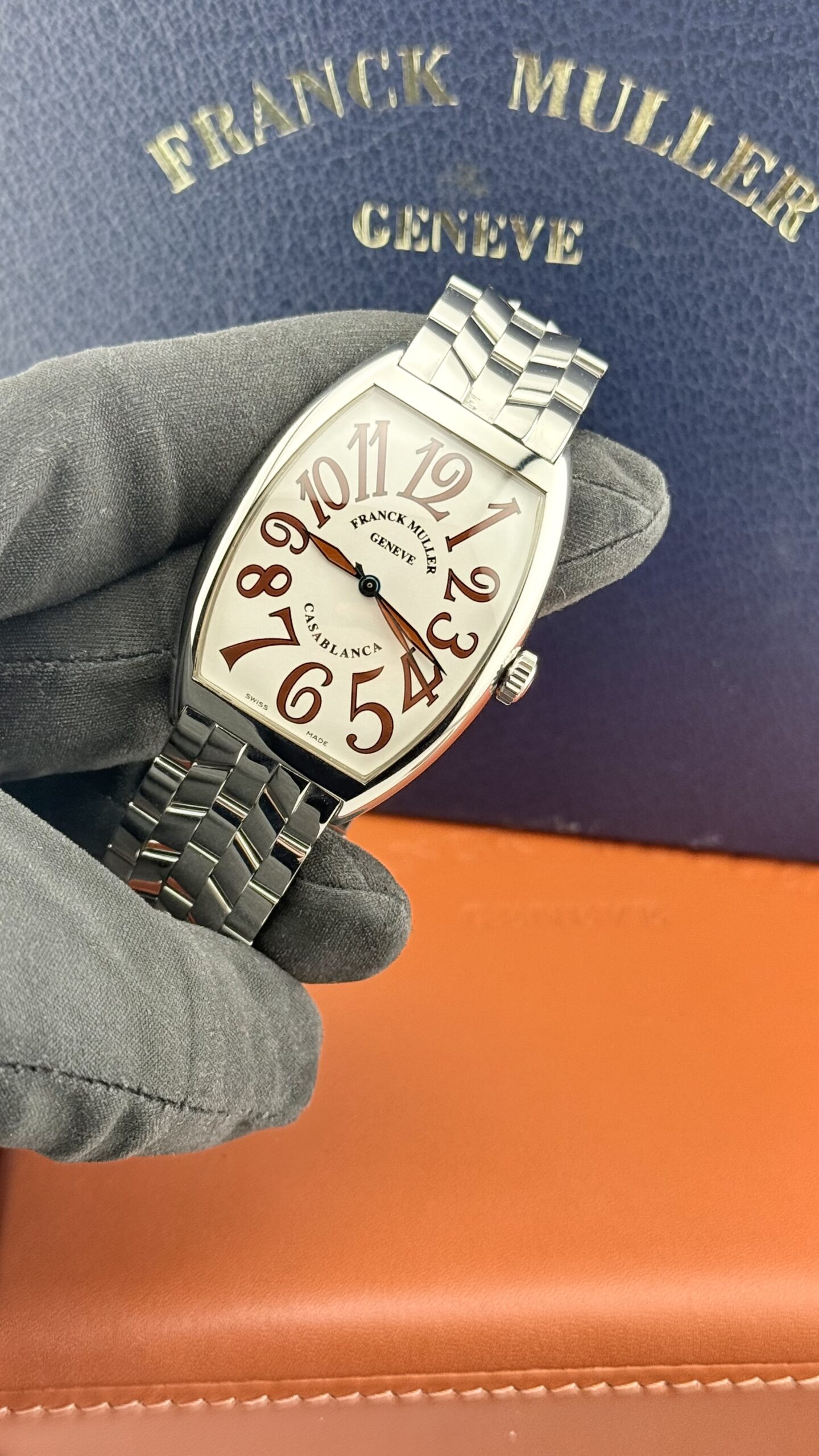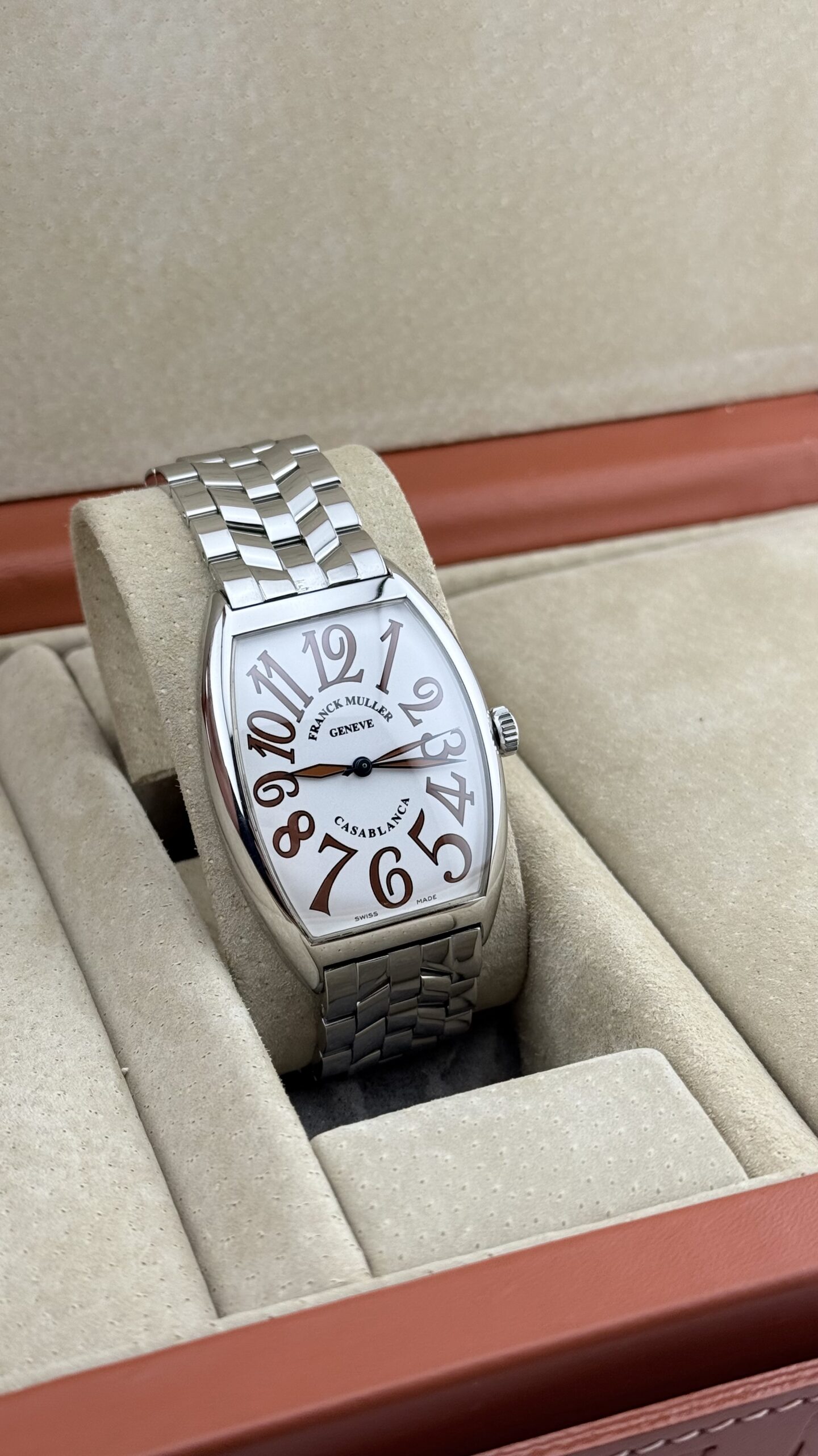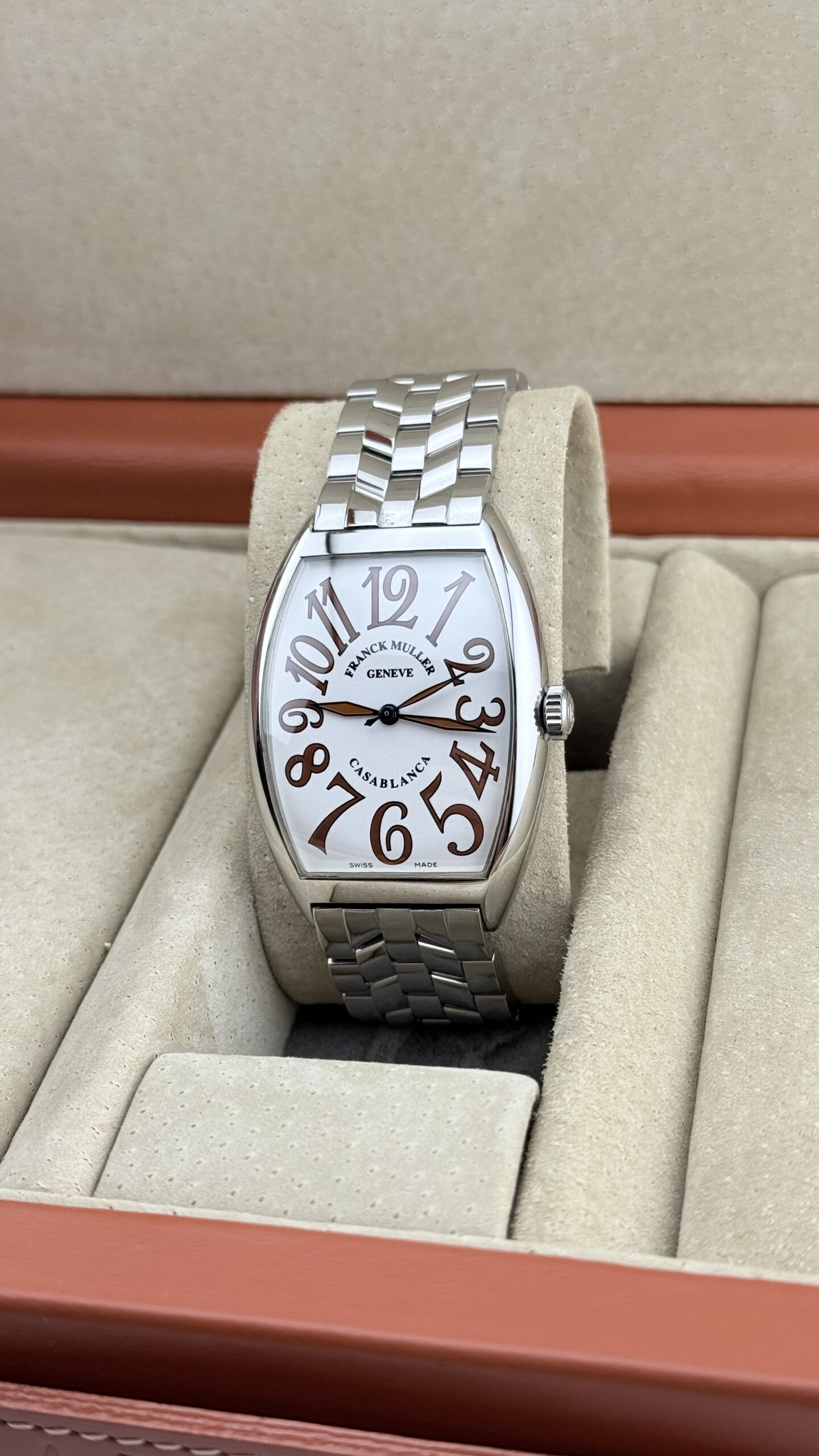 Franck Muller Curvex 6850 “Sahara” in acciaio, cassa tonneau ca. 32 × 45 mm, quadrante color sabbia matte con grandi numeri arabi, vetro zaffiro. Movimento automatico svizzero (ore/minuti/secondi), bracciale in acciaio originale FM. Orologio in ottime condizioni.