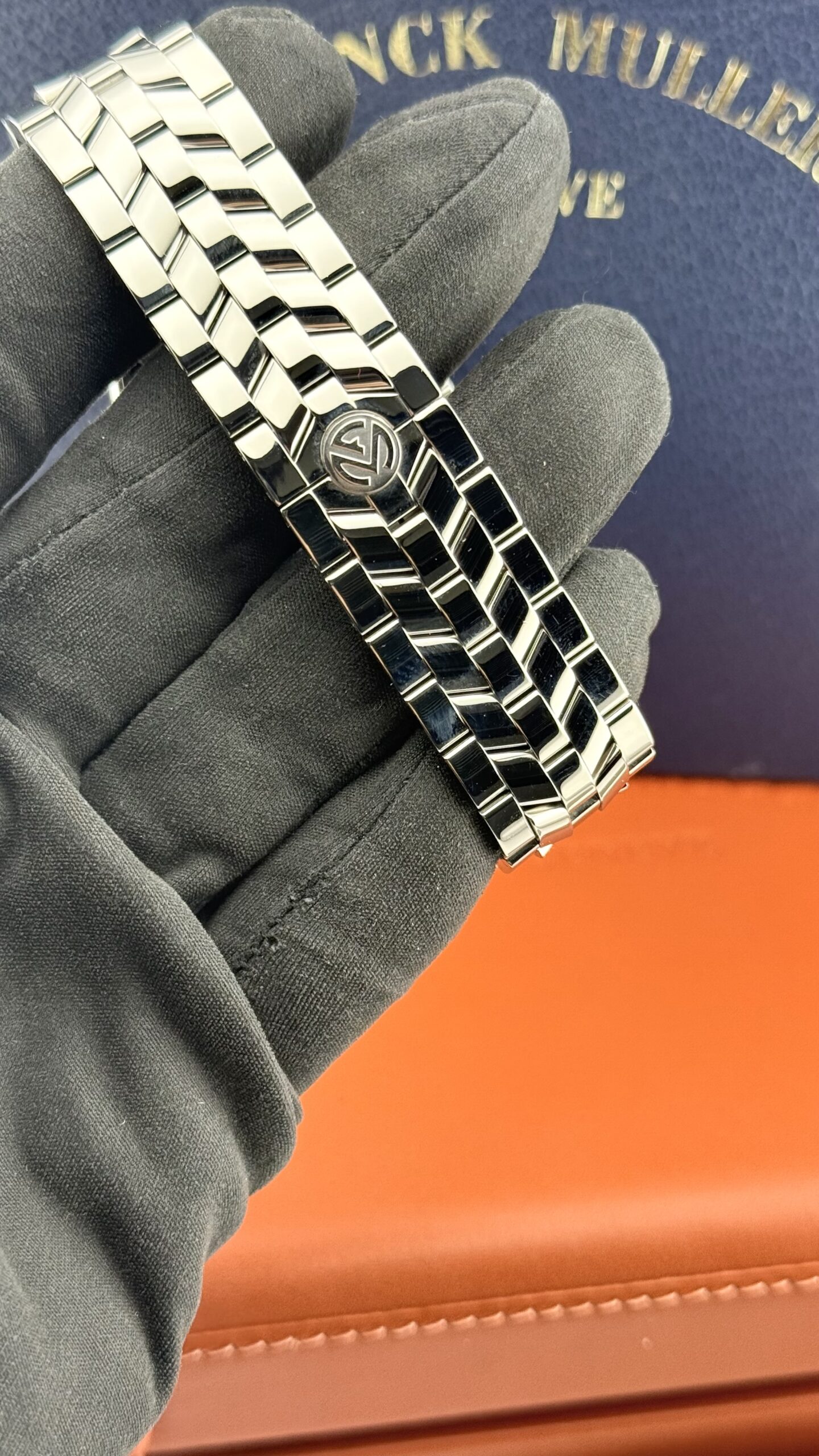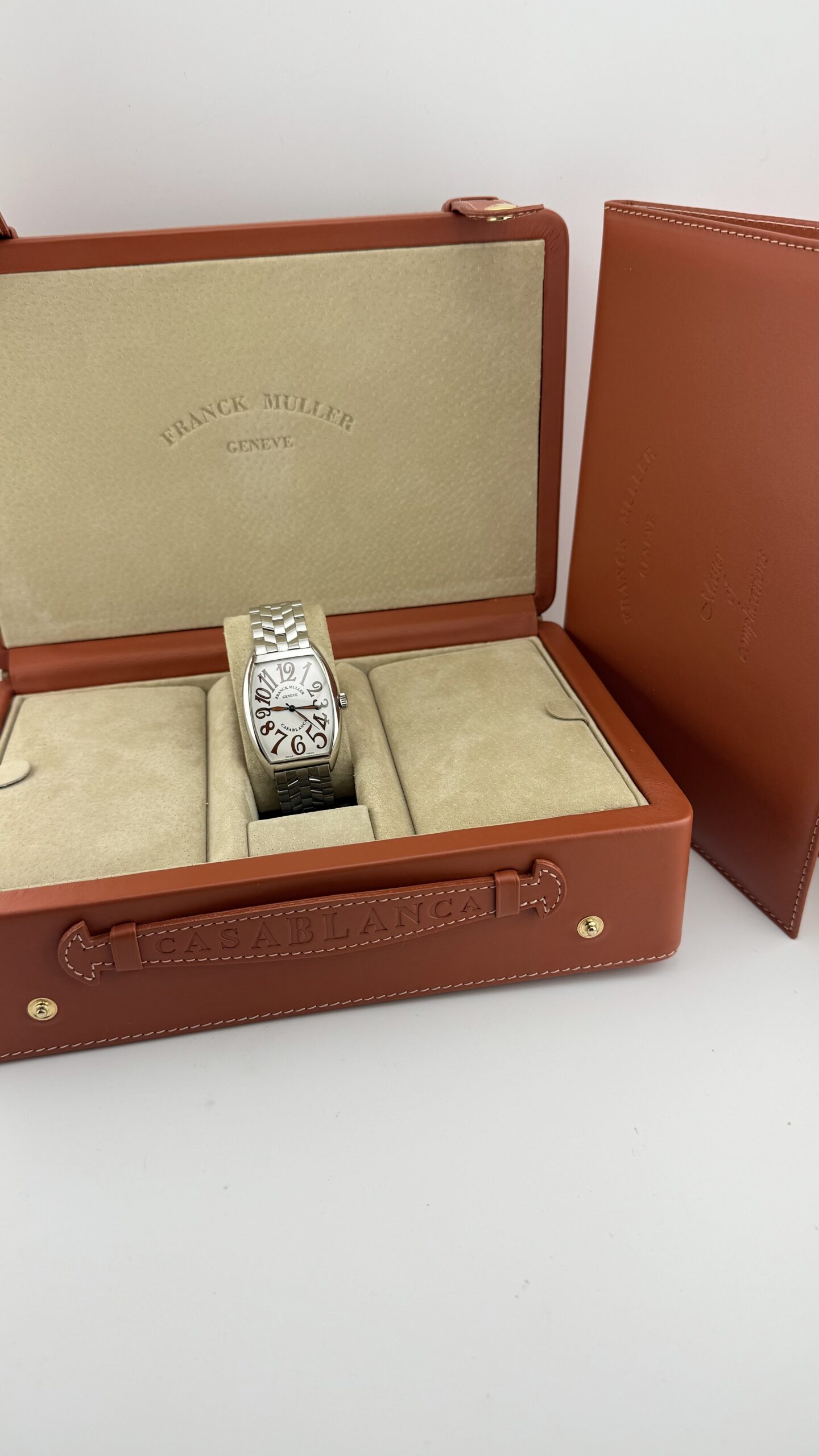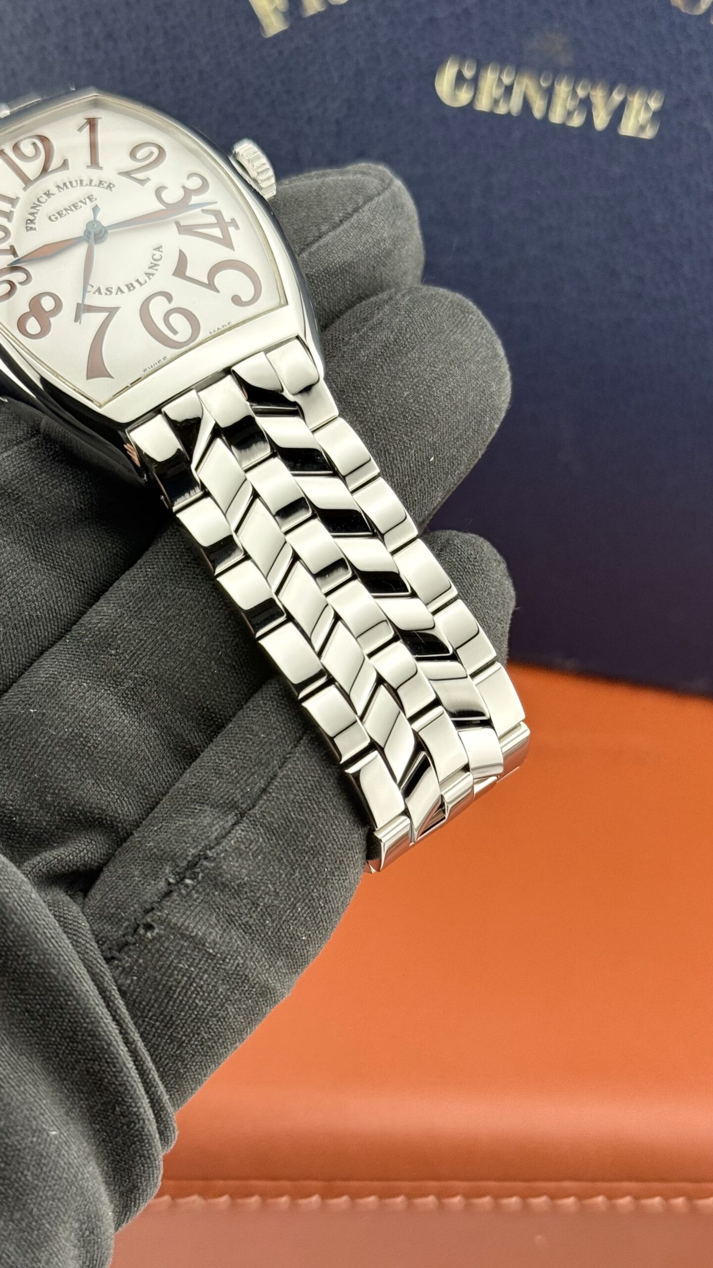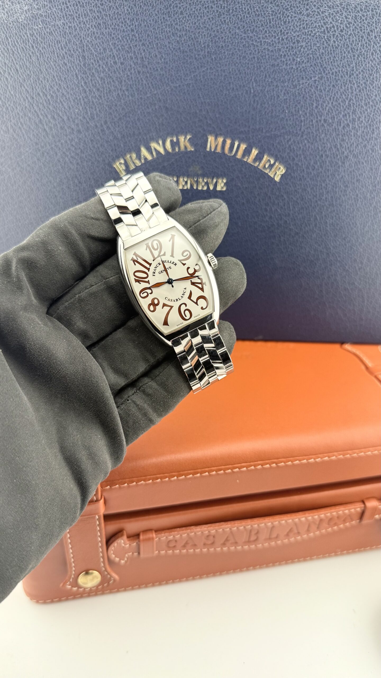 Franck Muller Curvex 6850 “Sahara” in acciaio, cassa tonneau ca. 32 × 45 mm, quadrante color sabbia matte con grandi numeri arabi, vetro zaffiro. Movimento automatico svizzero (ore/minuti/secondi), bracciale in acciaio originale FM. Orologio in ottime condizioni.