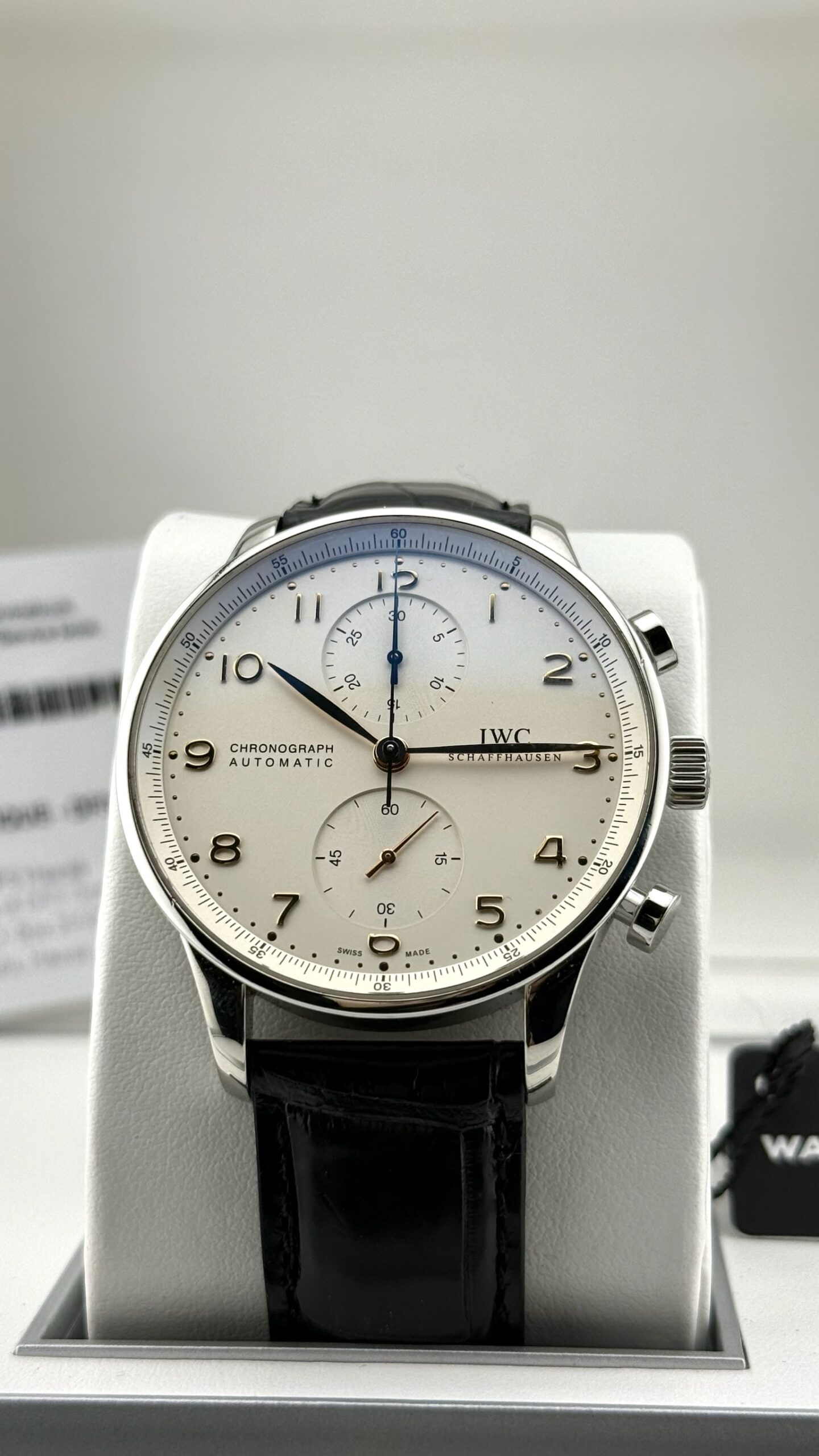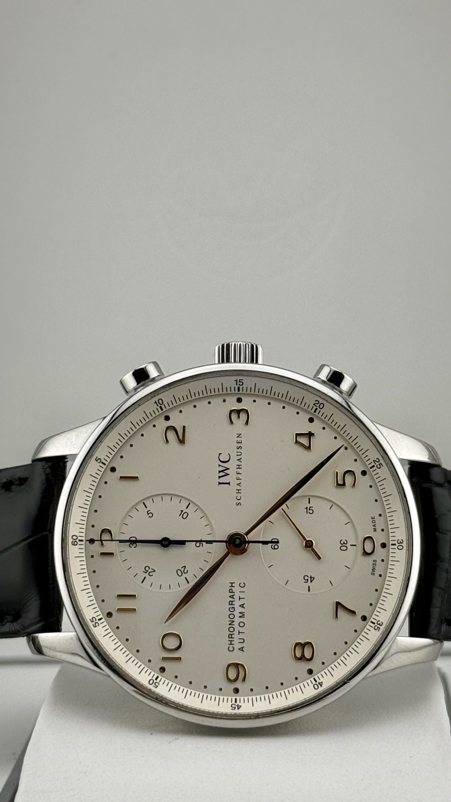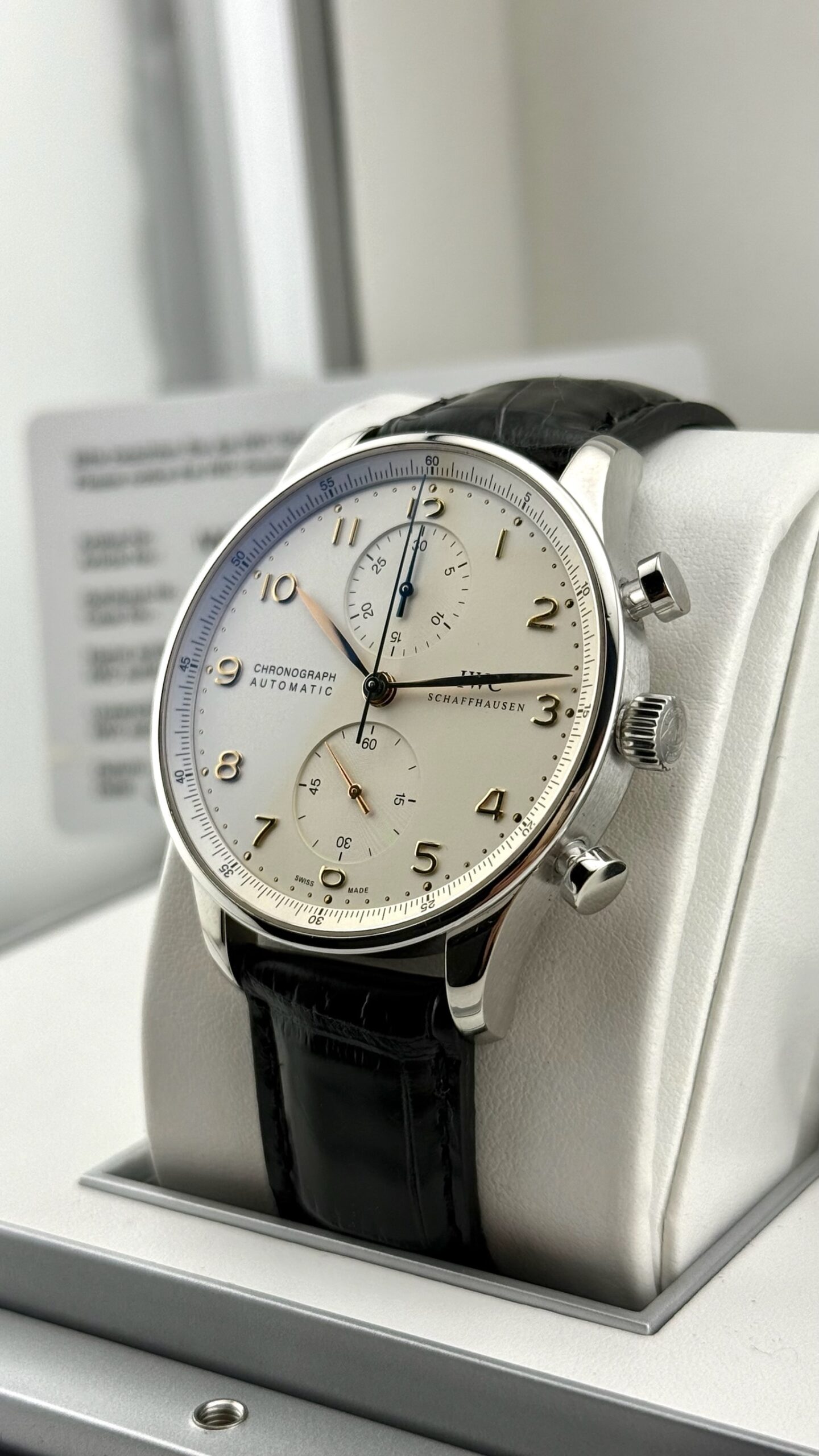 L’IWC Portugieser Chronograph è l’essenza dell’eleganza sportiva. Creato originariamente negli anni ’30 per soddisfare la richiesta di due mercanti portoghesi che desideravano la precisione di un cronometro da marina in un formato da polso, questo modello ne mantiene intatto il DNA. Il design è definito dalla sua lunetta sottilissima, che lascia quasi tutto lo spazio al quadrante, rendendo l’orologio visivamente più grande e leggibile. Il quadrante è di un raffinato colore argenté con numeri arabi applicati in oro (o finitura dorata) e le iconiche lancette a foglia (feuille) coordinate.