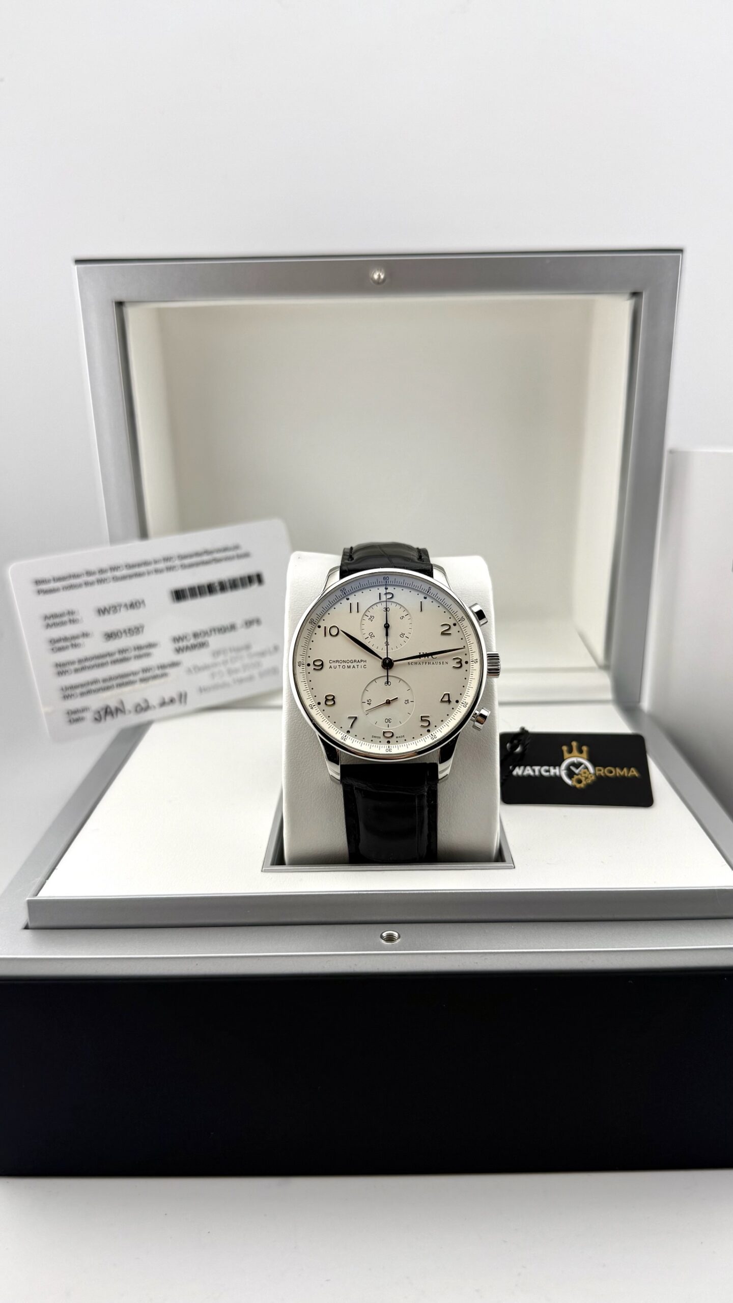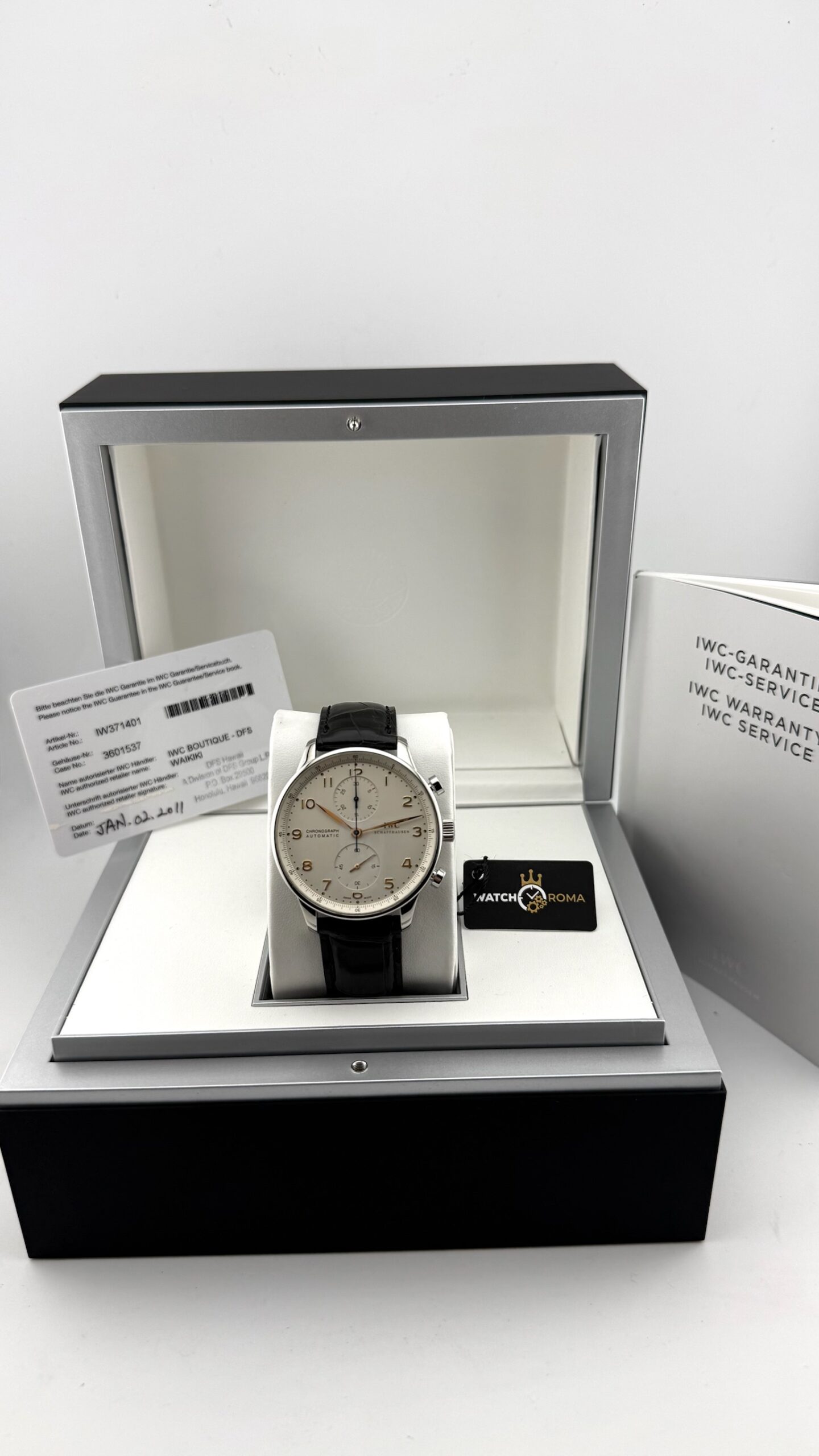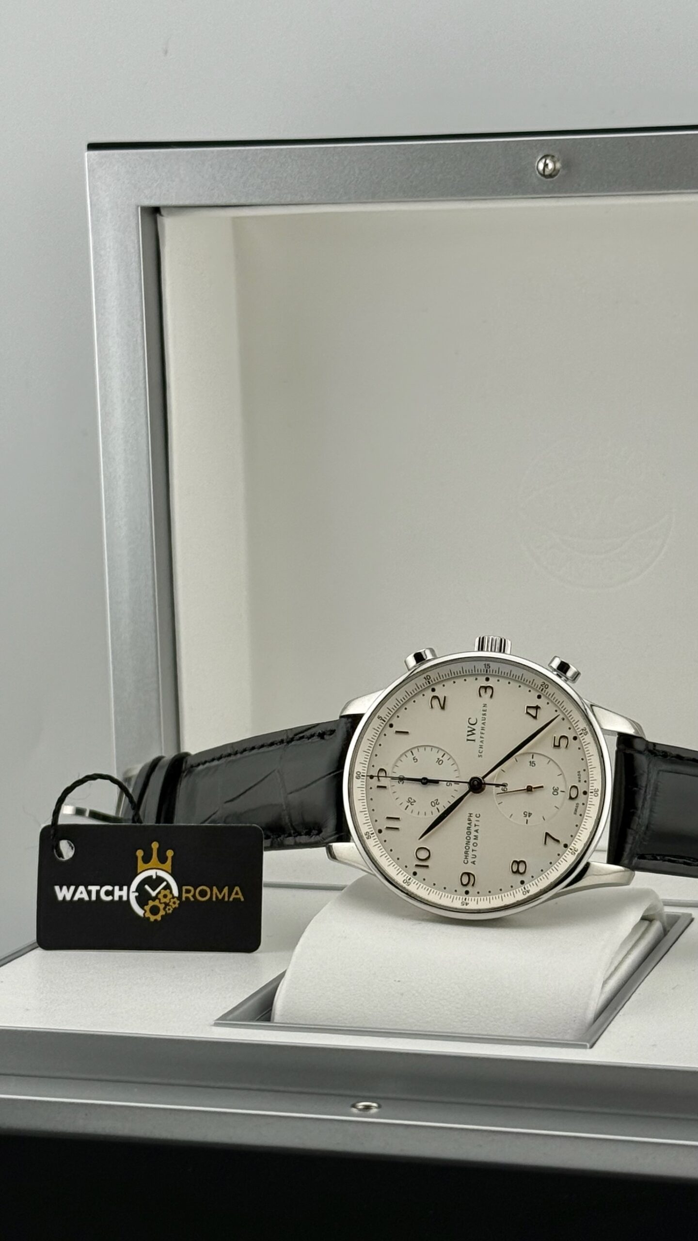L’IWC Portugieser Chronograph è l’essenza dell’eleganza sportiva. Creato originariamente negli anni ’30 per soddisfare la richiesta di due mercanti portoghesi che desideravano la precisione di un cronometro da marina in un formato da polso, questo modello ne mantiene intatto il DNA. Il design è definito dalla sua lunetta sottilissima, che lascia quasi tutto lo spazio al quadrante, rendendo l’orologio visivamente più grande e leggibile. Il quadrante è di un raffinato colore argenté con numeri arabi applicati in oro (o finitura dorata) e le iconiche lancette a foglia (feuille) coordinate.