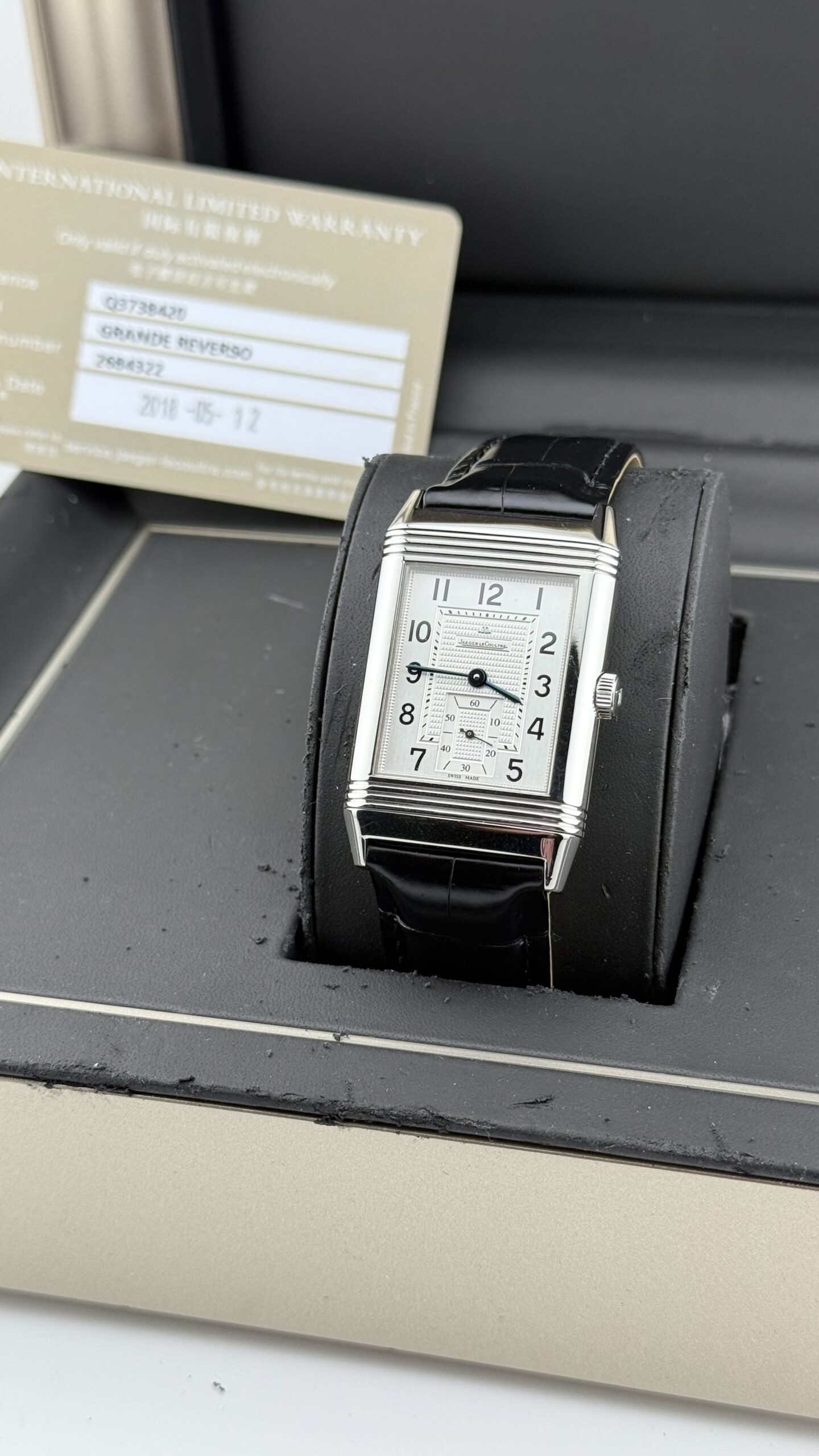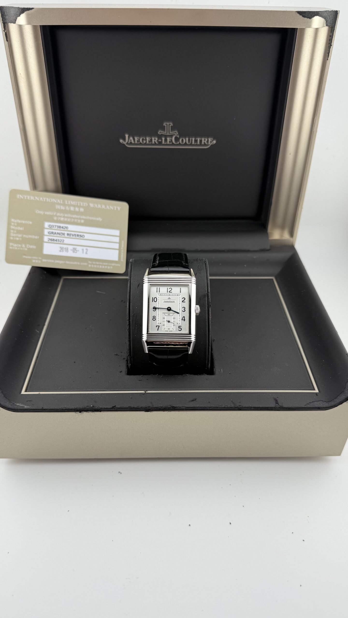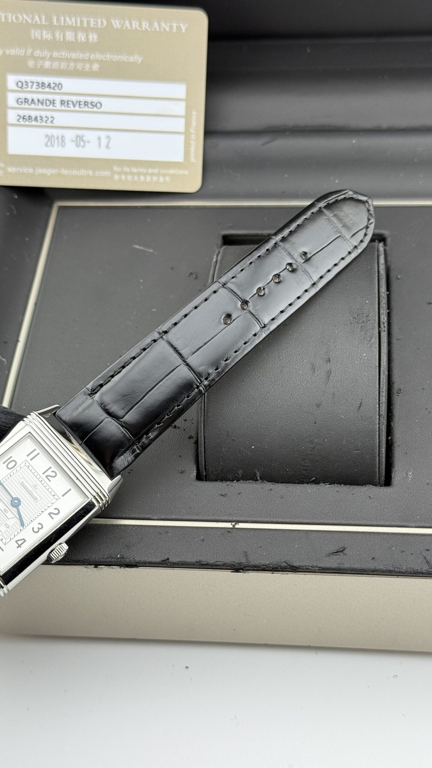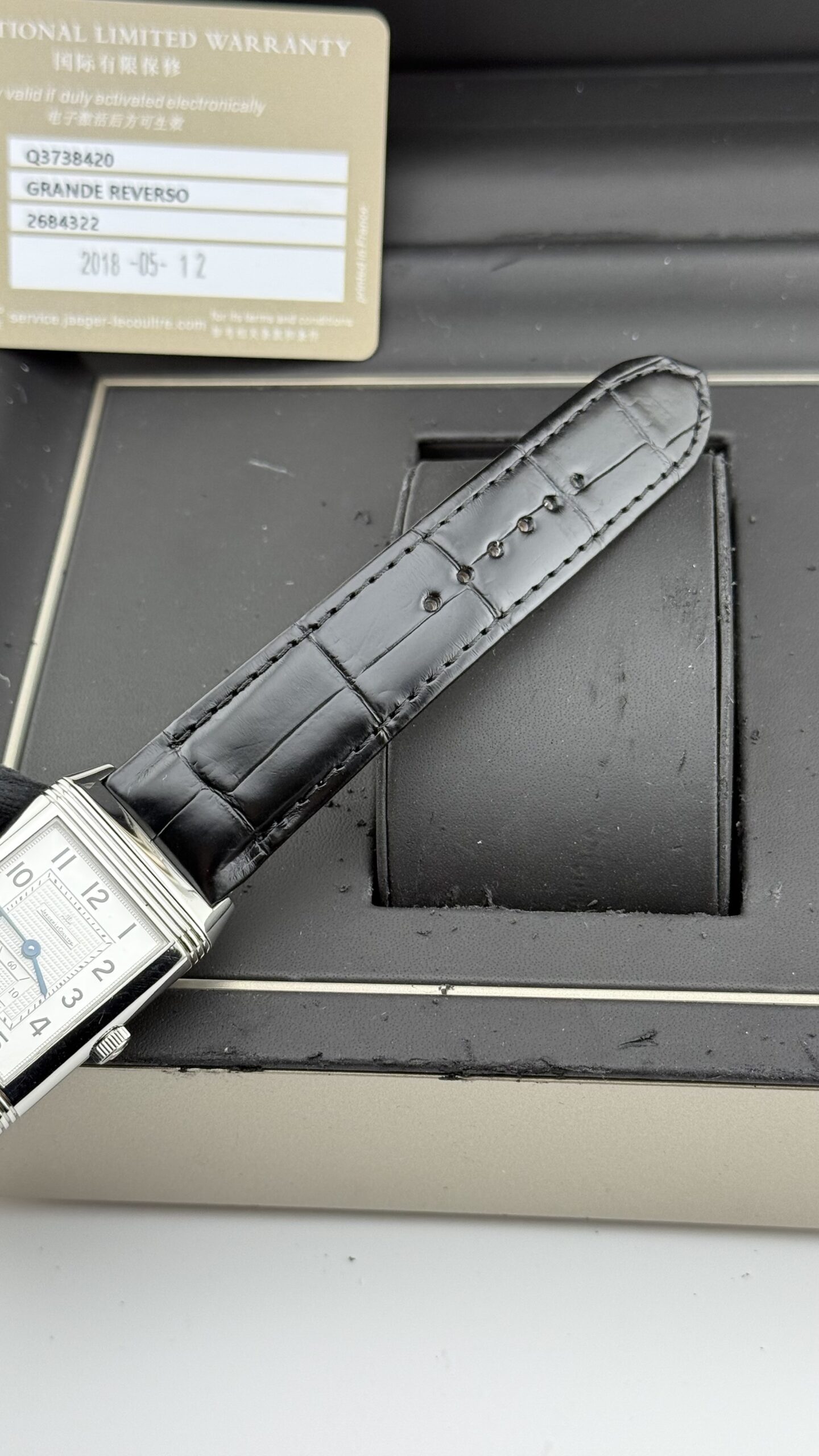 Esclusivo Jaeger‑LeCoultre Grande Reverso 976 (Ref. Q3738420) in acciaio inox, orologio iconico con cassa reversibile ispirata al design Art Déco del 1931.Questo modello da 30 × 48,5 mm ospita il calibro JLC 976 a carica manuale, visibile attraverso il fondello in zaffiro, con riserva di carica fino a 48 ore.Il quadrante argenté guilloché è impreziosito da numeri arabi neri, piccoli secondi e lancette azzurrate, un equilibrio perfetto tra sobrietà e raffinatezza.Cinturino in pelle di alligatore con chiusura deployante firmata.L’orologio è certificato autentico, corredato di scatola originale e documenti (specificare se presenti), e garantito perfettamente funzionante.