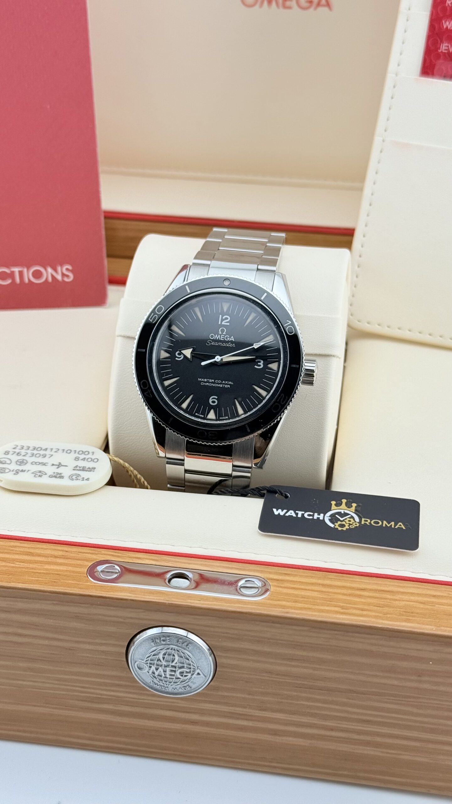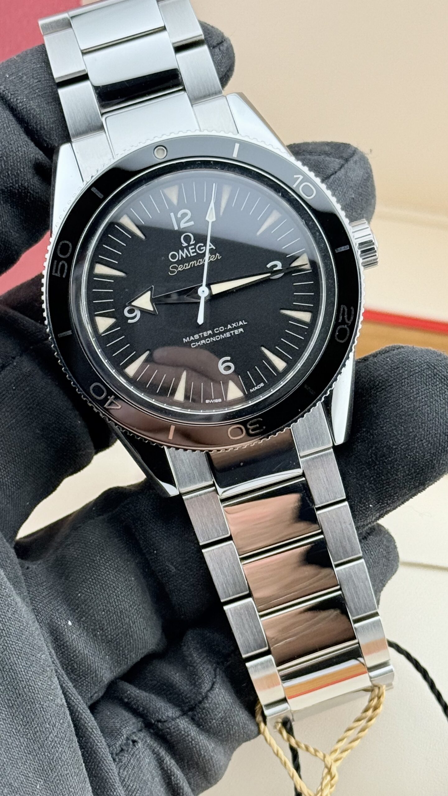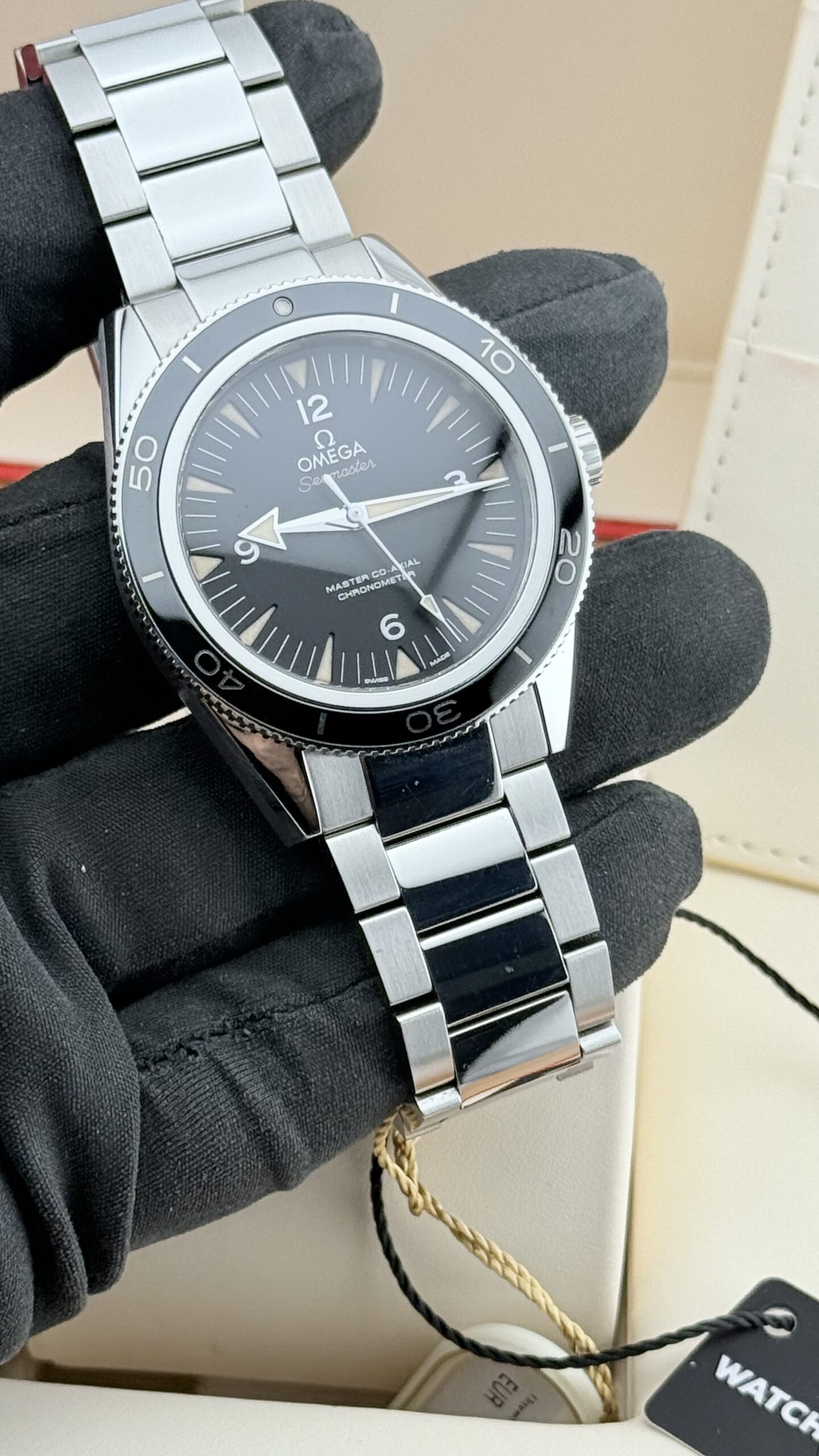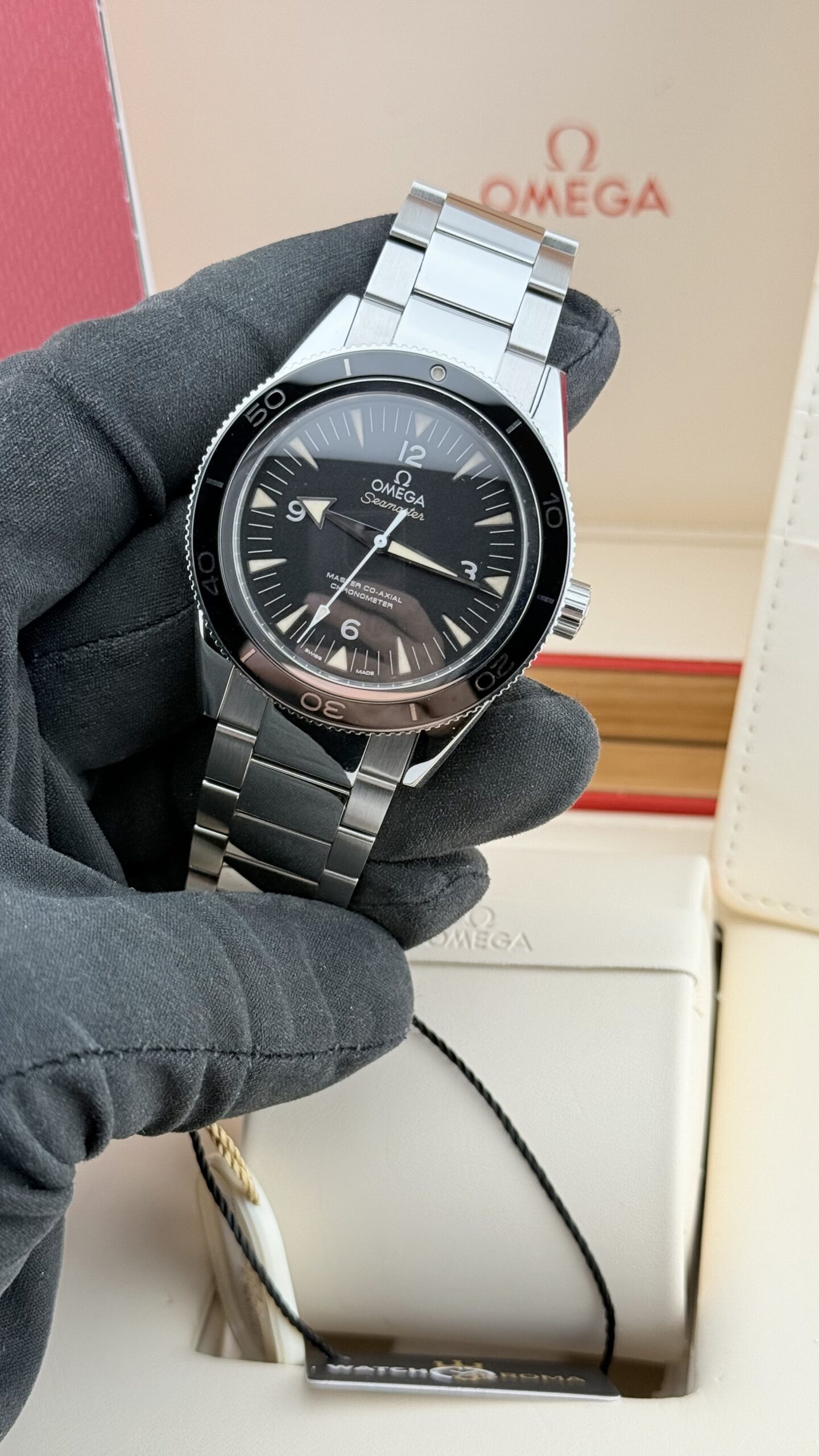 Iconico diver sportivo-elegante da 41 mm in acciaio 316L. Ghiera girevole unidirezionale in ceramica nera con scala subacquea, vetro zaffiro bombato con trattamento antiriflesso, quadrante nero con scala a onde e indici luminosi. Movimento automatico Co‑Axial Master Chronometer (precisione e resistenza magnetica), corona a vite e valvola per l’elio. Impermeabilità 300 m. Design versatile, adatto sia alle immersioni che all’uso quotidiano.
