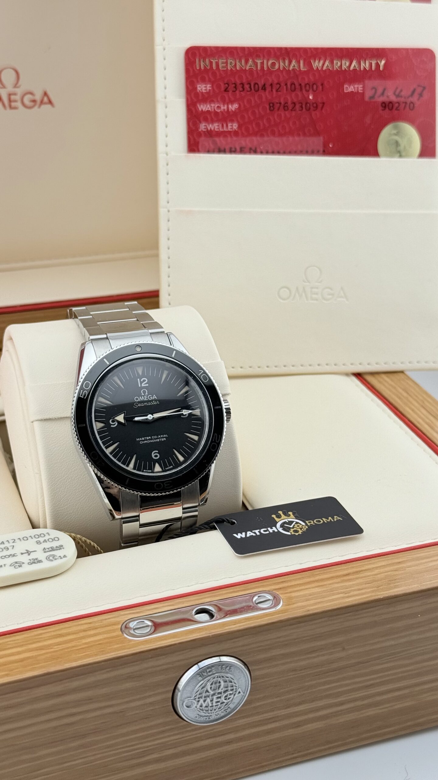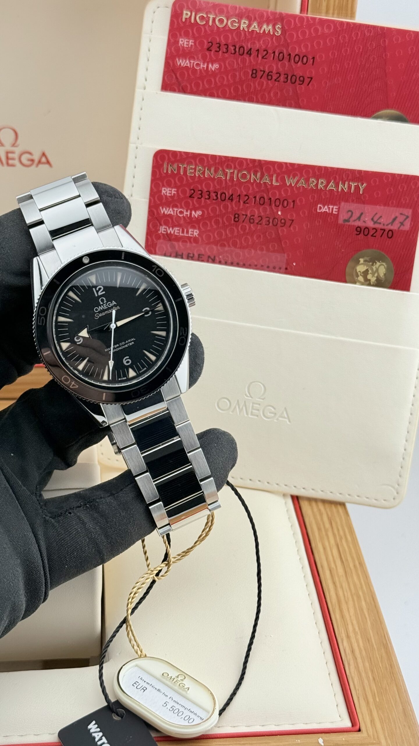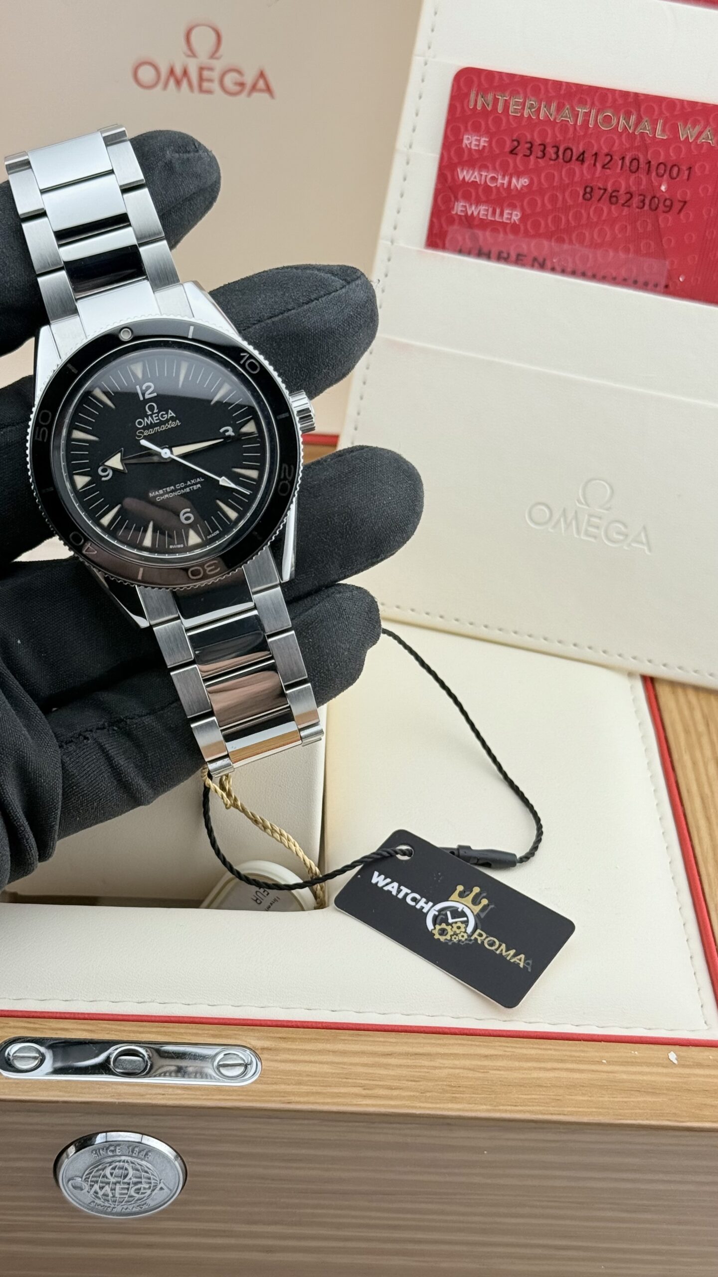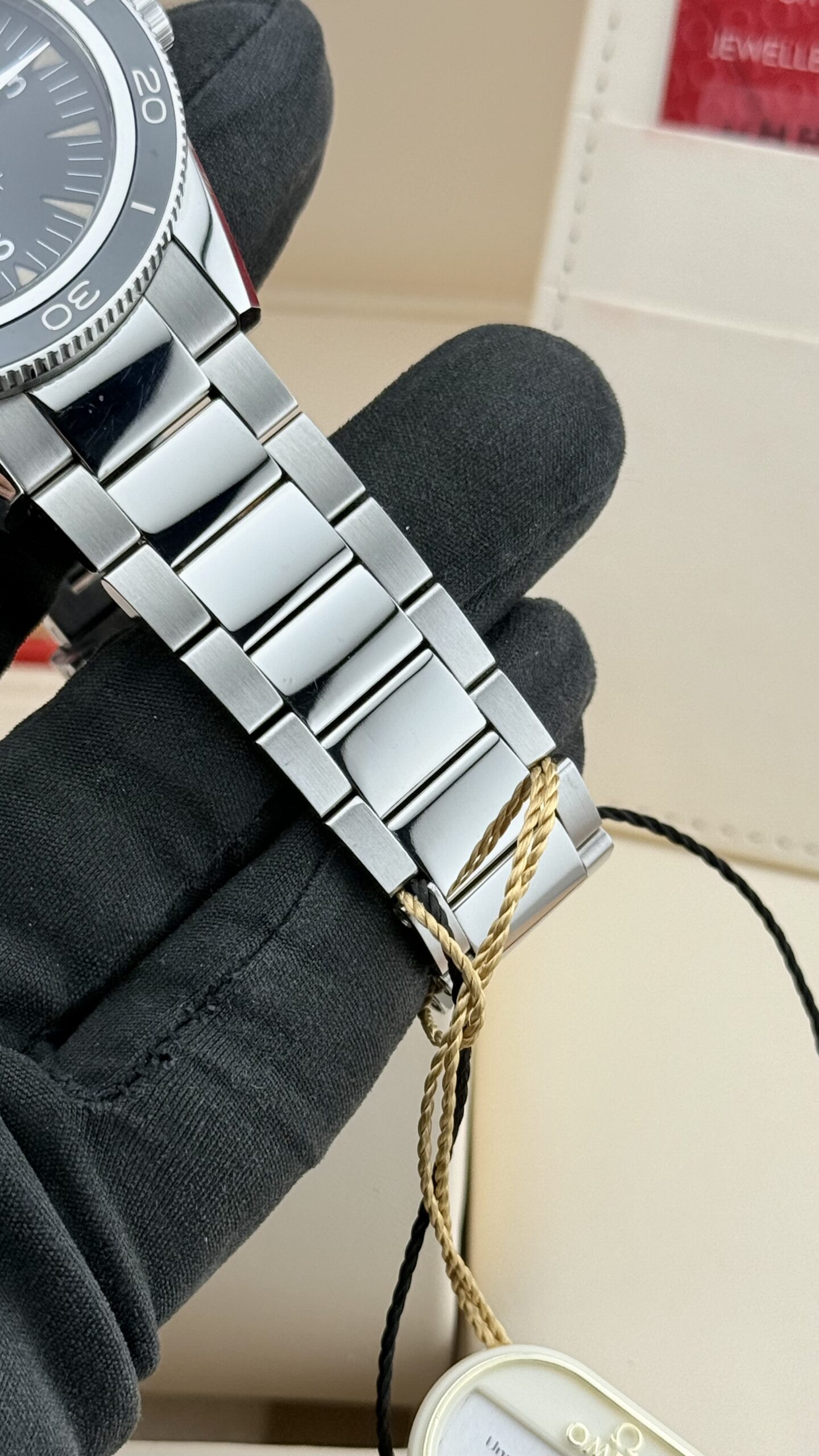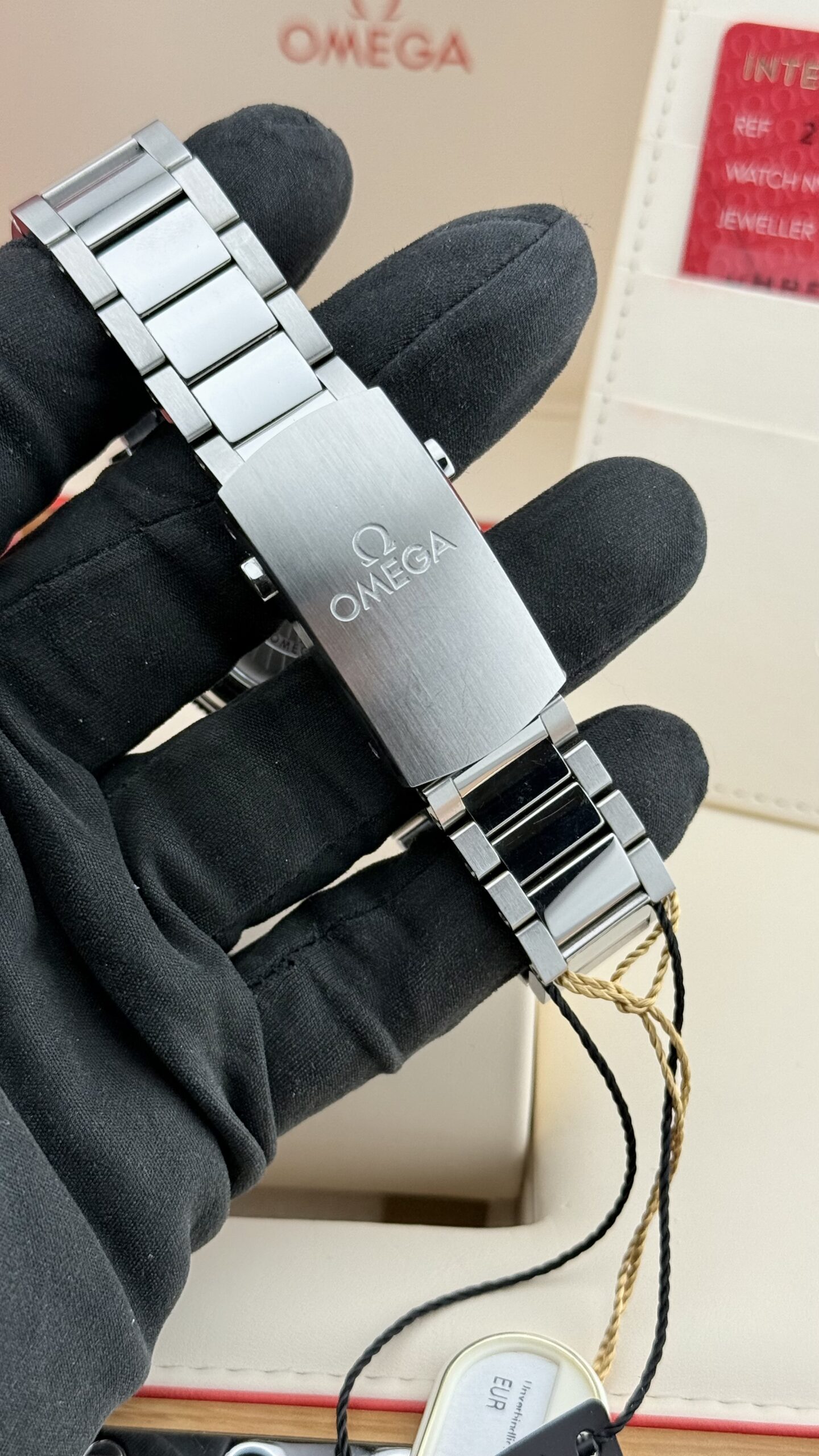 Iconico diver sportivo-elegante da 41 mm in acciaio 316L. Ghiera girevole unidirezionale in ceramica nera con scala subacquea, vetro zaffiro bombato con trattamento antiriflesso, quadrante nero con scala a onde e indici luminosi. Movimento automatico Co‑Axial Master Chronometer (precisione e resistenza magnetica), corona a vite e valvola per l’elio. Impermeabilità 300 m. Design versatile, adatto sia alle immersioni che all’uso quotidiano.