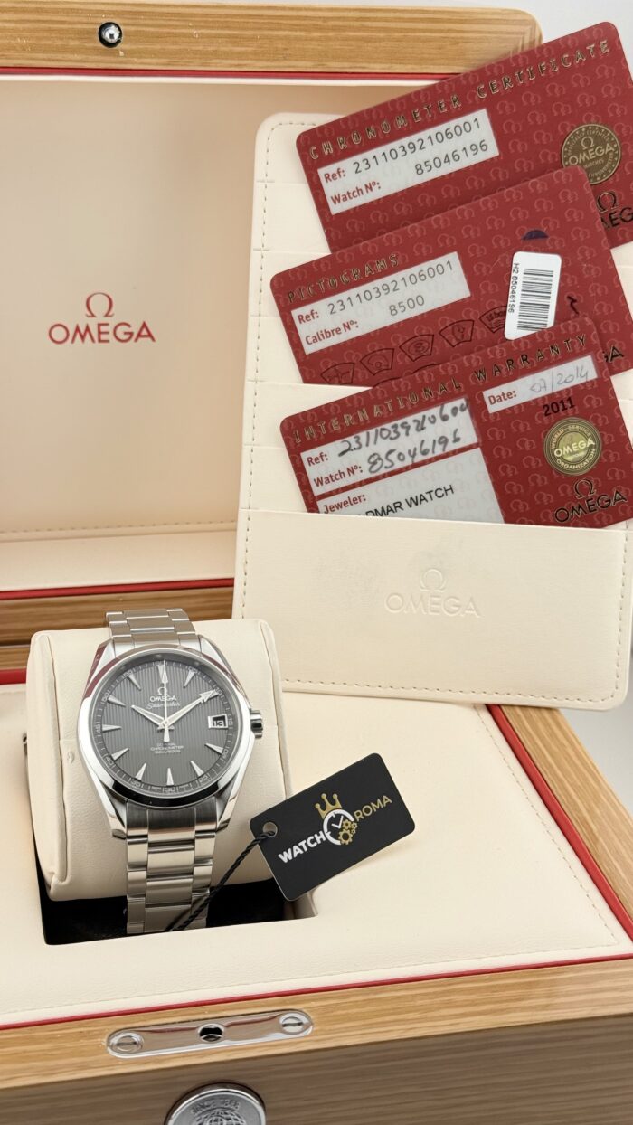 Omega Seamaster Aqua Terra ref. 231.10.39.21.06.001, un perfetto equilibrio tra eleganza e sportività. Cassa in acciaio da 39 mm, quadrante grigio “teak” verticale con indici applicati e data a ore 3, lancette sfaccettate con Super‑LumiNova per ottima leggibilità. Al suo interno batte il movimento automatico Omega Co‑Axial calibro 8500, conosciuto per precisione, robustezza e manutenzione estesa. Fondello a vista con vetro zaffiro per ammirare la finitura del movimento. Bracciale in acciaio con finitura mista e chiusura deployante sicura. Orologio versatile, ideale per l’uso quotidiano e occasioni formali.