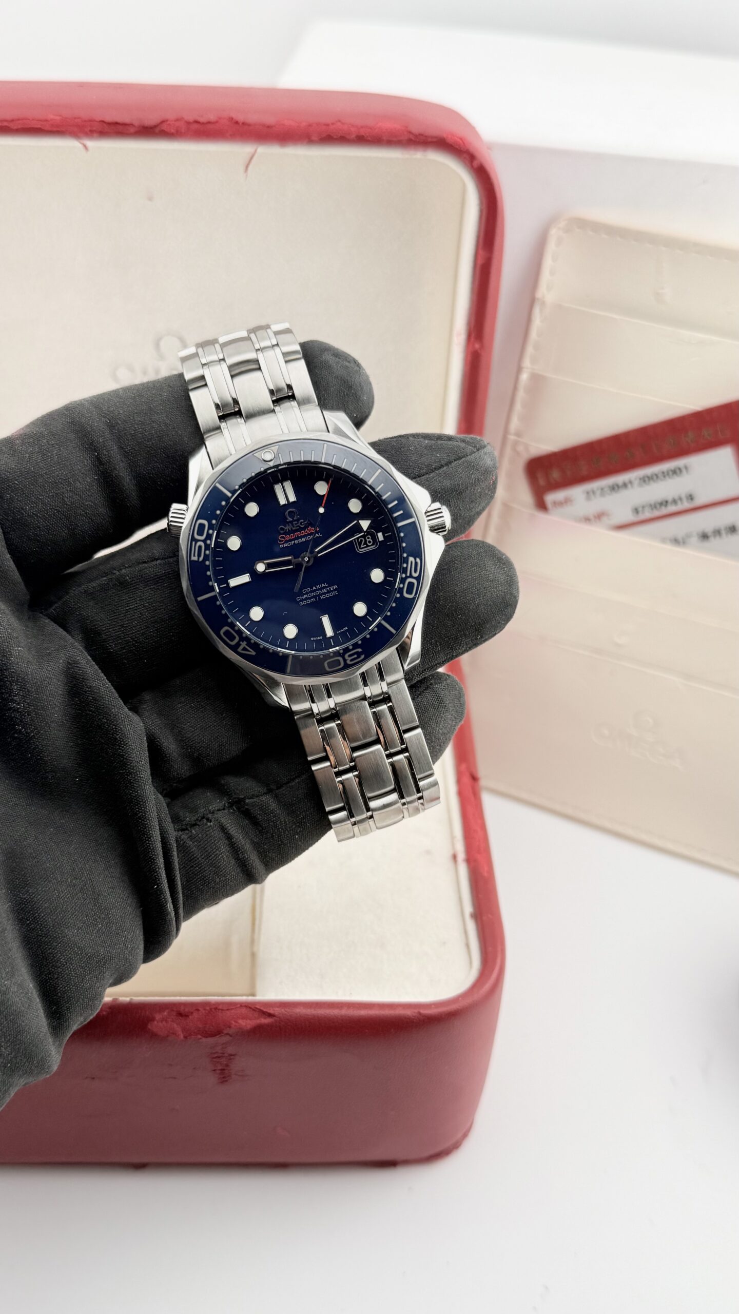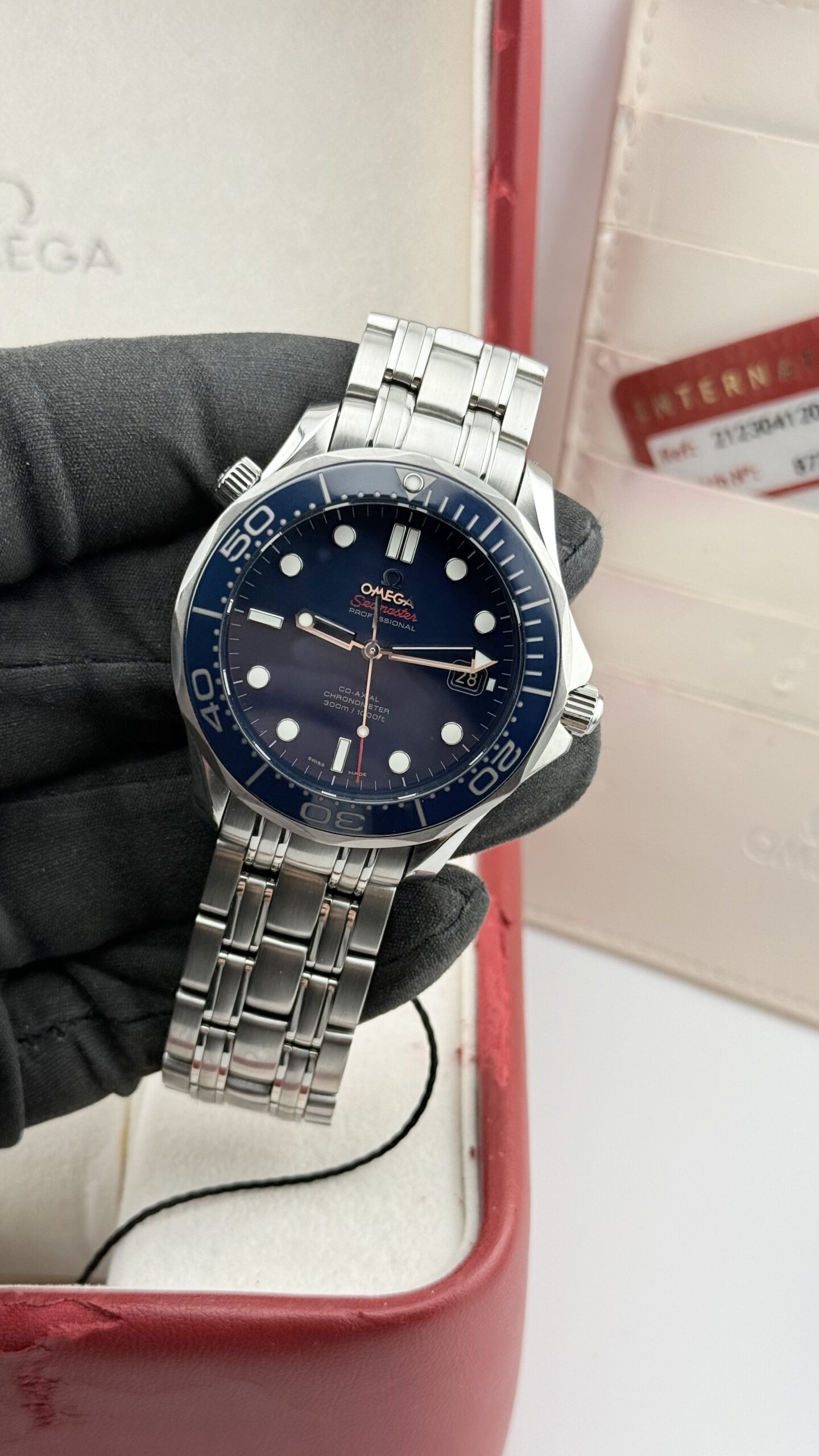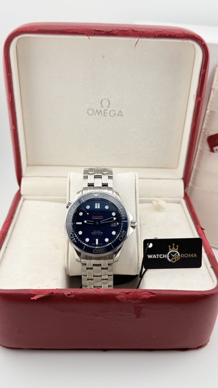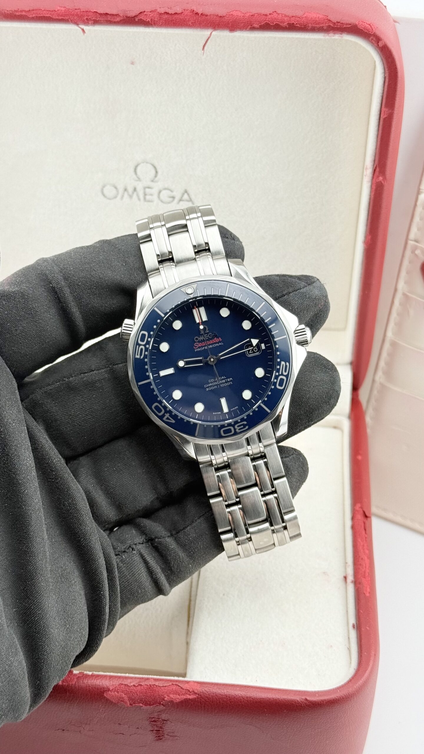 Omega Seamaster Professional 300M Co‑Axial 41 mm – ref. 212.30.41.20.03.001. Un classico moderno dell’orologeria sportiva: robusto, preciso e immediatamente riconoscibile grazie al quadrante blu con motivo a onde, alla lunetta in ceramica e alla valvola dell’elio a ore 10. Nato per il mare, perfetto per l’uso quotidiano grazie al movimento co‑axial e al bracciale in acciaio dal comfort eccezionale.