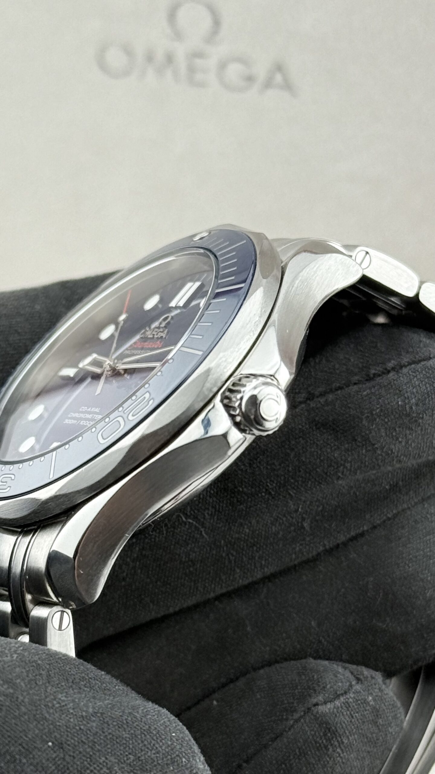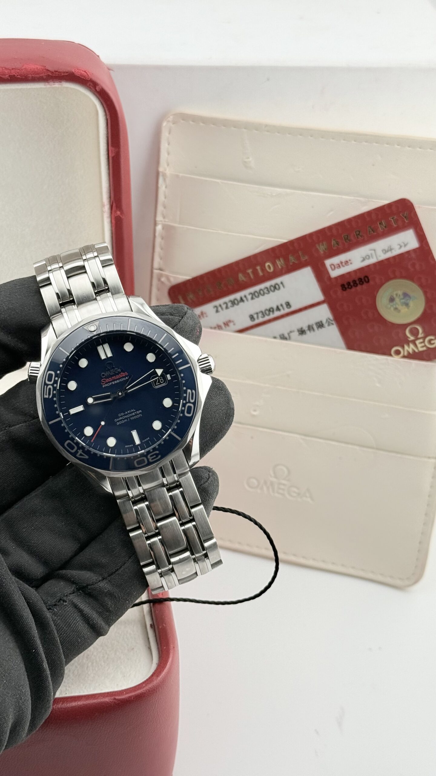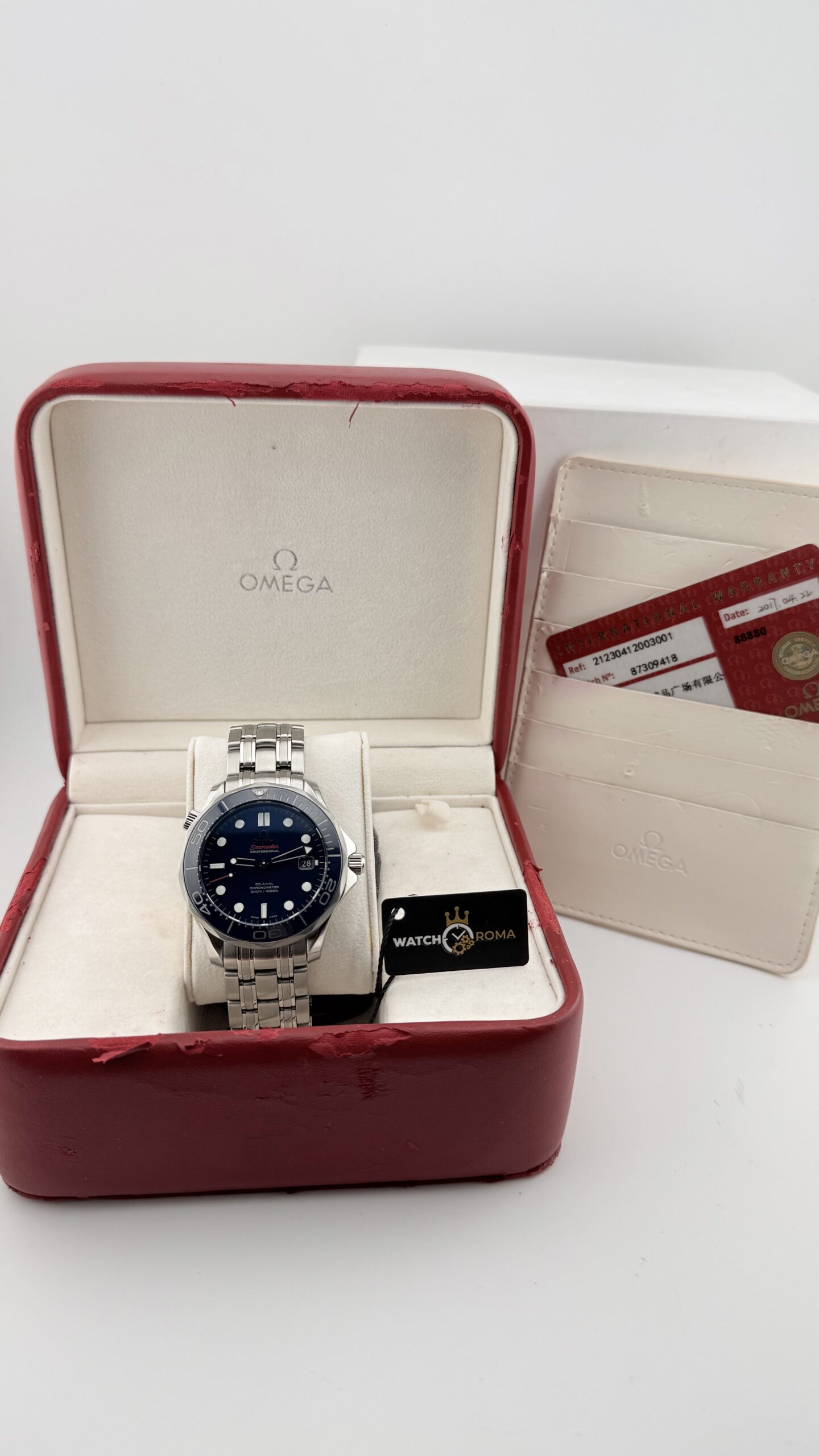 Omega Seamaster Professional 300M Co‑Axial 41 mm – ref. 212.30.41.20.03.001. Un classico moderno dell’orologeria sportiva: robusto, preciso e immediatamente riconoscibile grazie al quadrante blu con motivo a onde, alla lunetta in ceramica e alla valvola dell’elio a ore 10. Nato per il mare, perfetto per l’uso quotidiano grazie al movimento co‑axial e al bracciale in acciaio dal comfort eccezionale.