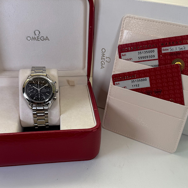 Al suo interno batte il calibro Omega 1152 (base 1152B), con 25 rubini e riserva di carica di 44 ore, che alimenta le funzioni cronografo e data. L’orologio è in ottime condizioni, con lievi segni d’uso e revisione interna effettuata a maggio 2025. Fornito con scatola e documenti originali, è disponibile a Roma.