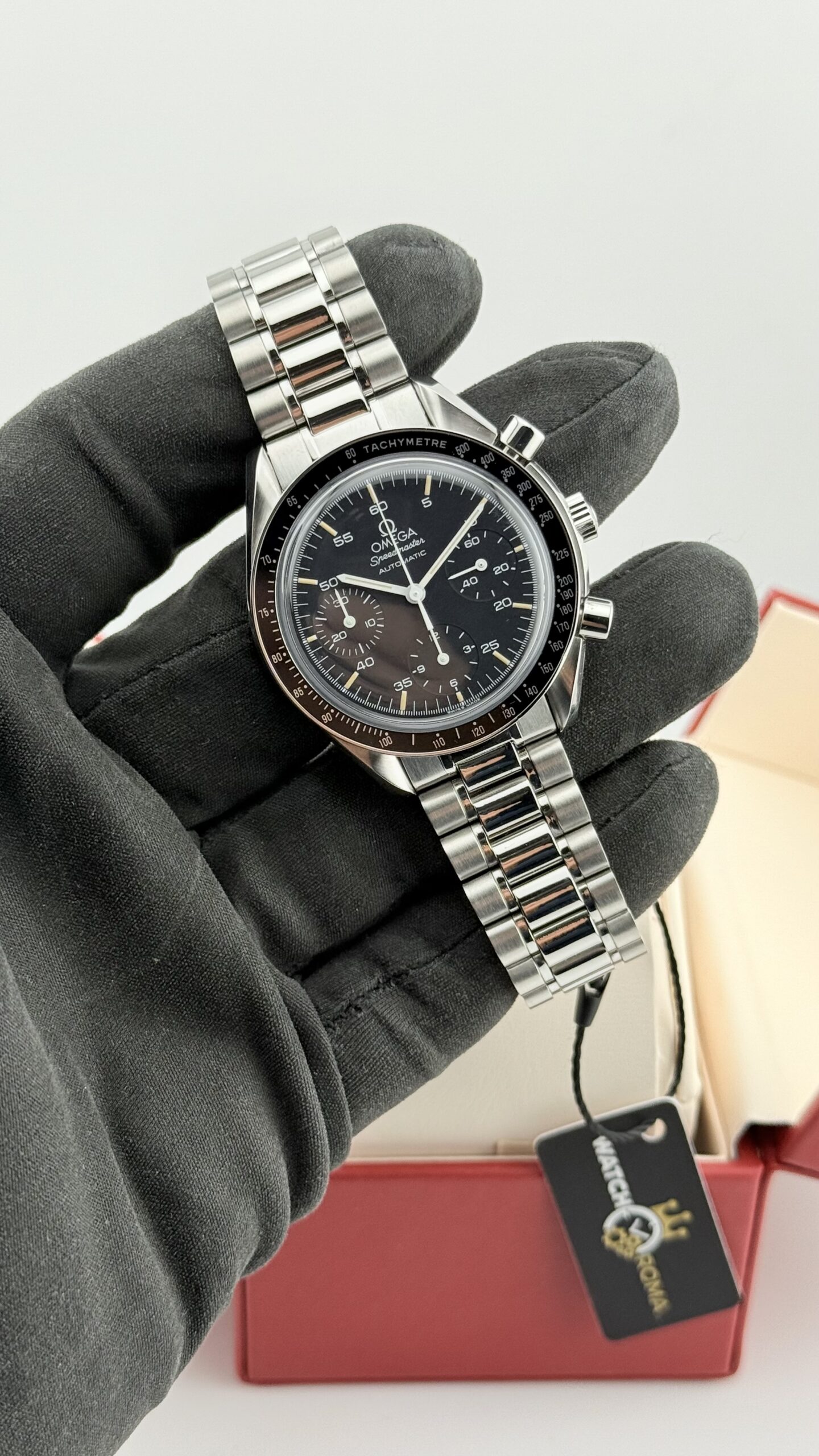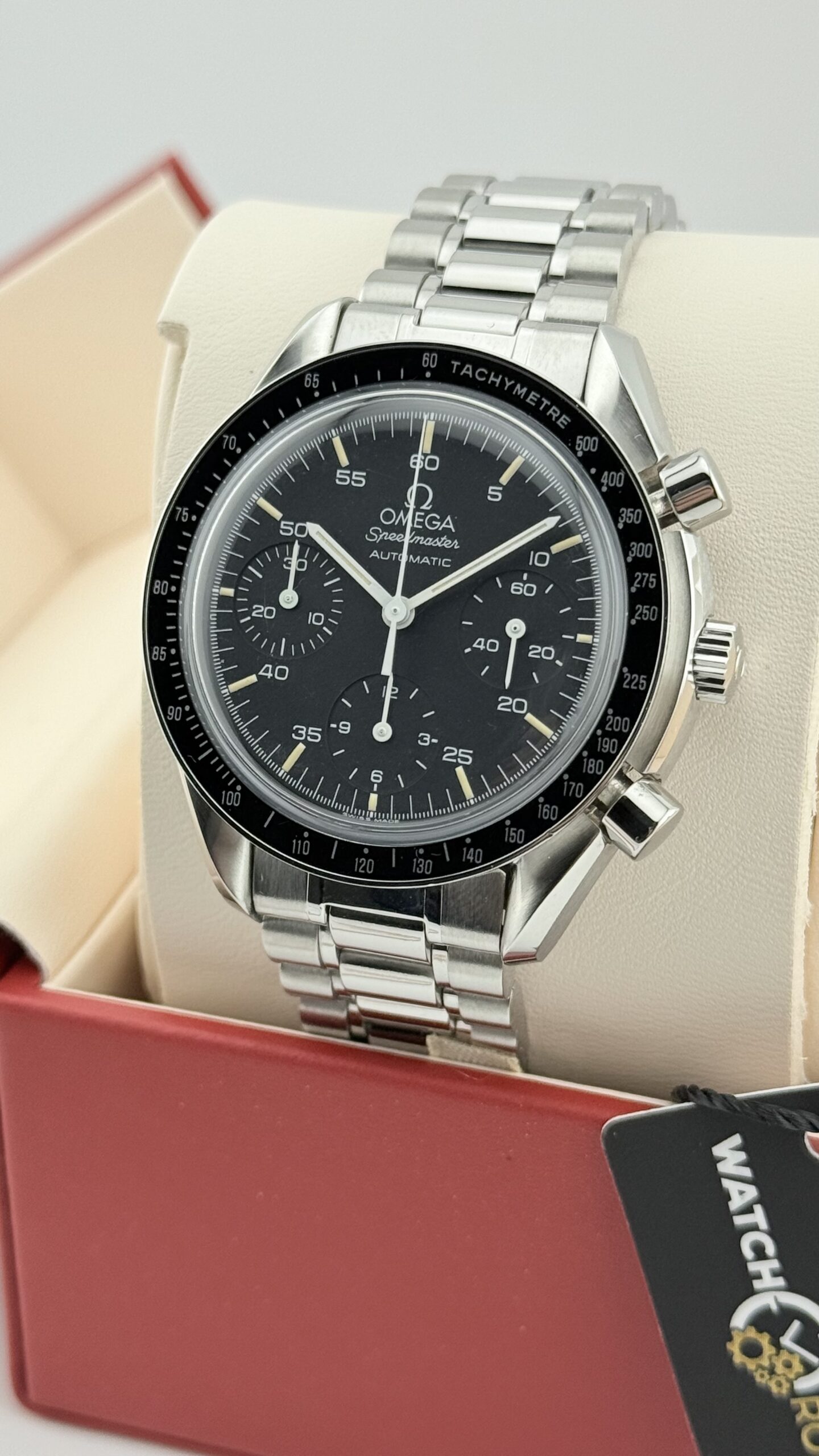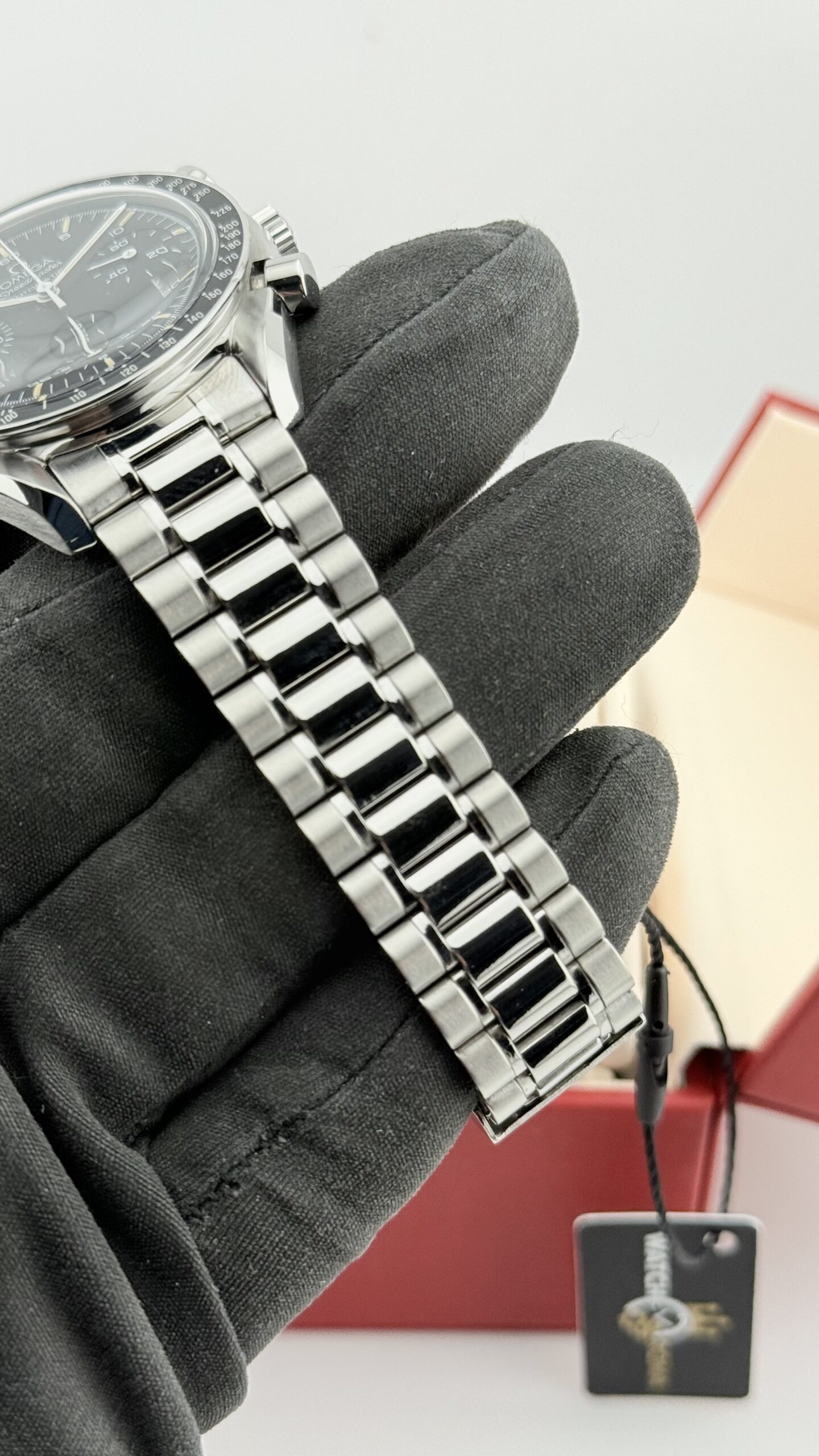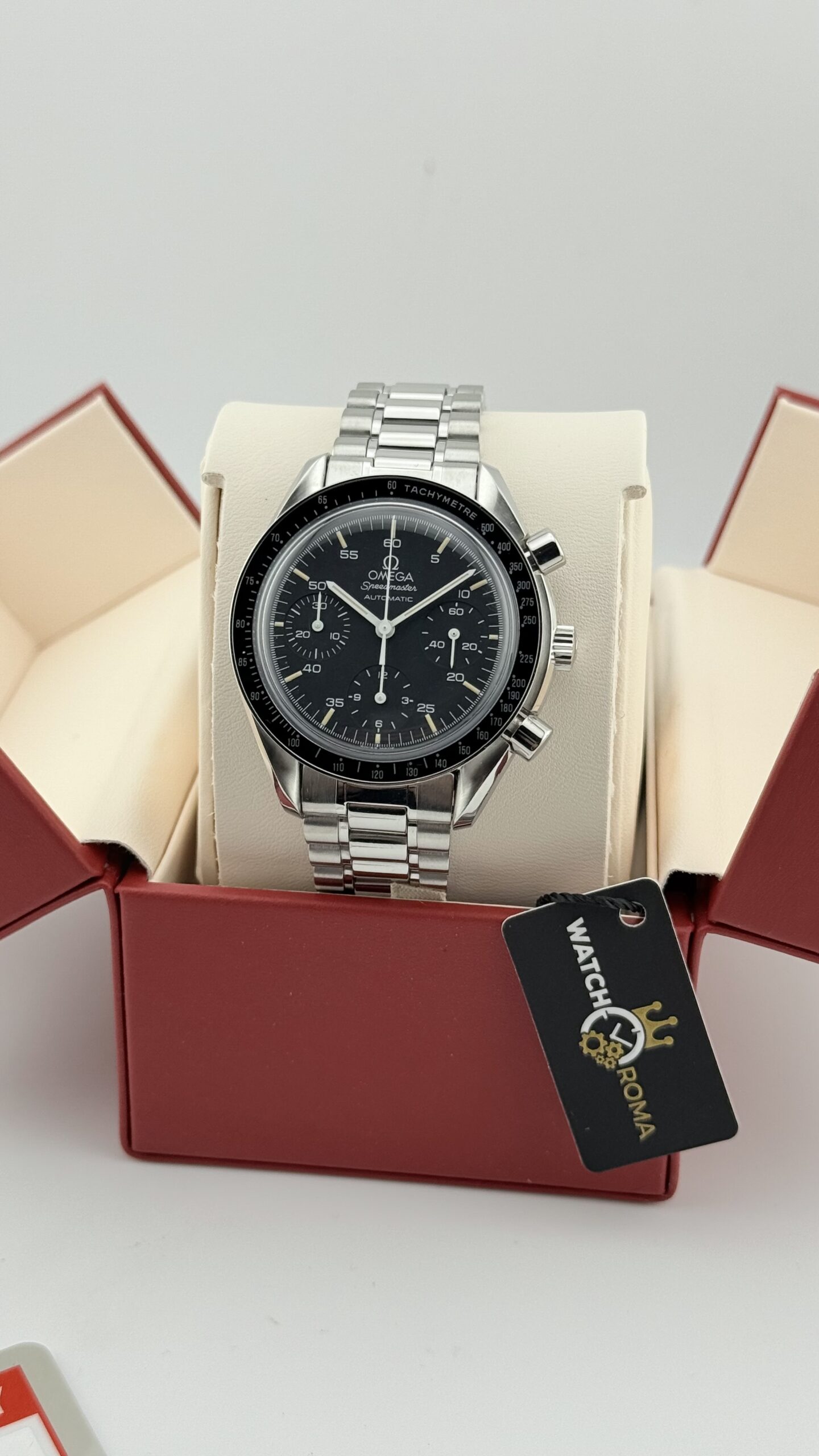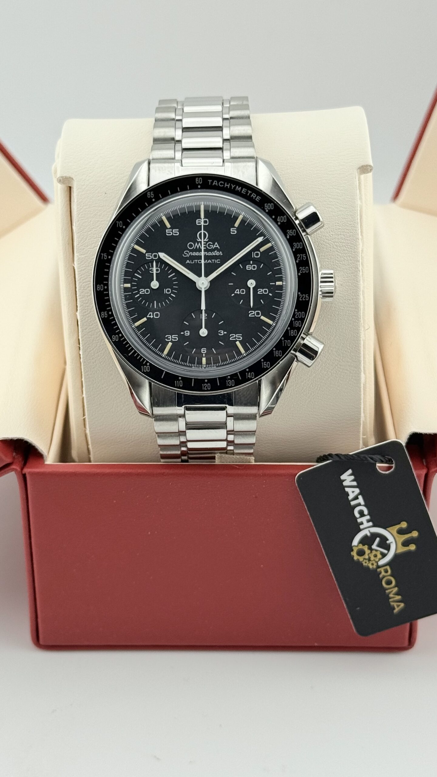 Omega Speedmaster Reduced ref. 3510.50, iconico cronografo automatico da 39 mm, quadrante nero con layout tricompax e lunetta tachimetrica. È la versione “Reduced” dello Speedmaster, più compatta e indossabile, mantenendo il look classico della linea Moonwatch.