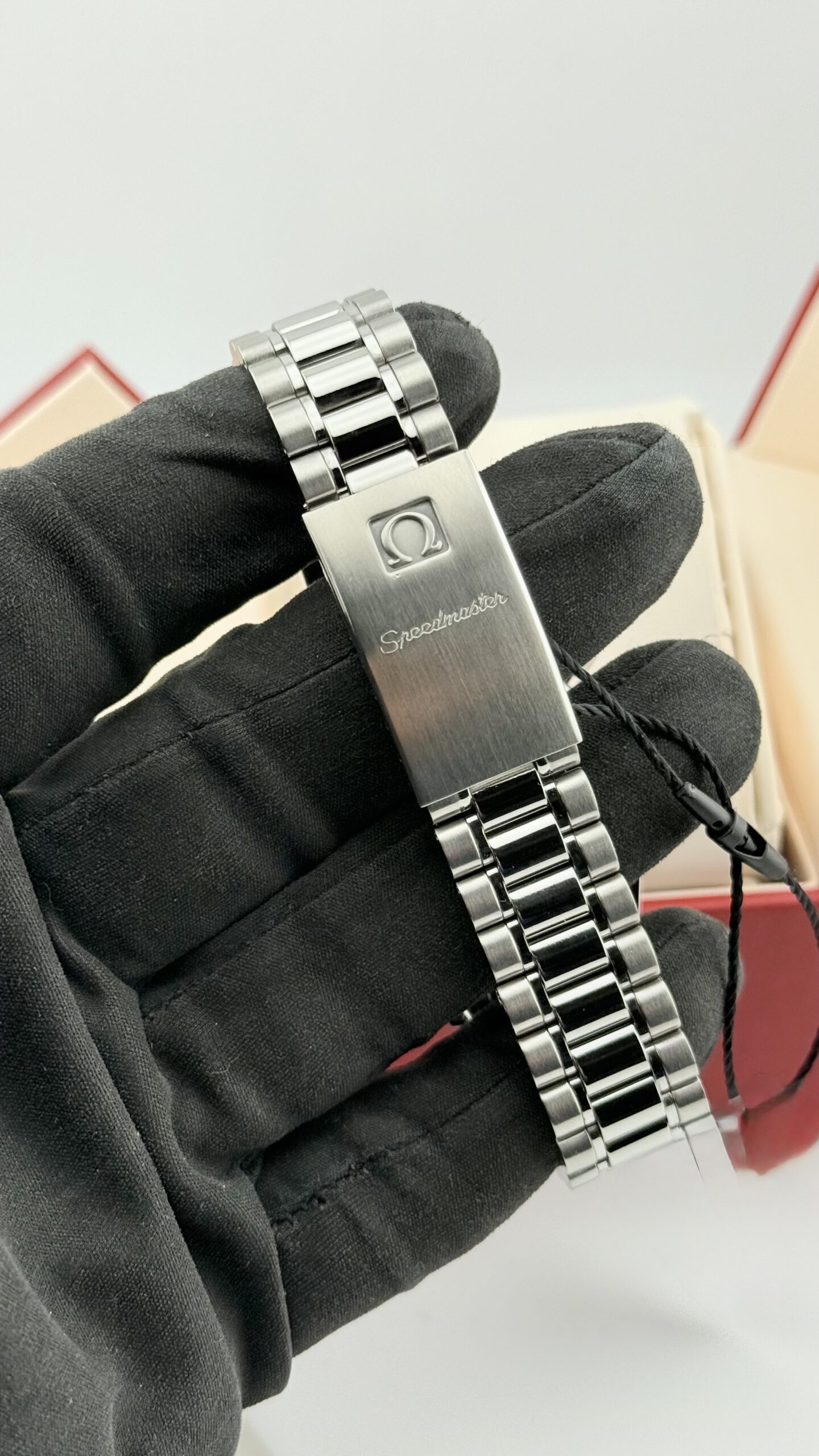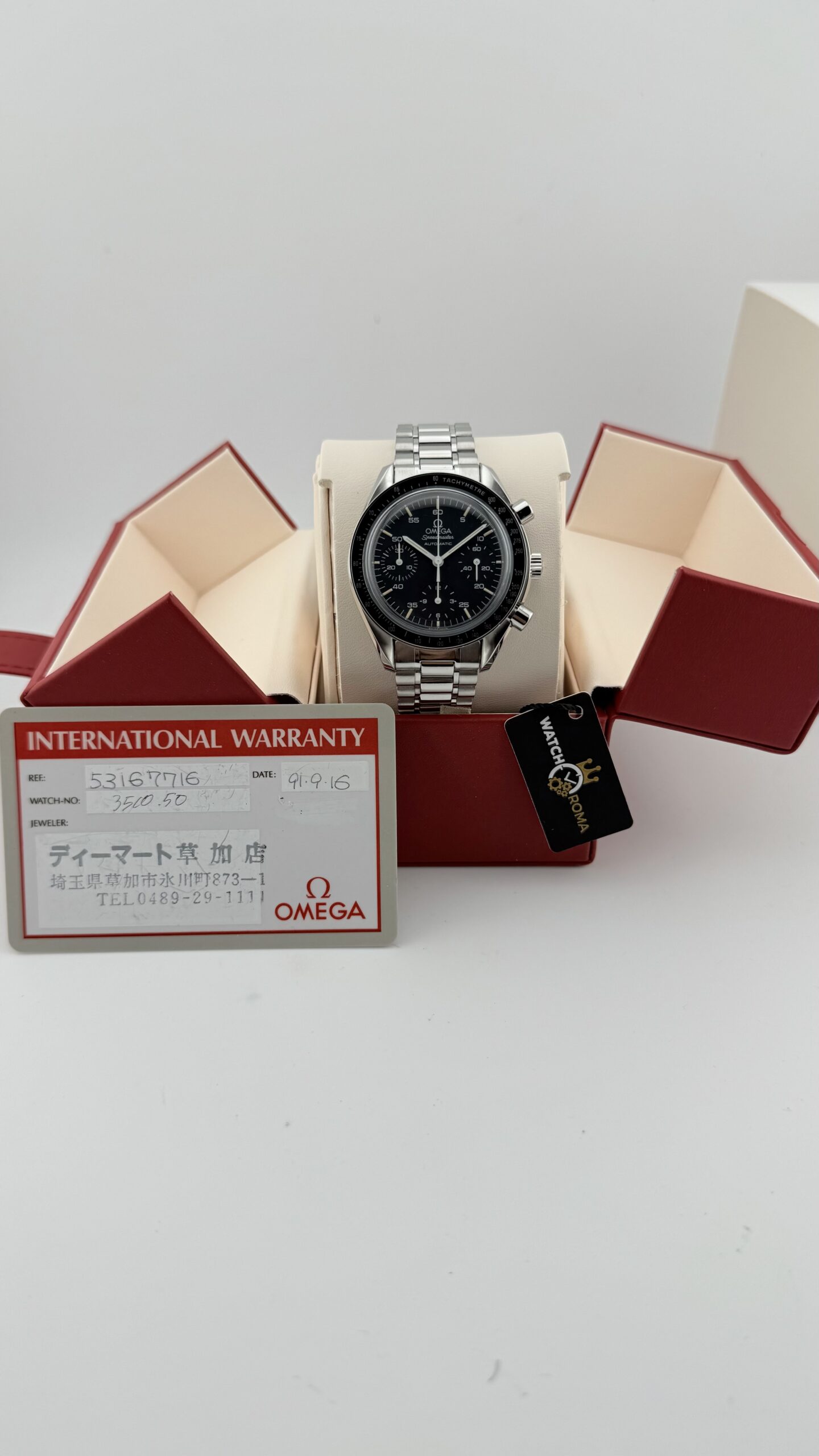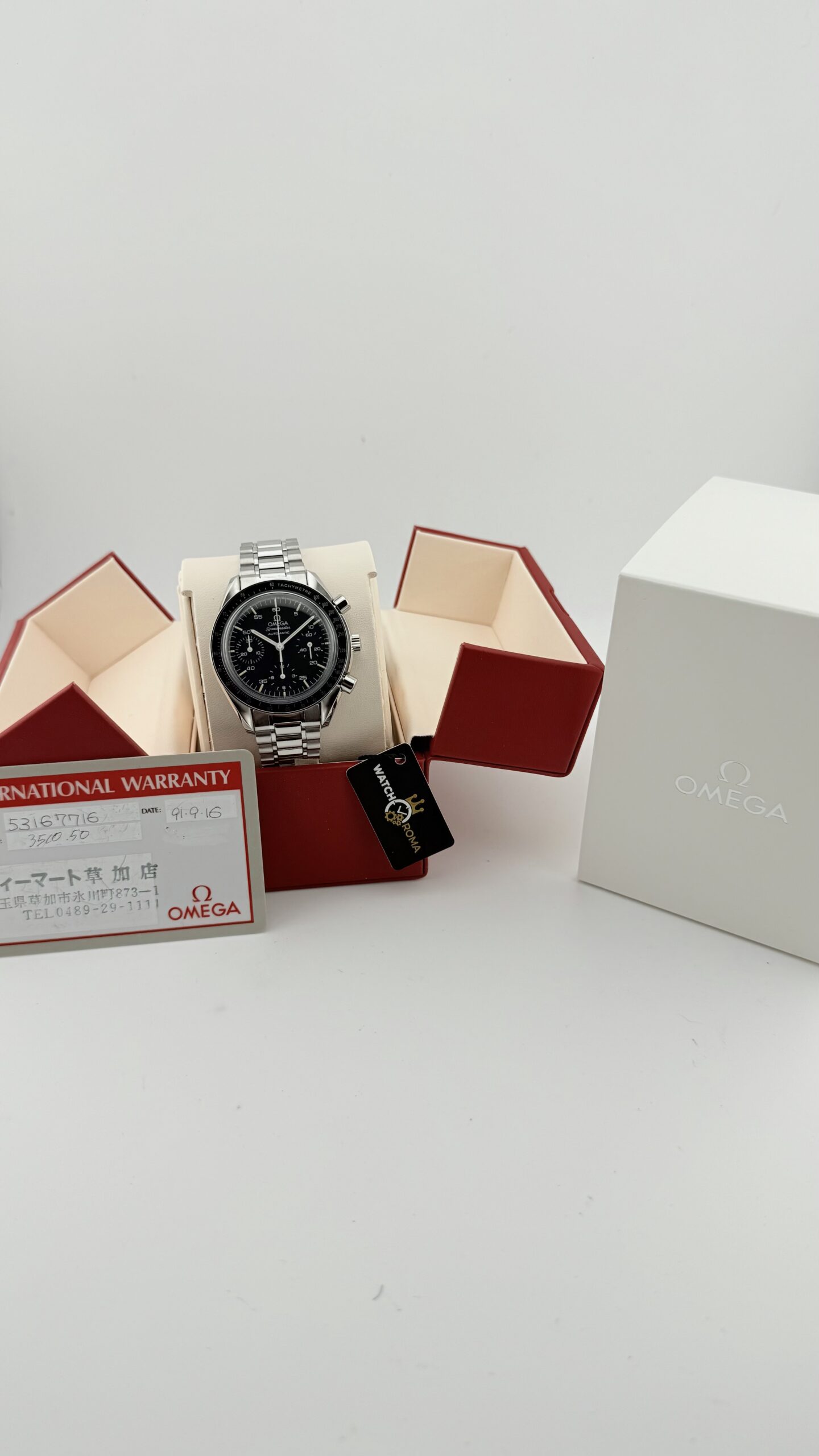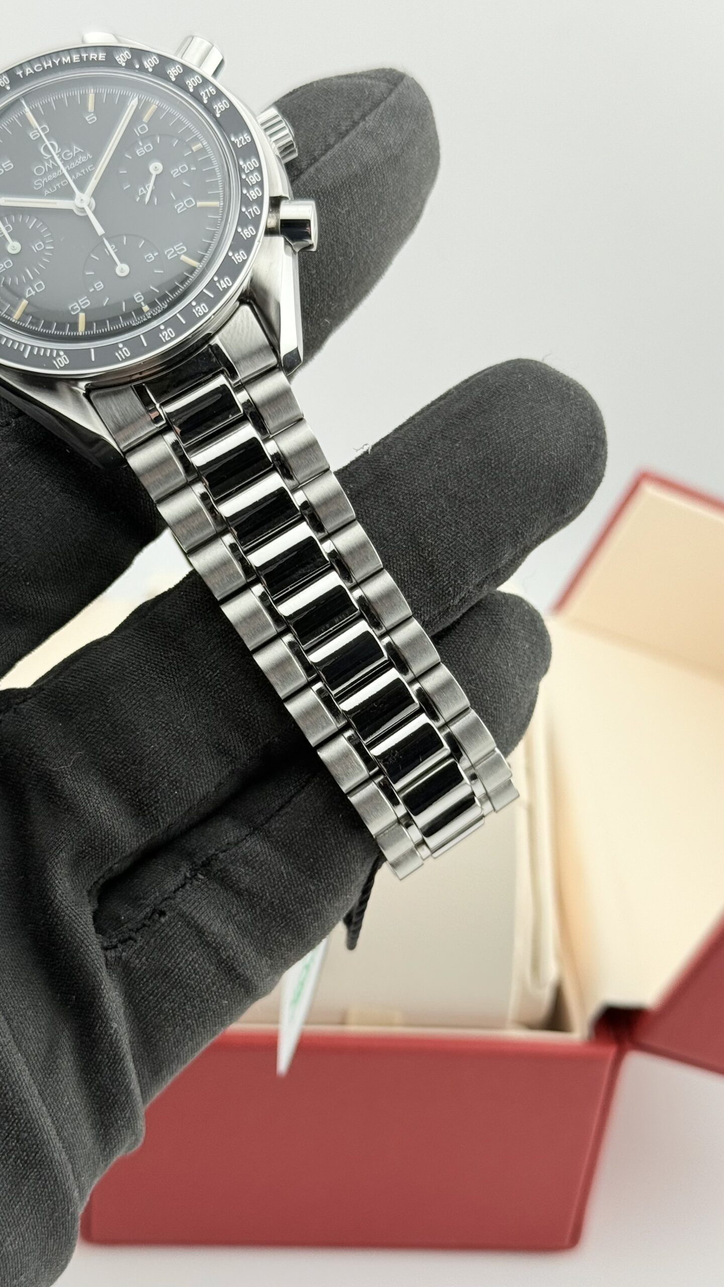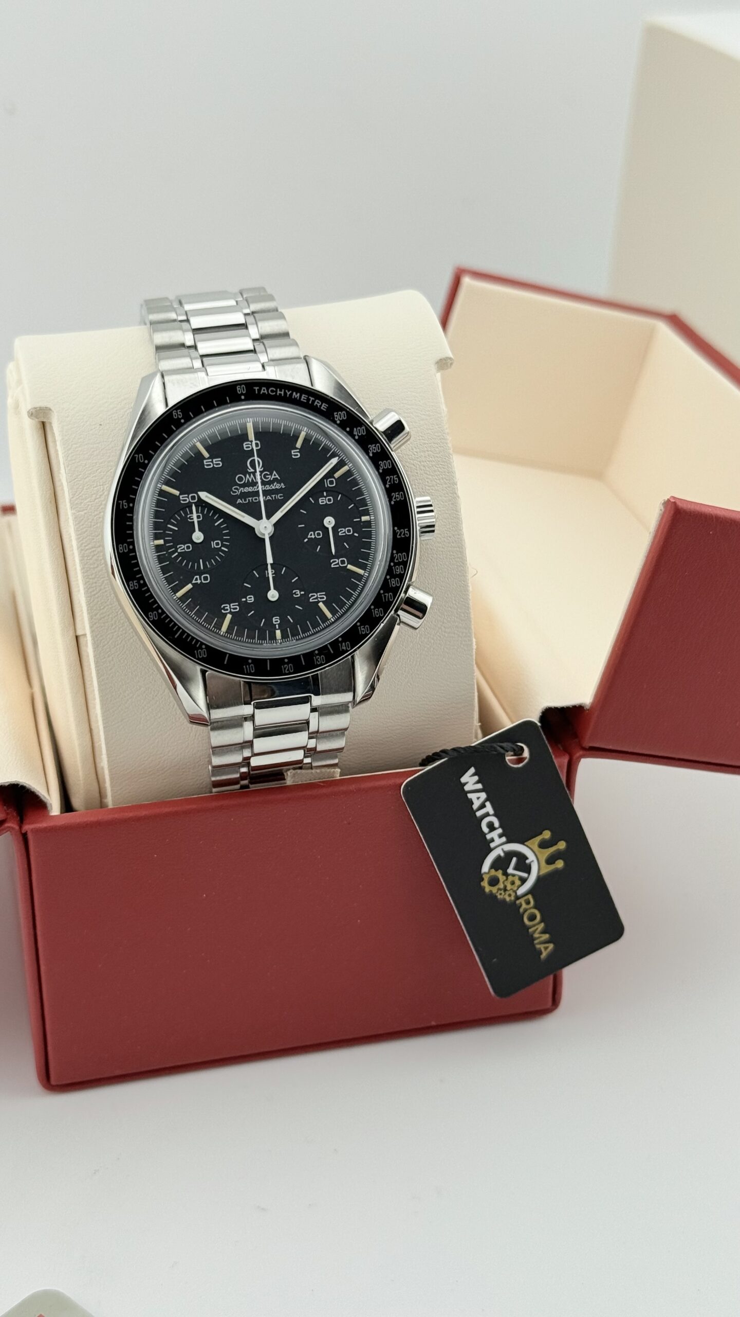 Omega Speedmaster Reduced ref. 3510.50, iconico cronografo automatico da 39 mm, quadrante nero con layout tricompax e lunetta tachimetrica. È la versione “Reduced” dello Speedmaster, più compatta e indossabile, mantenendo il look classico della linea Moonwatch.