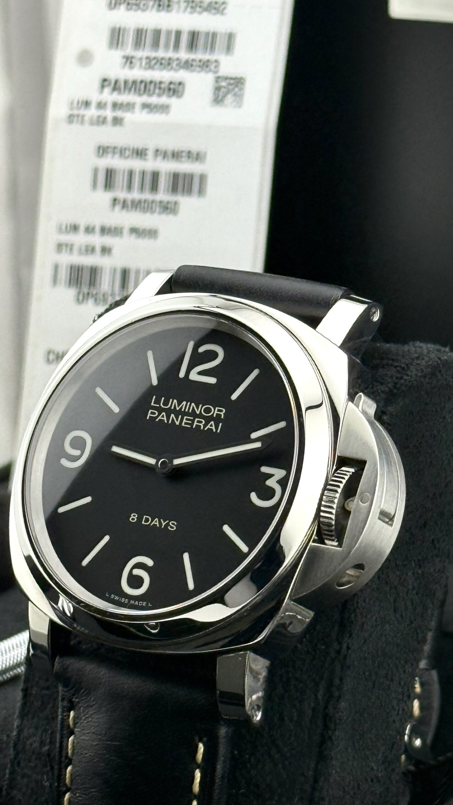 Il Panerai Luminor Base 8 Days (PAM 560) rappresenta l’essenza più pura del DNA Panerai: minimalismo, robustezza e una storia legata indissolubilmente agli incursori della Marina Militare Italiana. Questo modello è amato dai collezionisti per il suo quadrante “Base”, ovvero privo di lancetta dei piccoli secondi e datario, offrendo una pulizia estetica e una simmetria senza pari.