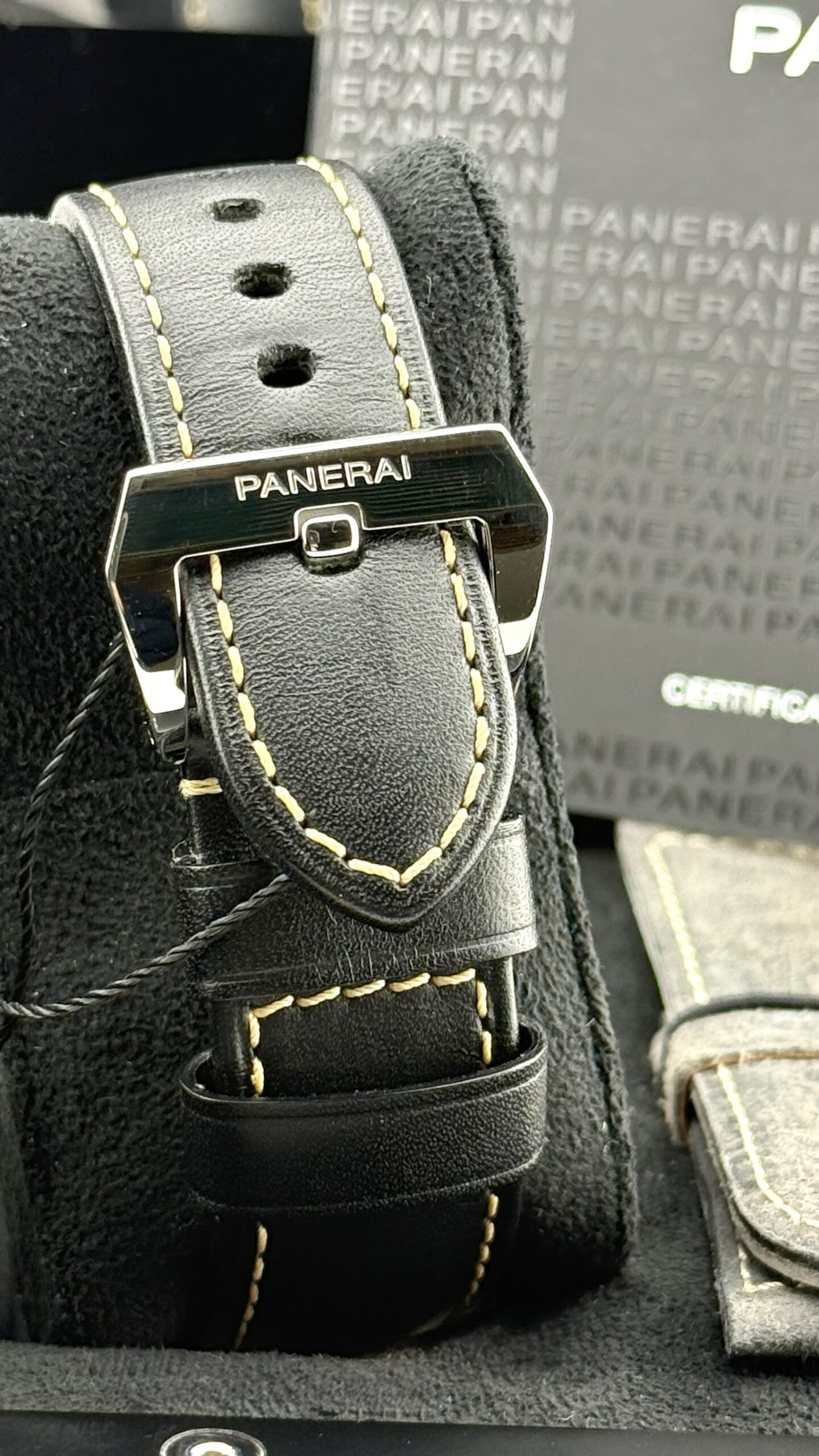 Il design è dominato dalla celebre cassa a cuscino con l’iconico dispositivo proteggi-corona a ponte, che garantisce l’impermeabilità e protegge l’orologio dagli urti. Il quadrante nero presenta la tipica struttura “Sandwich”, dove la sostanza luminescente è posta in uno strato inferiore rispetto alla superficie traforata del quadrante, garantendo una leggibilità eccezionale anche in condizioni di buio totale. Il cuore pulsante è un calibro di manifattura che rende omaggio alla tradizione dei movimenti a lunga carica utilizzati storicamente dal marchio.