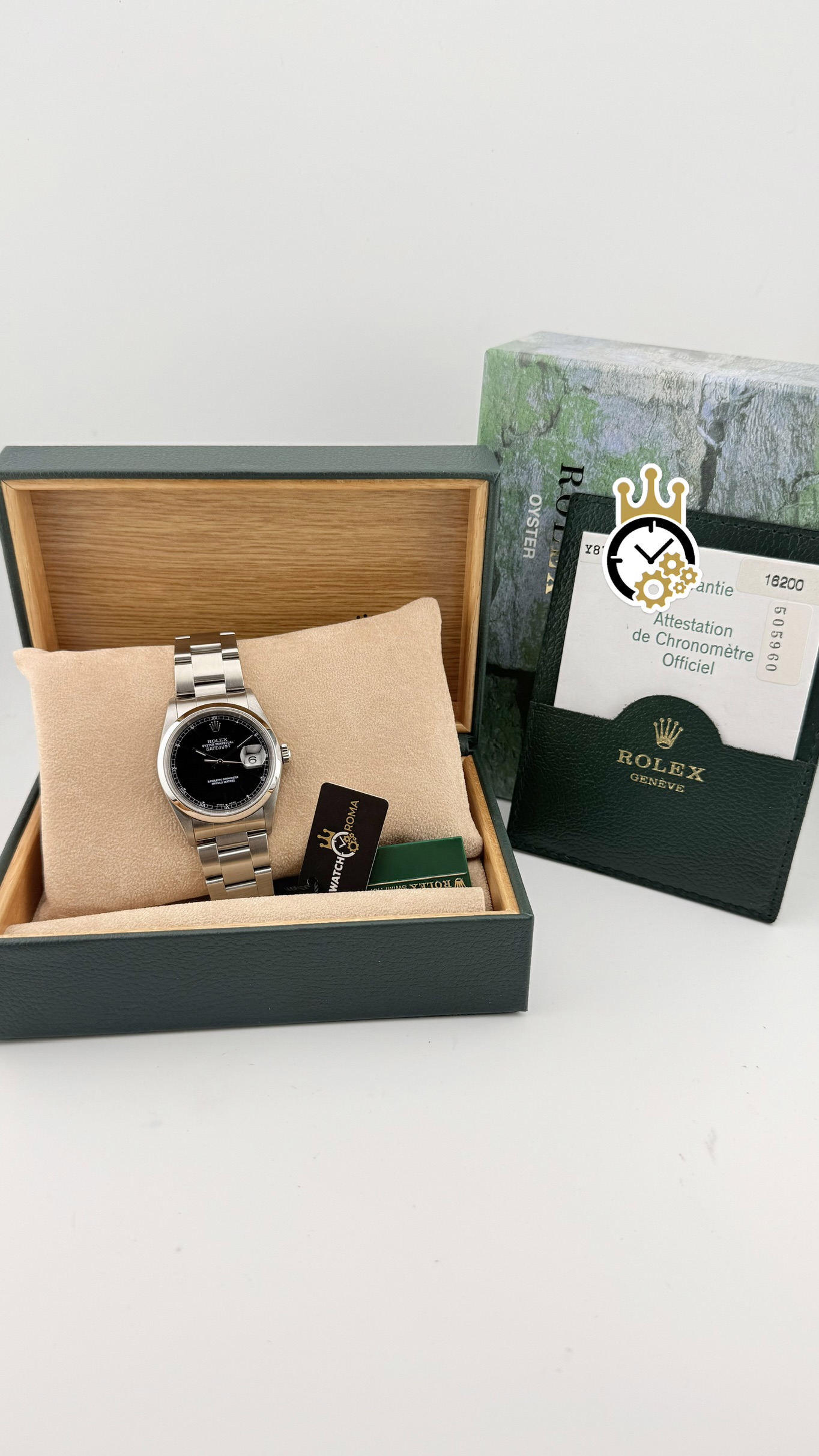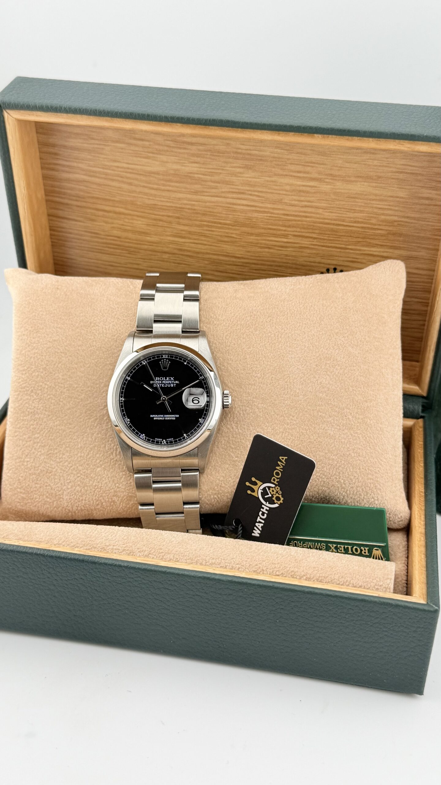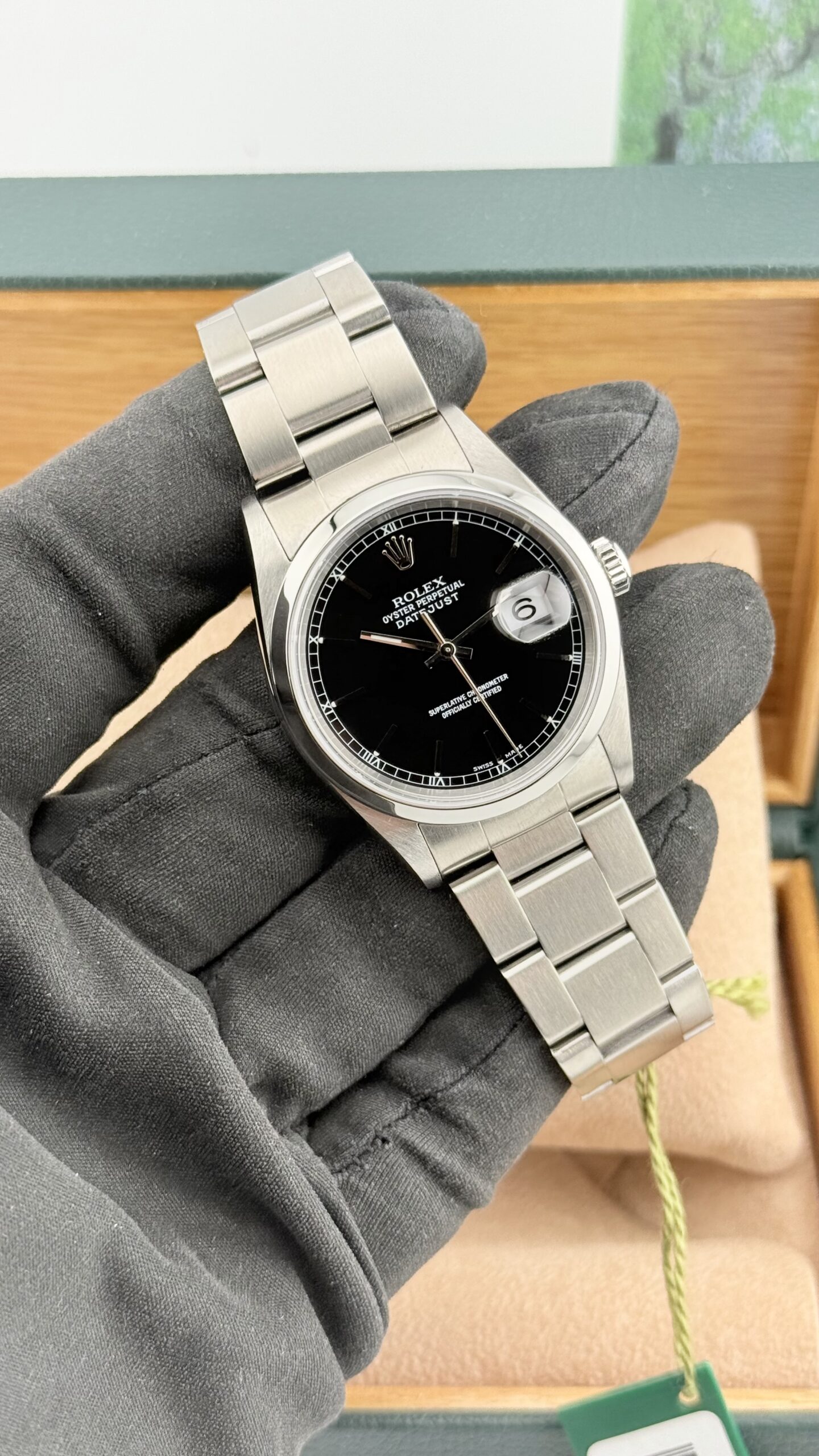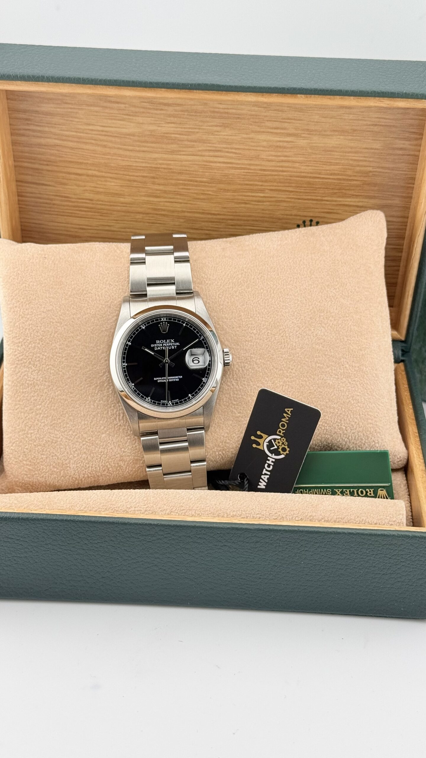 Il quadrante è proposto in nero,ed è protetto da vetro zaffiro con lente Cyclops a ore 3 per una data sempre leggibile. All’interno batte il calibro automatico Rolex 3135, noto per affidabilità, precisione e facilità di manutenzione.il 16200 è un “daily watch” raffinato: sobrio, confortevole al polso e con la versatilità che ha reso il Datejust un’icona senza tempo.