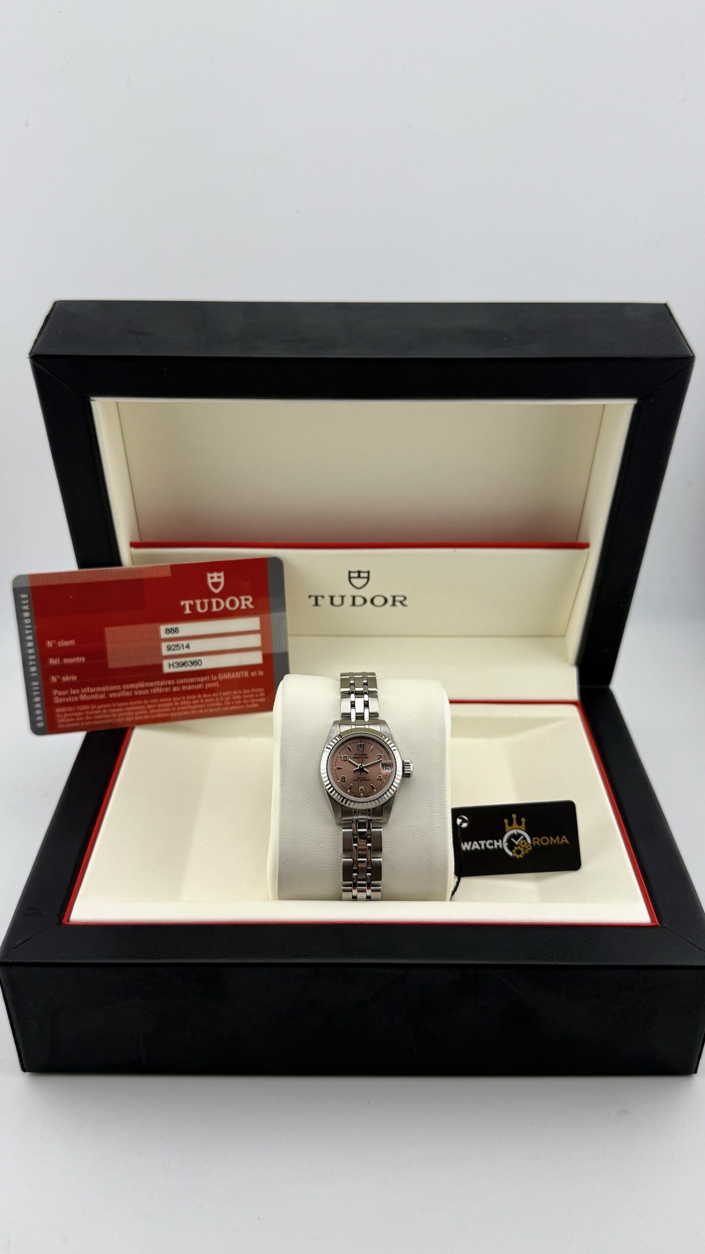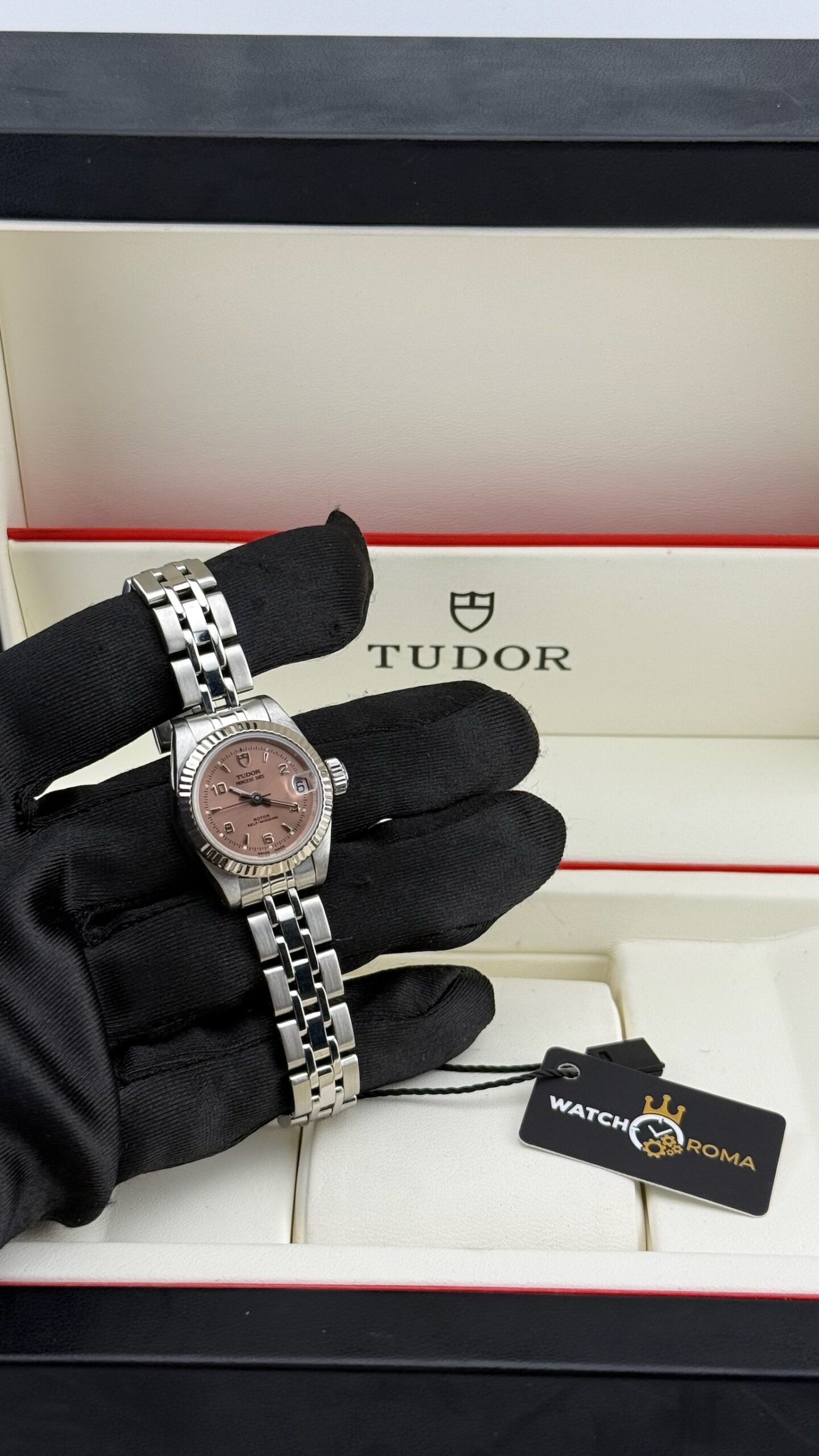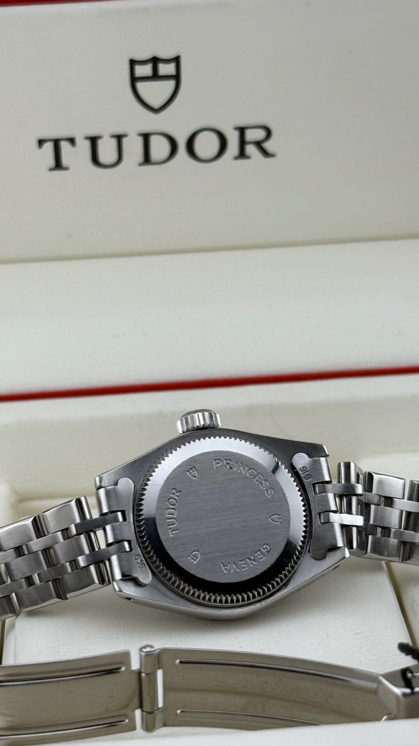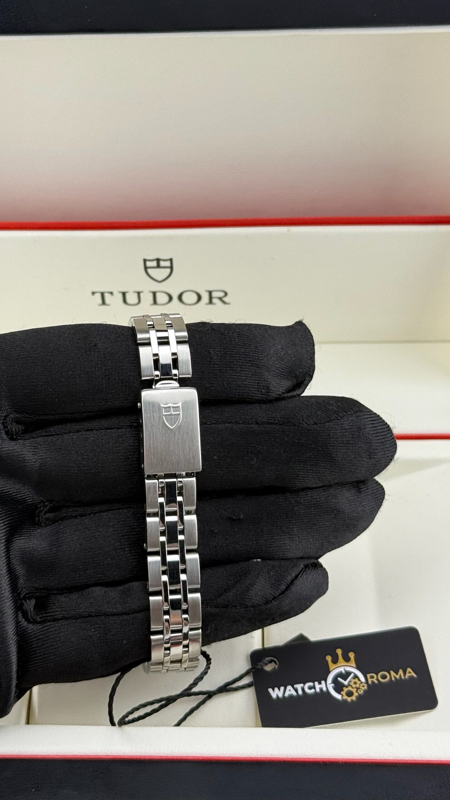 Sotto il profilo tecnico, l’orologio è animato da un movimento meccanico a carica automatica, una scelta di prestigio rispetto ai più comuni movimenti al quarzo presenti in queste dimensioni, sottolineando l’impegno di Tudor nell’alta orologeria meccanica anche per il pubblico femminile. Il datario a ore 3 è sormontato dalla classica lente ciclopica integrata nel vetro zaffiro, garantendo una leggibilità immediata. La corona a vite, firmata con il logo dello scudo, assicura l’impermeabilità della cassa, rendendolo un compagno affidabile anche per l’uso quotidiano.Il bracciale è il celebre modello Jubilee in acciaio, caratterizzato dalle maglie centrali più piccole che offrono una flessibilità e una vestibilità superiori rispetto al modello Oyster sportivo. Questo esemplare si presenta in una condizione collezionistica ottimale, definito come “Full Set”.