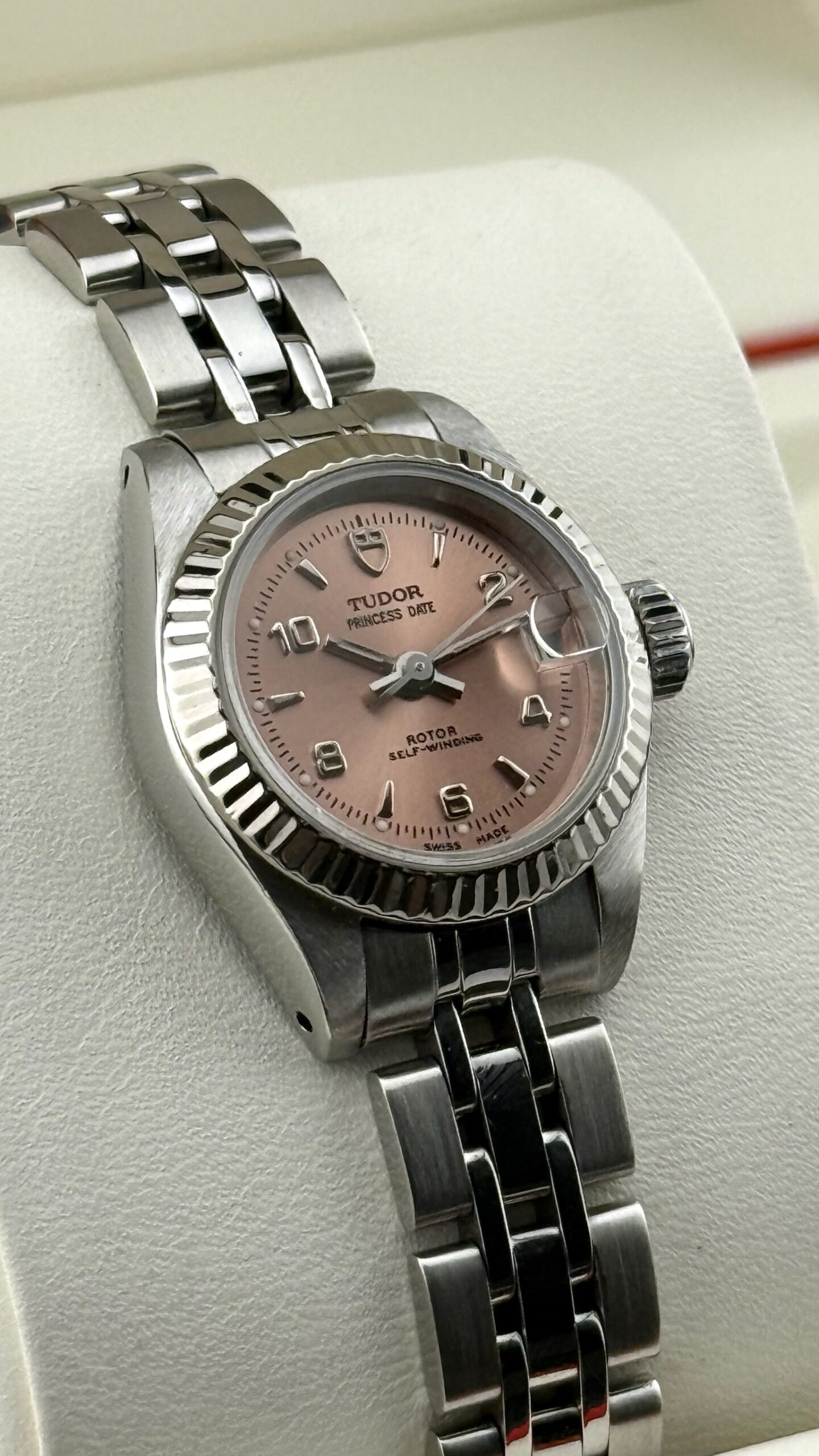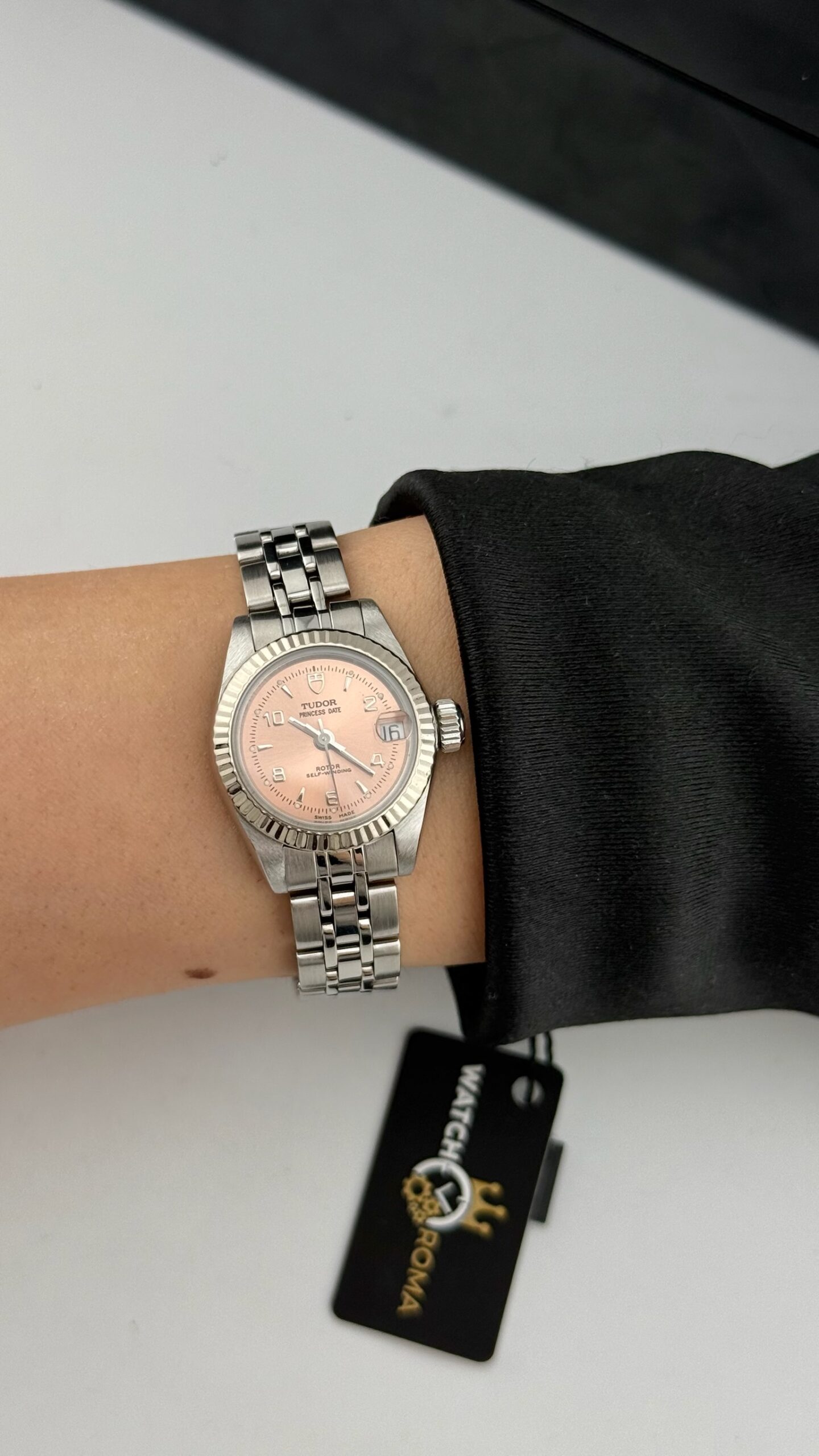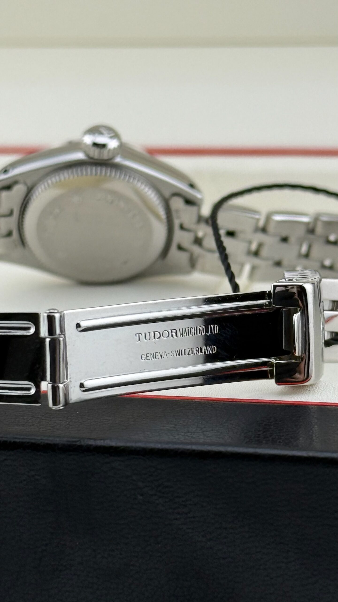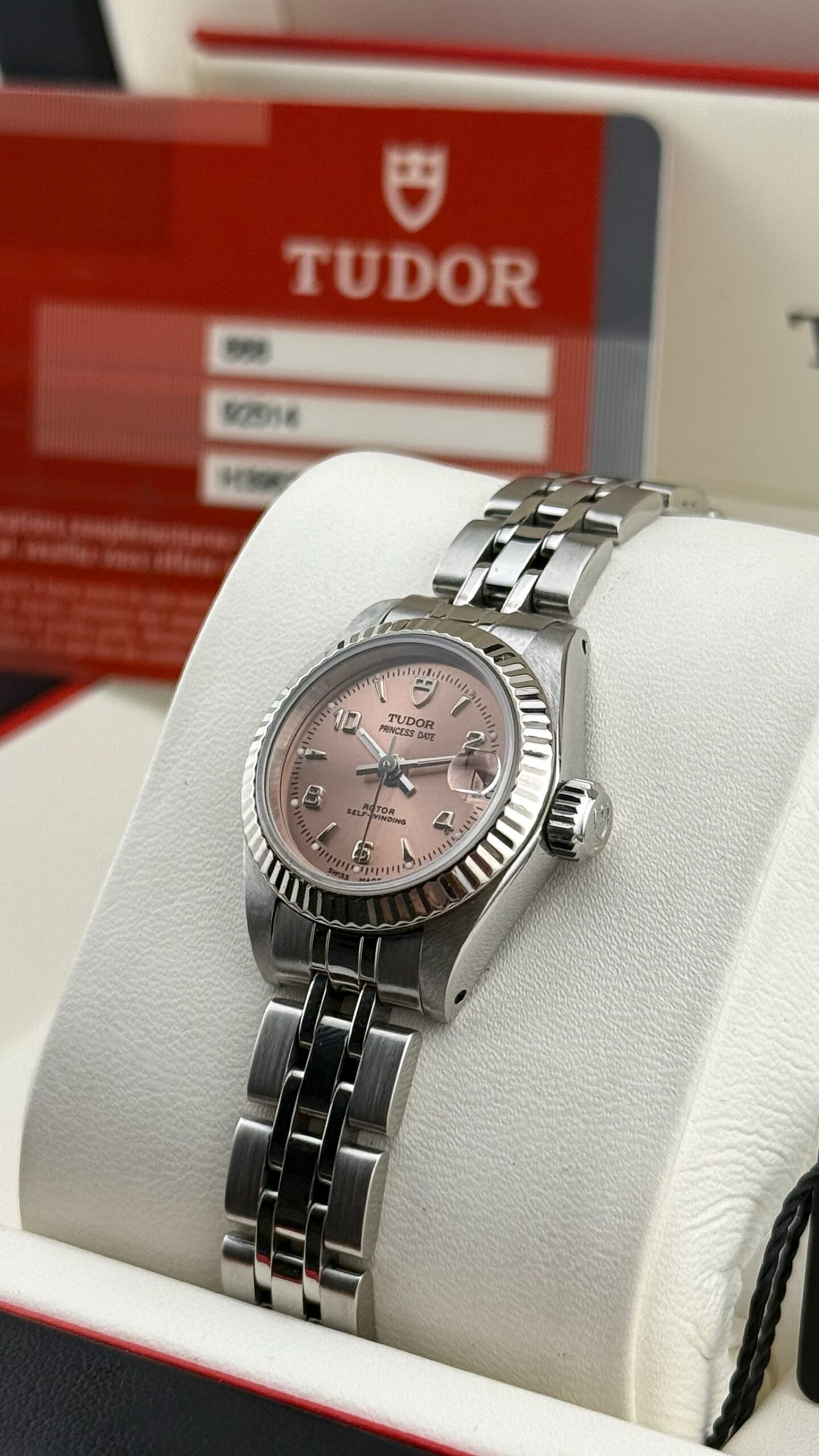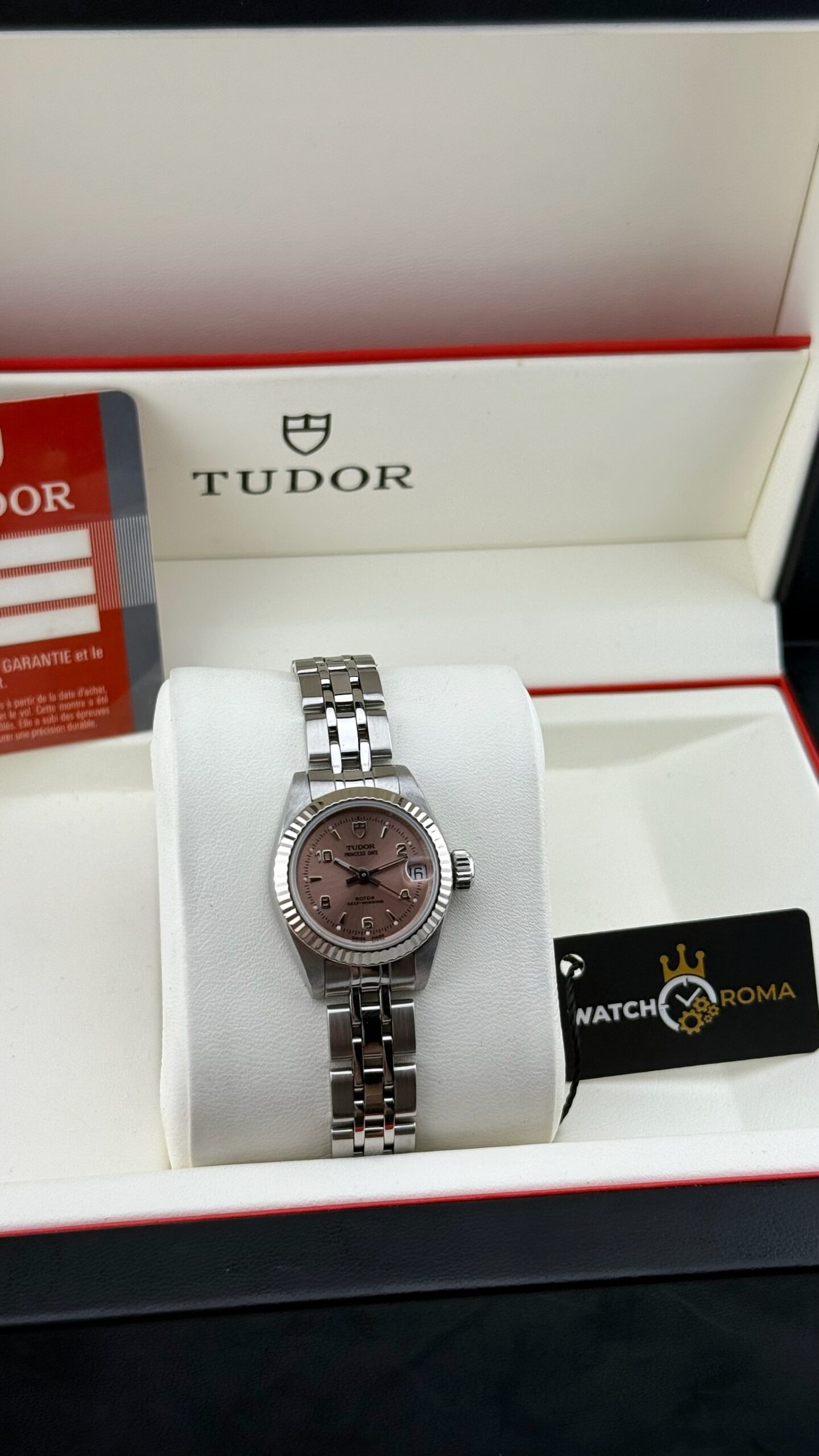 Sotto il profilo tecnico, l’orologio è animato da un movimento meccanico a carica automatica, una scelta di prestigio rispetto ai più comuni movimenti al quarzo presenti in queste dimensioni, sottolineando l’impegno di Tudor nell’alta orologeria meccanica anche per il pubblico femminile. Il datario a ore 3 è sormontato dalla classica lente ciclopica integrata nel vetro zaffiro, garantendo una leggibilità immediata. La corona a vite, firmata con il logo dello scudo, assicura l’impermeabilità della cassa, rendendolo un compagno affidabile anche per l’uso quotidiano.Il bracciale è il celebre modello Jubilee in acciaio, caratterizzato dalle maglie centrali più piccole che offrono una flessibilità e una vestibilità superiori rispetto al modello Oyster sportivo. Questo esemplare si presenta in una condizione collezionistica ottimale, definito come “Full Set”.